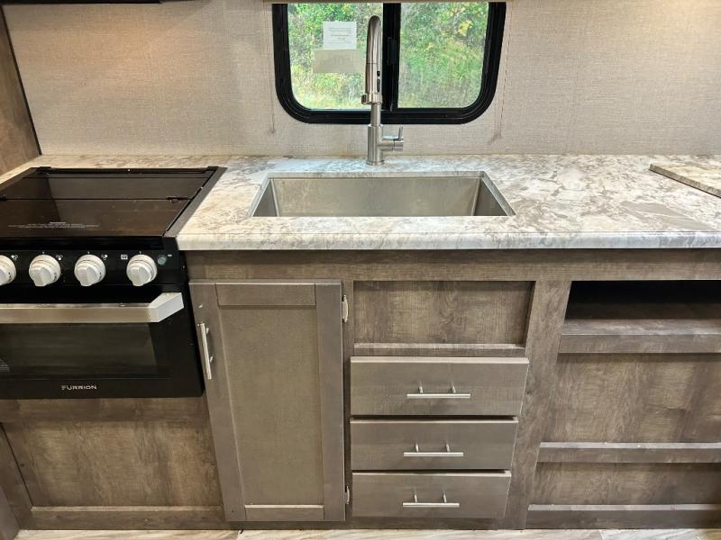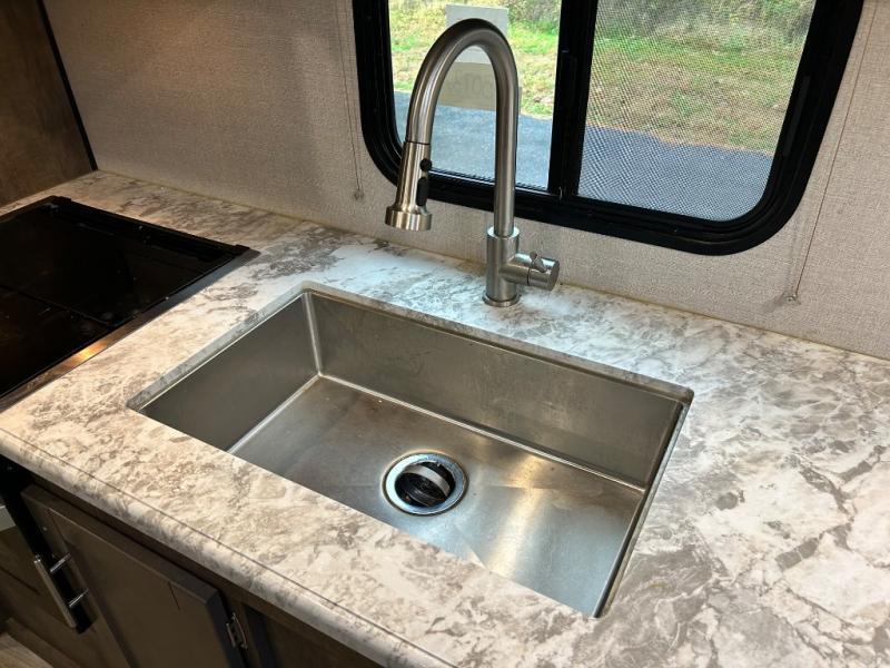 Make memories in comfort and style with this Connect travel trailer! From the king-size bed in the front master suite to the 70" sofa and LED TV in the rear living area, you will have plenty of space to relax and unwind after a long day of traveling. You can even make all of your meals in the fully functional kitchen that comes with a three-burner range, a 22" oven, a stainless steel microwave, and a residential faucet with a spring sprayer in the undermount sink. Plus, there is a kitchen skylight so that you can clearly see everything that you make, and if this still isn't enough sunlight for you, you can take your preparations outside where you can cook at the outdoor kitchen.