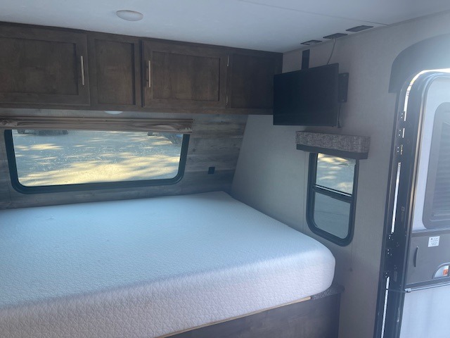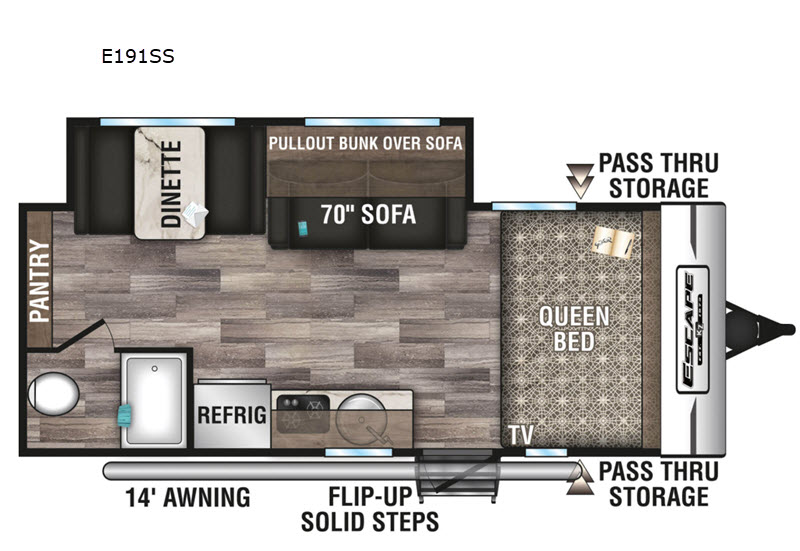 This Escape travel trailer is packed with plenty of amenities and features that will make every trip comfortable and relaxing. With the booth dinette, a pull-out bunk over a 70" sofa, and a queen-size bed, this unit has the ability to sleep six people, which is very handy when your kids decide to invite a friend. You will also appreciate the rear corner bathroom and full kitchen because they allow you to camp out without having to plan around public restrooms and restaurants. Plus, with the LED lighting throughout, you will be able to see clearly whether day or night!