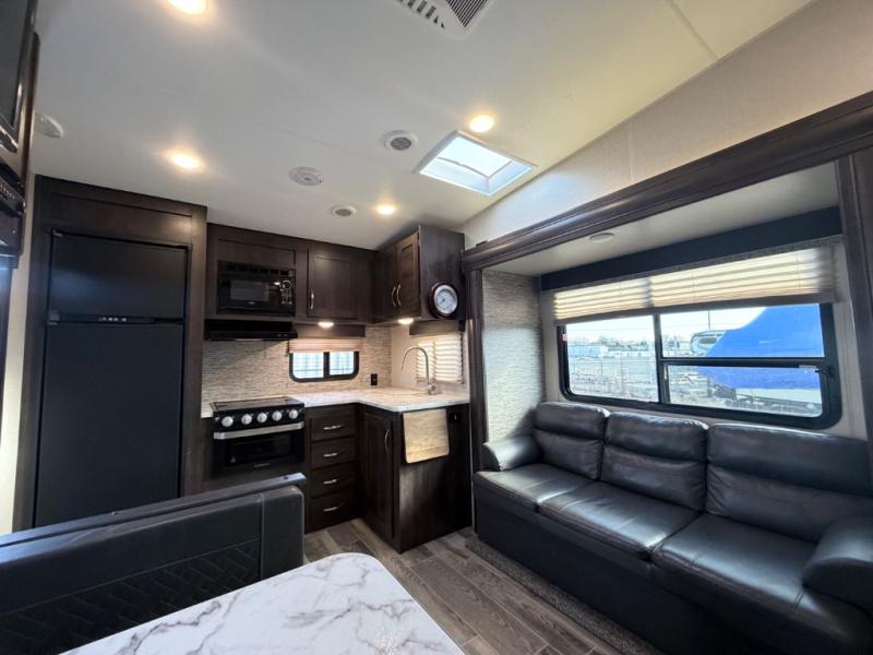 Keep your travels at a high level of fun with this Sportsmen fifth wheel! You will be able to get your luggage stored away easily in the pass-through storage before heading inside and filling the linen closet, the bedside wardrobes, and the 8 cubic foot refrigerator. Once you make it to the campground, easily set up the single slide out into place so that you can sit back and relax on the 64" jackknife sofa while you watch the LED TV.