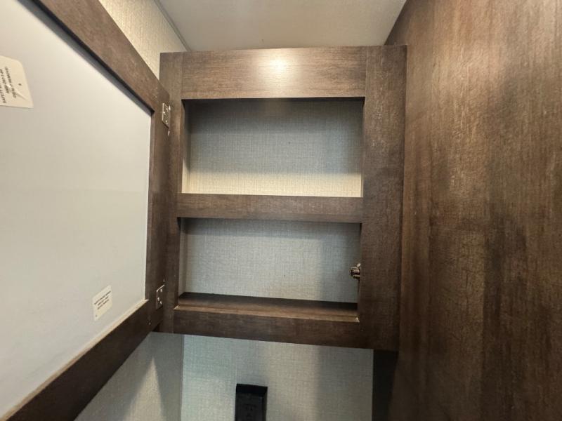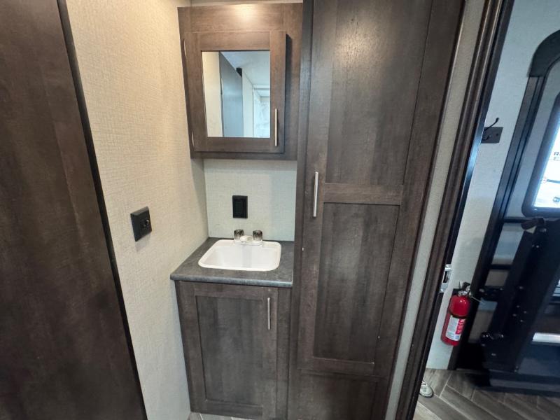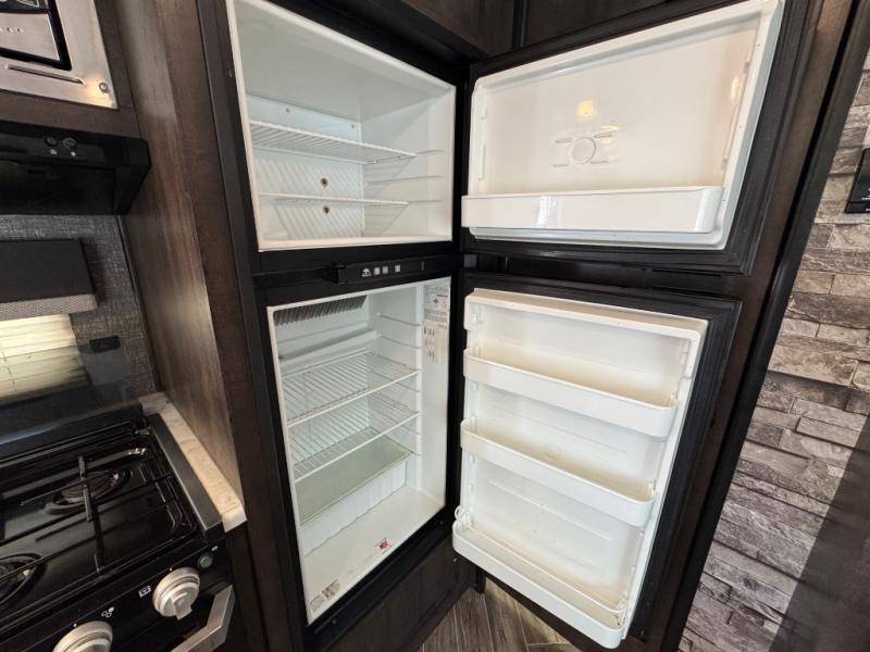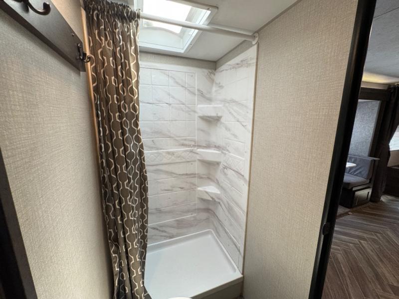 One step inside this toy hauler and you won't want to go home. The 11' separate garage has its own exterior entry door which is super convenient and the two 72" roll-over sofas will be perfect sleeping space for your guests. There is even a TV mount here if you want to add a TV and an optional screen door to allow in fresh air. This model features a walk-through bath with a shower skylight for extra standing room and natural light and the kitchen includes everything you need to prepare meals each day. The 80" U-shaped dinette within the slide out provides a place to enjoy dinner at together and the kids can convert this area to sleeping space at night while you and your spouse enjoy the front king bed!
