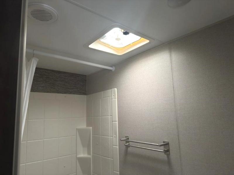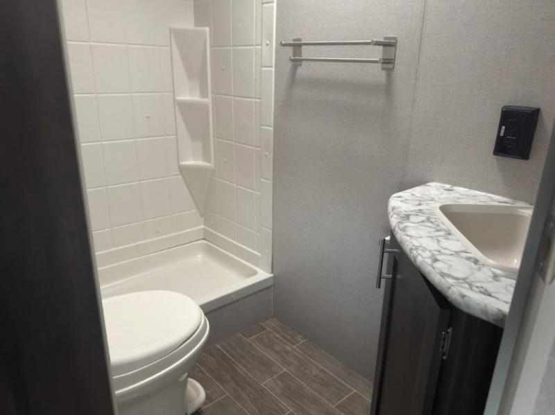 You will find lots of storage throughout the inside, and outside in the pass-through compartment for the larger camp gear and the storage door under the bunks in the rear. So load up and head out for a weekend of outdoor adventure. Once you have arrived you can quickly set up the 14' power awning and hit the trails, the lake, or relax. Inside someone can make lunch or dinner using the drop-in cooktop with glass cover and oven or the microwave, and store leftovers in the 10 cu. ft. refrigerator. When it's time to go to sleep, the kids will love their double-size bunks, you will love your queen bed and your friends can sleep on the furniture.