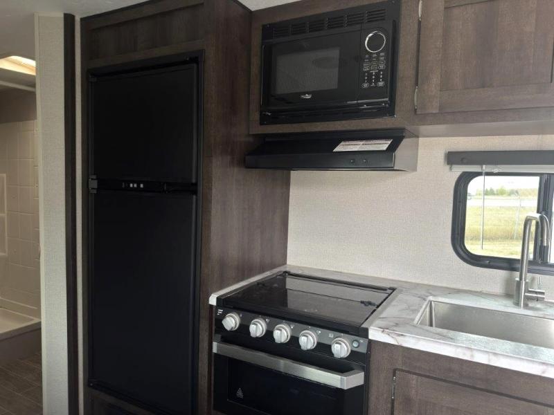 The Sportsmen SE travel trailer by KZ offers residential-grade linoleum for easy clean up, a stainless steel residential kitchen faucet and deep undermount stainless steel kitchen sink, color accented shower walls as a nice touch, dark accent trim on corners/entry doors, and lots of storage for your clothing, dishes, and such. The exterior gives you a one-piece, seamless, walk-on Tufflex roofing material, fully walk-on roof decking, an aerodynamic front profile with smooth metal front, three-toned exterior metal, and has been prepped for solar power and a backup camera. Start saving money and enjoy camping, choose the trailer that fits your wants and needs!