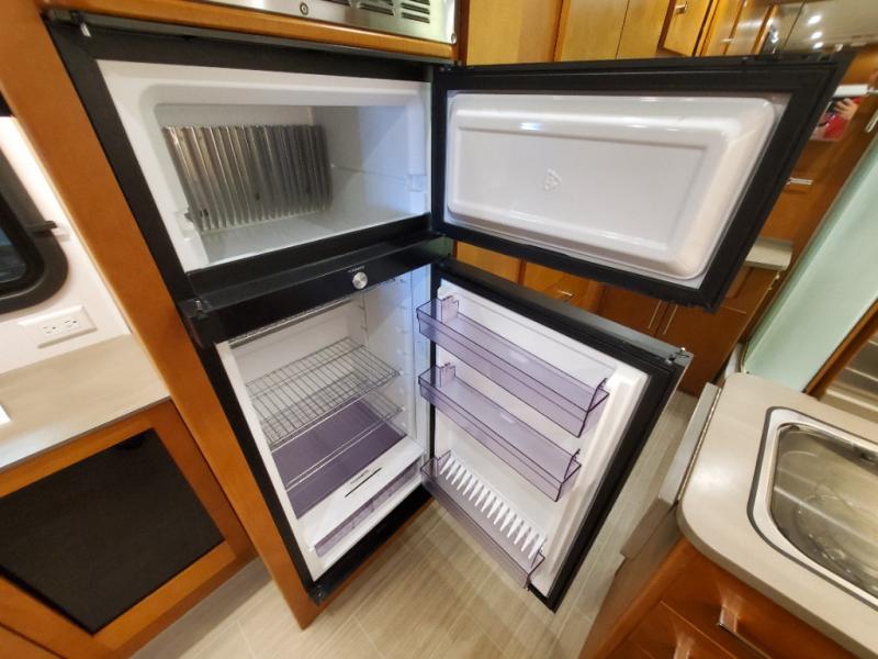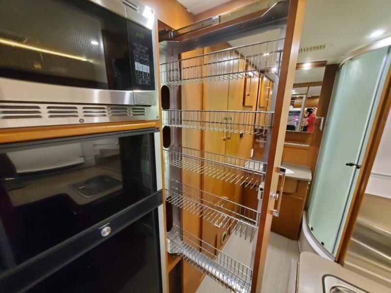 With a large residential-style bathroom in this motorhome, you will enjoy every moment you spend cleaning up in the radius shower and the skylight above will deliver more height and extra sunshine to illuminate the entire space. During the day you can host friends and family with the swivel cab chairs and standard Leisure Lounge or choose to add the optional Leisure Lounge Plus. Once the party has ended, you can rest peacefully for the evening after you've turned down the Murphy bed. The next morning you might decide to make breakfast on the cooktop or in the convection microwave, and serve from the flip-up counter extension or on the Corian solid surface countertops.