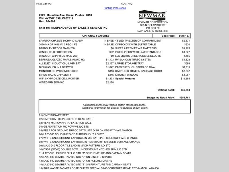 Used 2020 Newmar Mountain Aire 4018 Motor Home Class A - Diesel