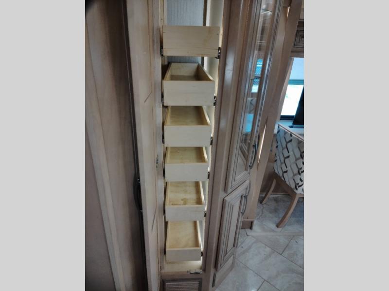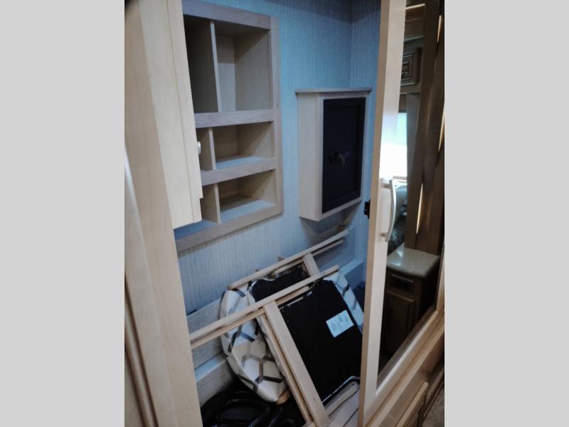 Let the journey be just as fun as the destination, if not better, with this New Aire Class A diesel motorhome. The wireless charging mats built into the dash and passenger console allow someone to catch up on some work while the other drives, and the WiFiRanger Skypro Pack keeps you connected wherever the road takes you. Once you've reached your destination, prepare a quick lunch in the 30" convection microwave before heading outdoors for a walk around the campground. When you come back, you can easily clean up in the full bath that includes a fold-down shower seat for your comfort. The kids will love the Fold-N-Tumble sofa with ottomans to kick their feet up, and the buffet dinette with chairs will be a perfect spot to enjoy meals together and play a game of cards in the evening. This unit also features a rear private bedroom with a king bed slide and a large wardrobe with sliding mirror doors.