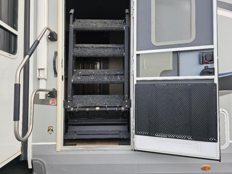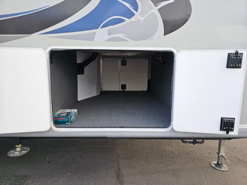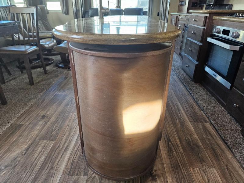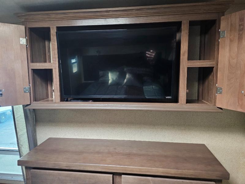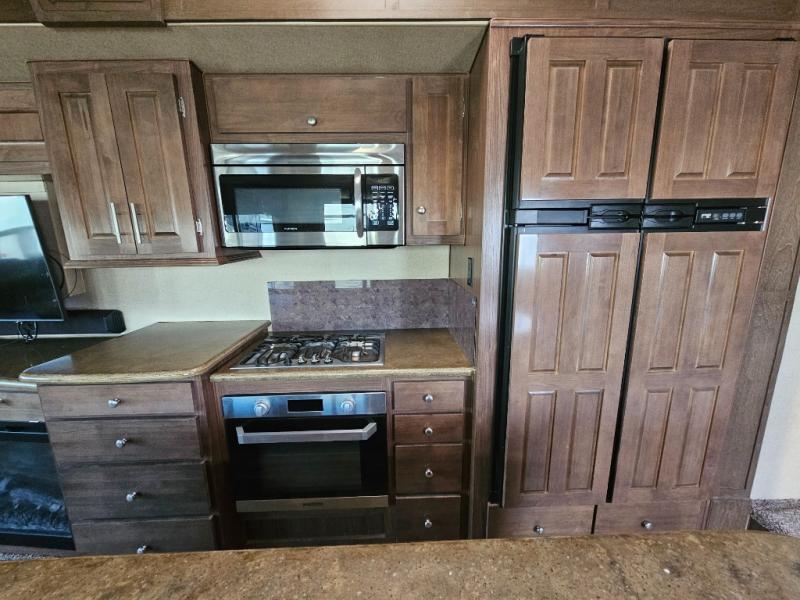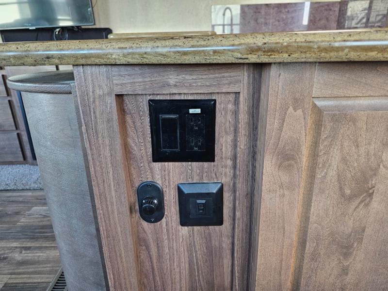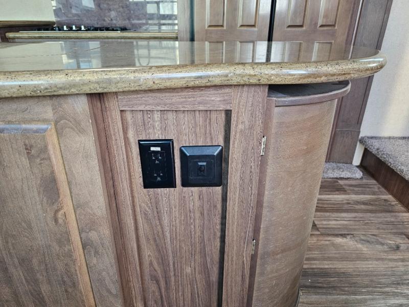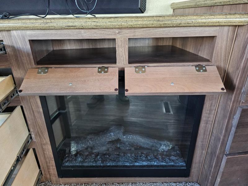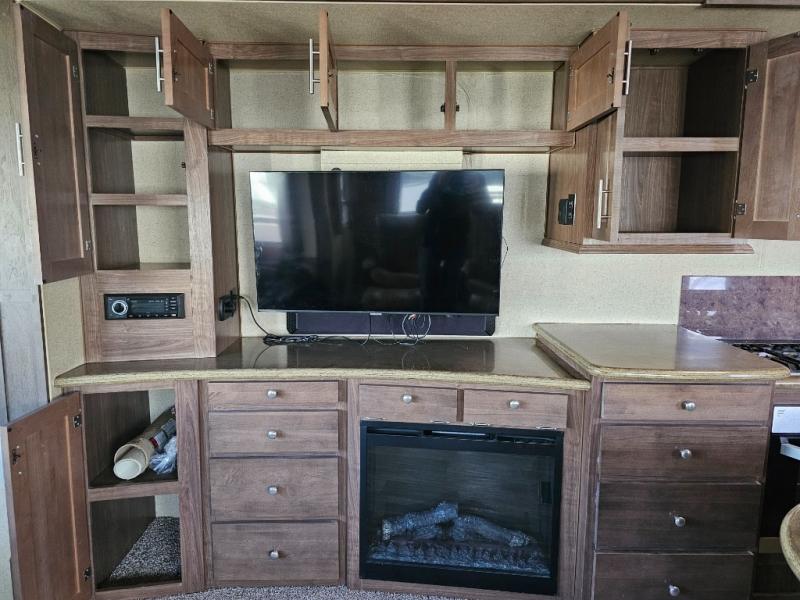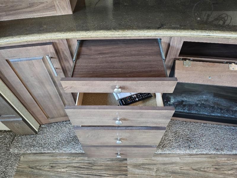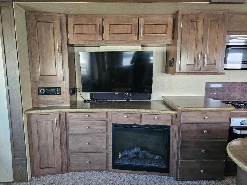 You might never go back home after enjoying all the comforts and conveniences in this fifth wheel from the 42" LED Smart TV to the wall mount swivel table with four chairs, plus the double entry bath. The main living and kitchen area offer two opposing slide outs that provide lots of floor space around the kitchen island to enjoy the entertainment center and fireplace, the Furrion cooking suite plus the tri-fold sofa and swivel rocker-recliners. The bedroom will be your oasis with a TruRest queen mattress with Ultradeck sleep system, a hardwood dresser top, a bench seat with hamper, and plenty of wardrobe space, plus you can add a washer/dryer option. You might like to add a few more options such as a king bed, a slide tray in the pass-through compartment, a second air conditioner, and/or a 5.5 Onan Gold LP generator.