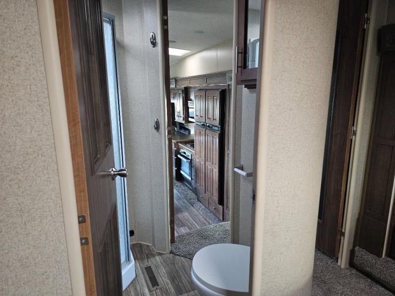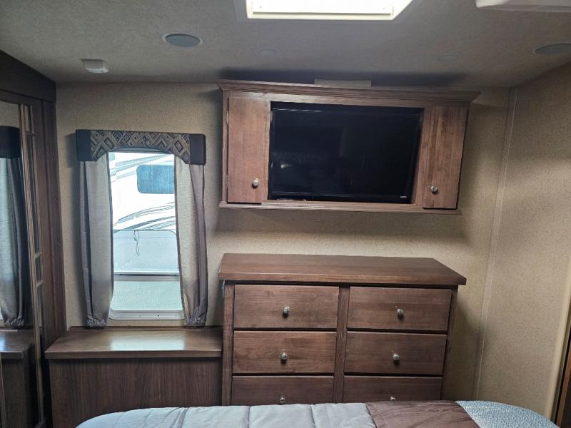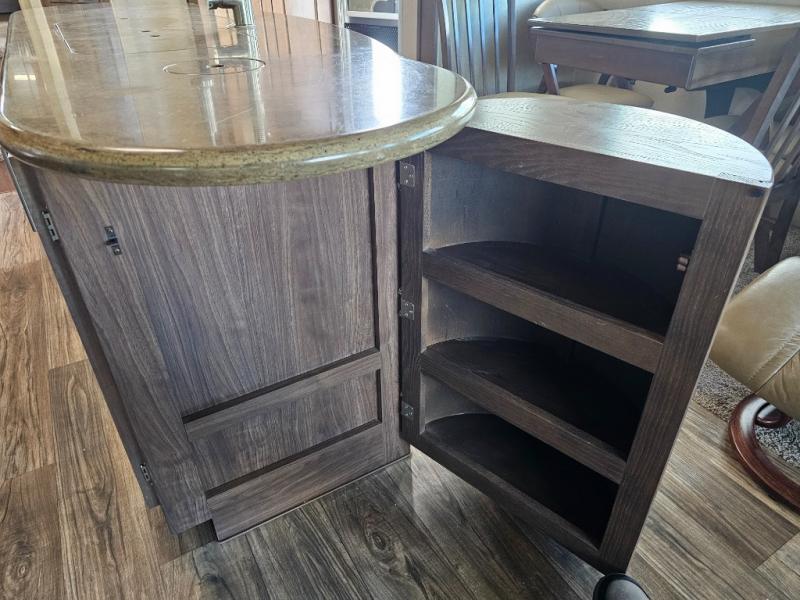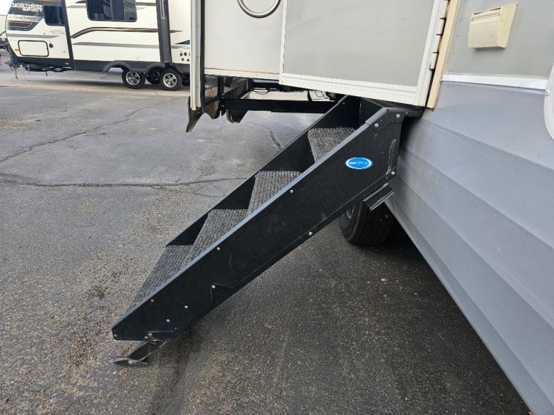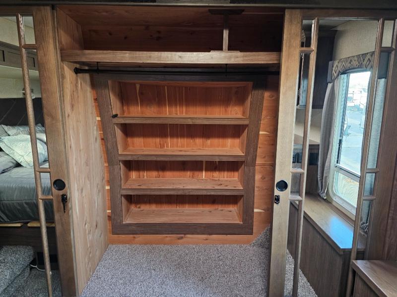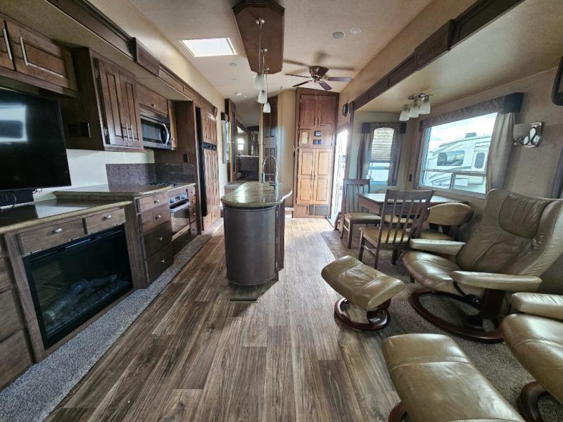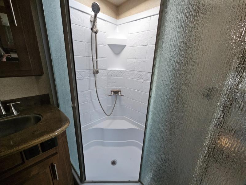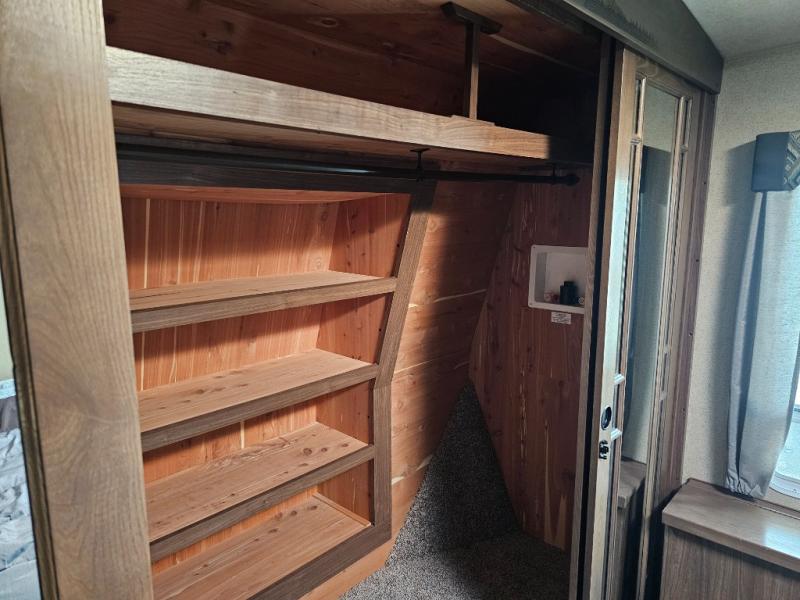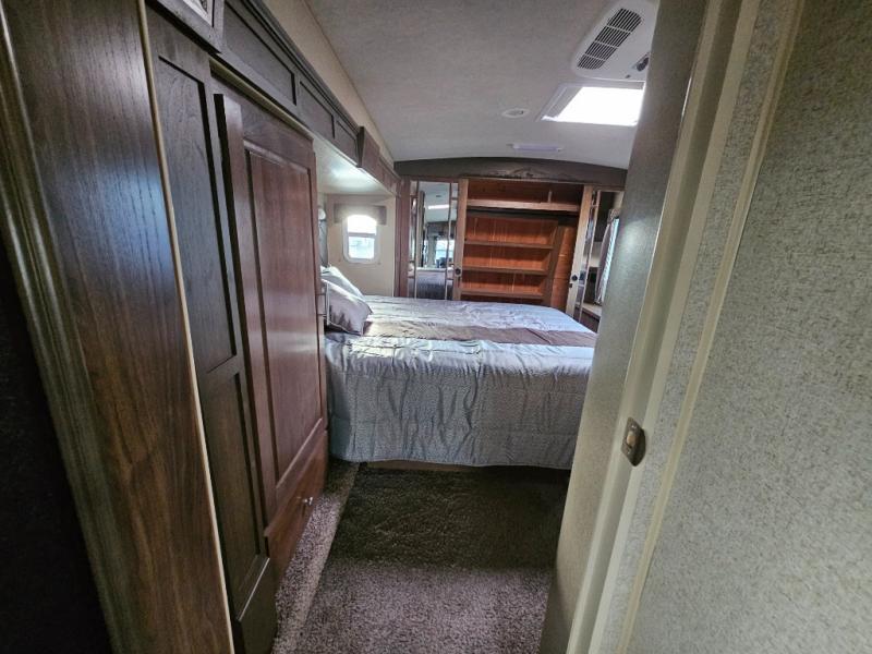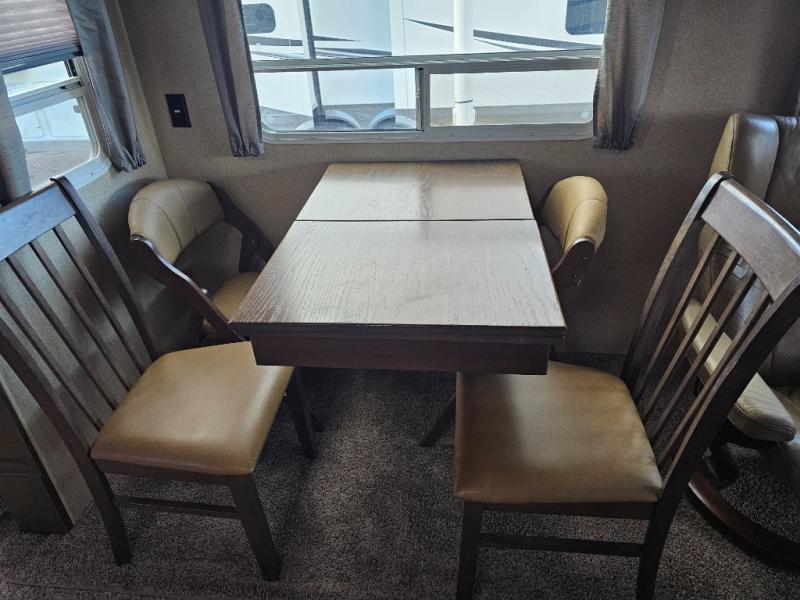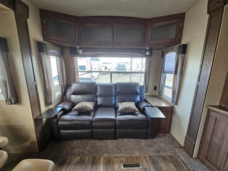 You might never go back home after enjoying all the comforts and conveniences in this fifth wheel from the 42" LED Smart TV to the wall mount swivel table with four chairs, plus the double entry bath. The main living and kitchen area offer two opposing slide outs that provide lots of floor space around the kitchen island to enjoy the entertainment center and fireplace, the Furrion cooking suite plus the tri-fold sofa and swivel rocker-recliners. The bedroom will be your oasis with a TruRest queen mattress with Ultradeck sleep system, a hardwood dresser top, a bench seat with hamper, and plenty of wardrobe space, plus you can add a washer/dryer option. You might like to add a few more options such as a king bed, a slide tray in the pass-through compartment, a second air conditioner, and/or a 5.5 Onan Gold LP generator.
