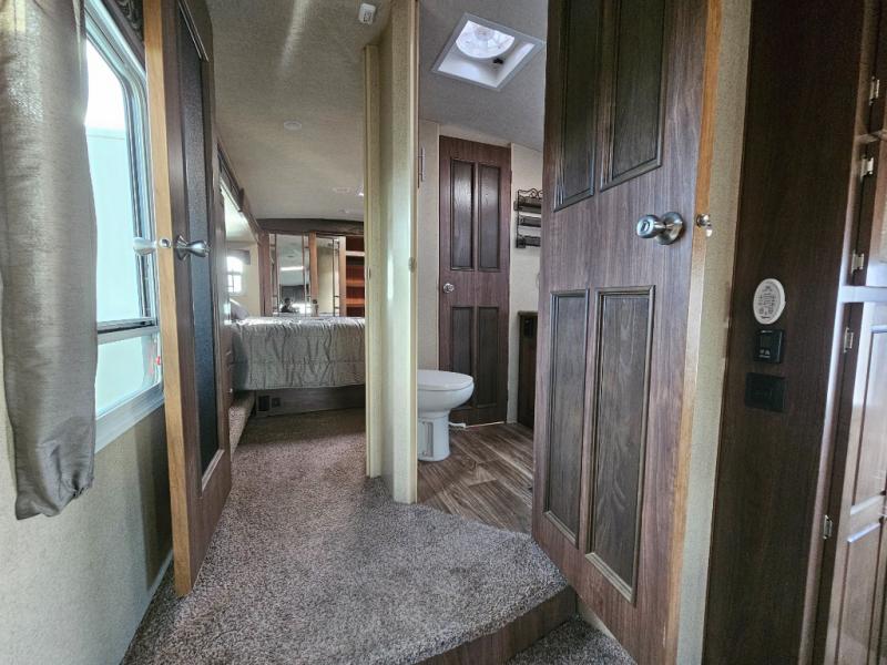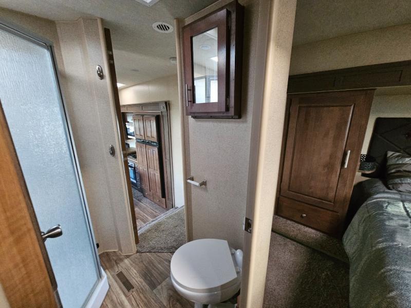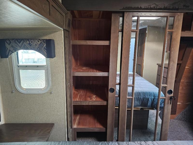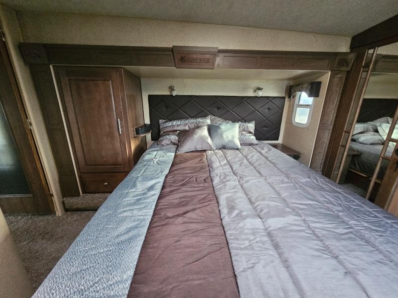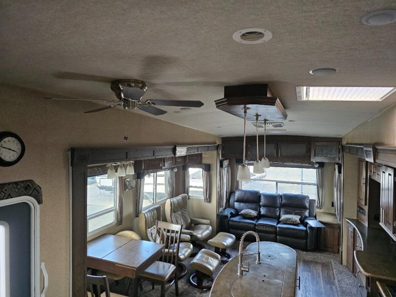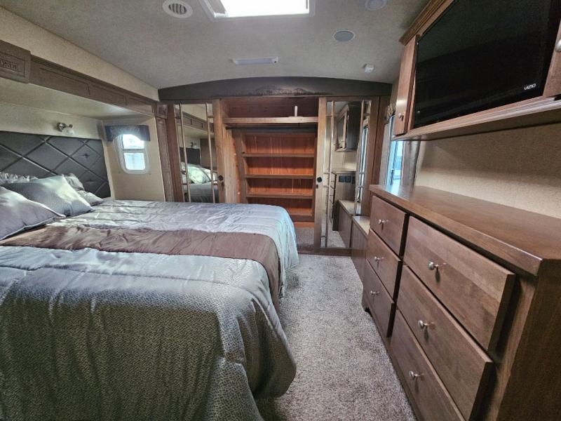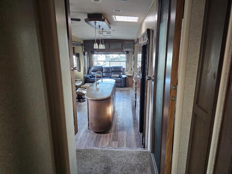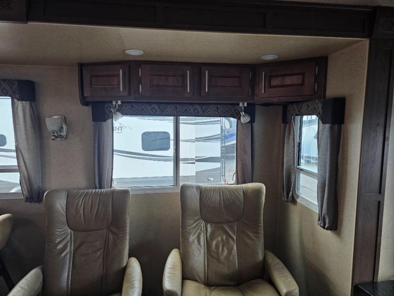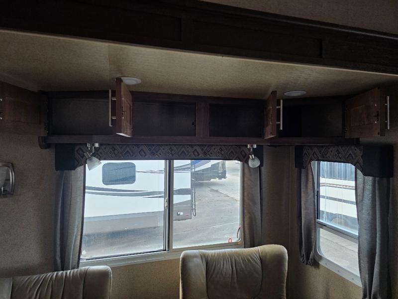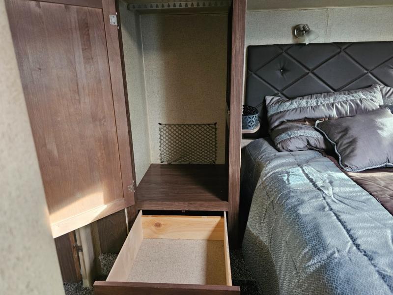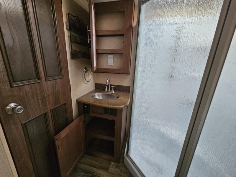 You might never go back home after enjoying all the comforts and conveniences in this fifth wheel from the 42" LED Smart TV to the wall mount swivel table with four chairs, plus the double entry bath. The main living and kitchen area offer two opposing slide outs that provide lots of floor space around the kitchen island to enjoy the entertainment center and fireplace, the Furrion cooking suite plus the tri-fold sofa and swivel rocker-recliners. The bedroom will be your oasis with a TruRest queen mattress with Ultradeck sleep system, a hardwood dresser top, a bench seat with hamper, and plenty of wardrobe space, plus you can add a washer/dryer option. You might like to add a few more options such as a king bed, a slide tray in the pass-through compartment, a second air conditioner, and/or a 5.5 Onan Gold LP generator.
