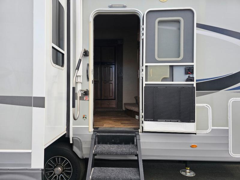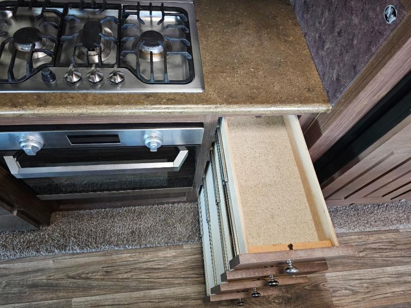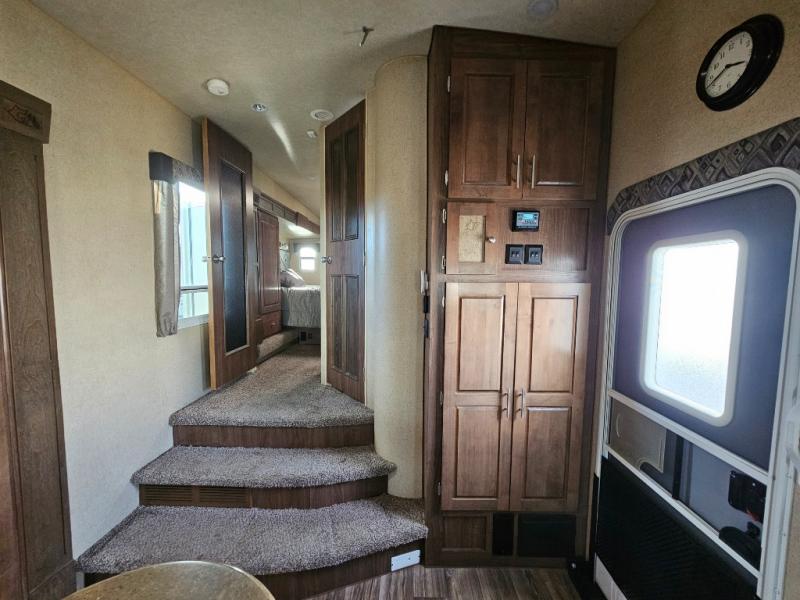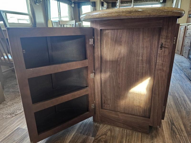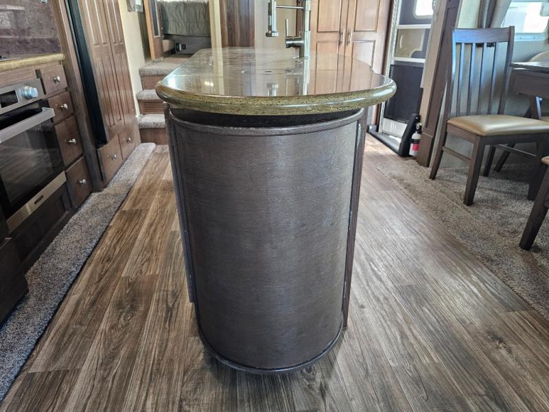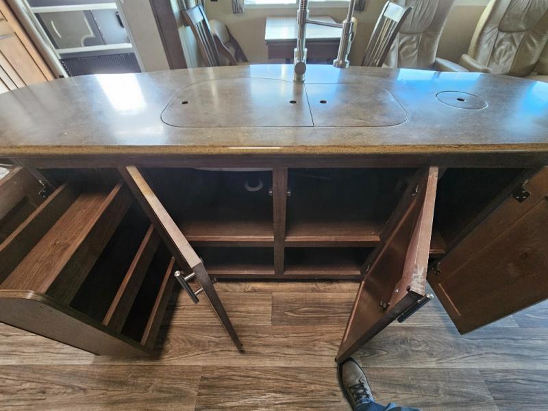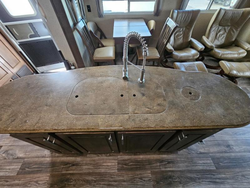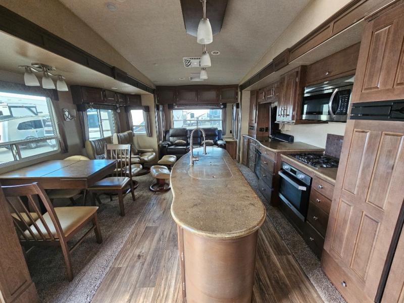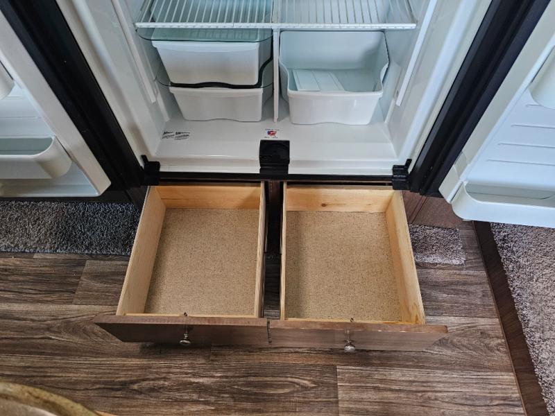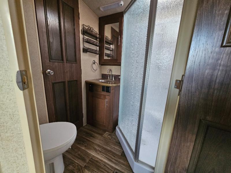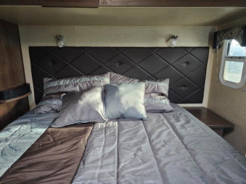You might never go back home after enjoying all the comforts and conveniences in this fifth wheel from the 42" LED Smart TV to the wall mount swivel table with four chairs, plus the double entry bath. The main living and kitchen area offer two opposing slide outs that provide lots of floor space around the kitchen island to enjoy the entertainment center and fireplace, the Furrion cooking suite plus the tri-fold sofa and swivel rocker-recliners. The bedroom will be your oasis with a TruRest queen mattress with Ultradeck sleep system, a hardwood dresser top, a bench seat with hamper, and plenty of wardrobe space, plus you can add a washer/dryer option. You might like to add a few more options such as a king bed, a slide tray in the pass-through compartment, a second air conditioner, and/or a 5.5 Onan Gold LP generator.