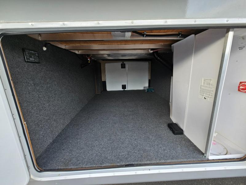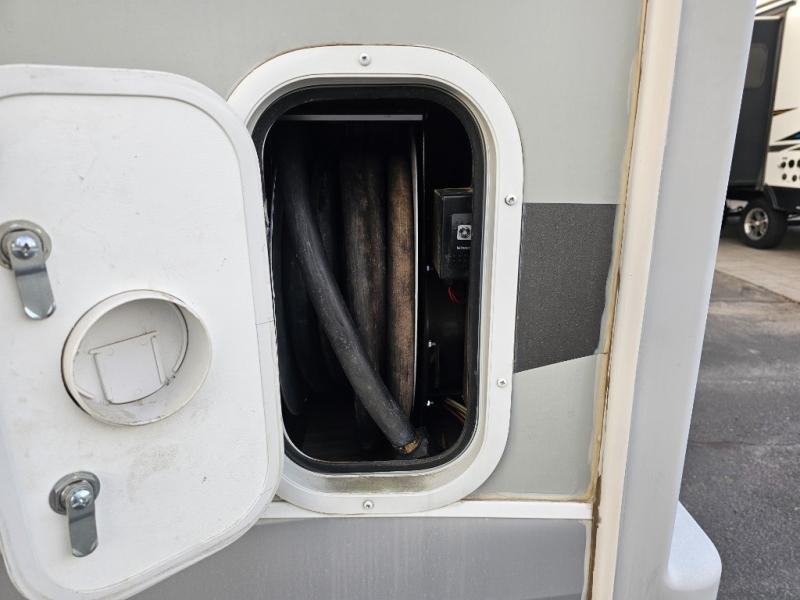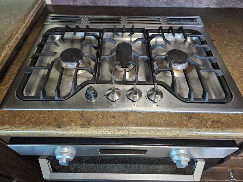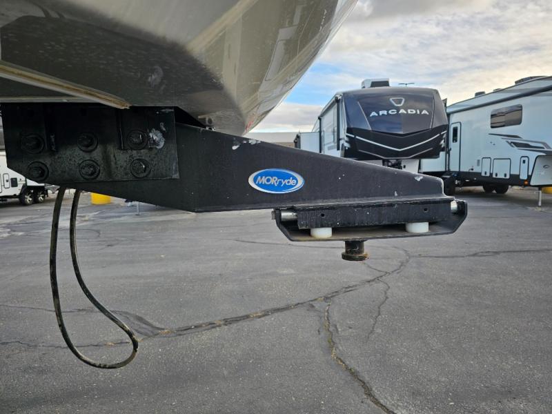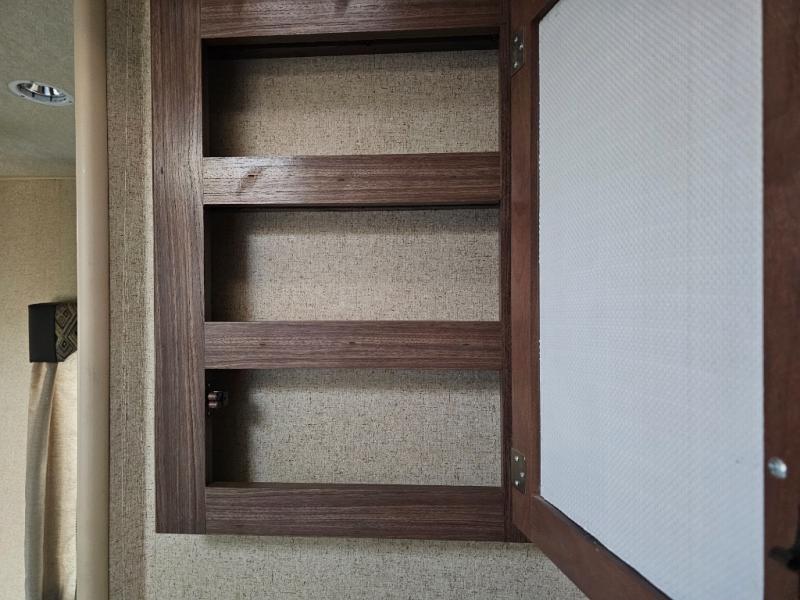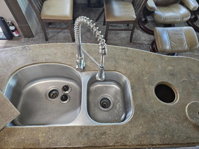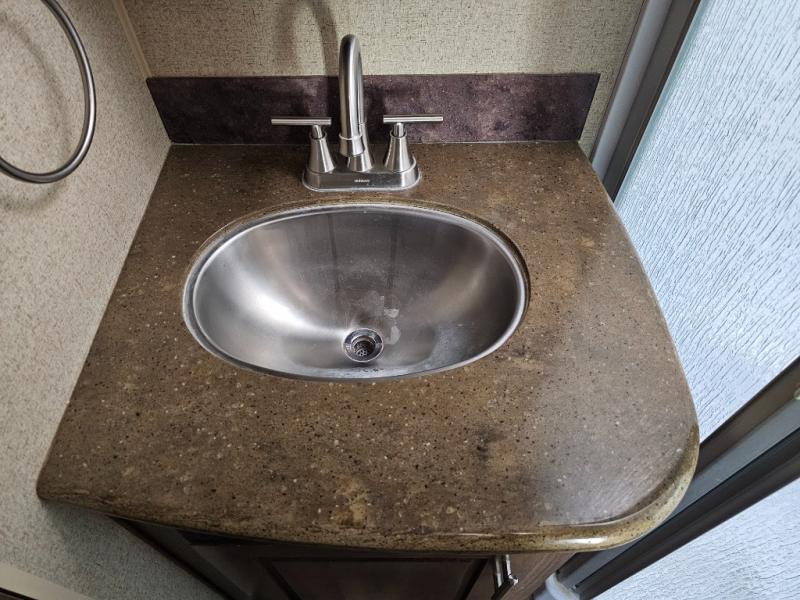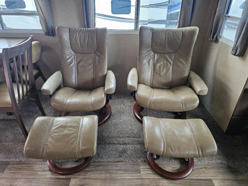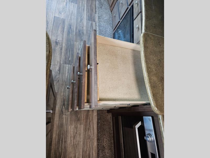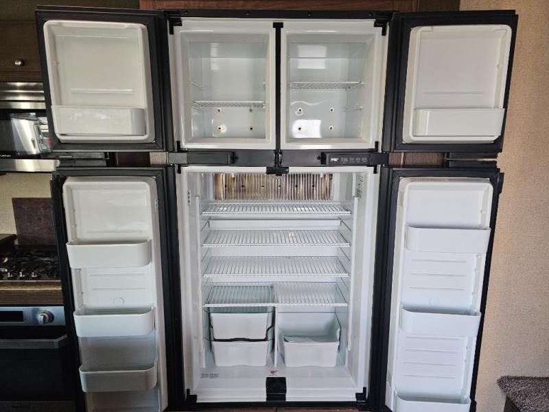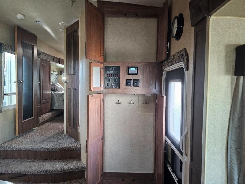 You might never go back home after enjoying all the comforts and conveniences in this fifth wheel from the 42" LED Smart TV to the wall mount swivel table with four chairs, plus the double entry bath. The main living and kitchen area offer two opposing slide outs that provide lots of floor space around the kitchen island to enjoy the entertainment center and fireplace, the Furrion cooking suite plus the tri-fold sofa and swivel rocker-recliners. The bedroom will be your oasis with a TruRest queen mattress with Ultradeck sleep system, a hardwood dresser top, a bench seat with hamper, and plenty of wardrobe space, plus you can add a washer/dryer option. You might like to add a few more options such as a king bed, a slide tray in the pass-through compartment, a second air conditioner, and/or a 5.5 Onan Gold LP generator.