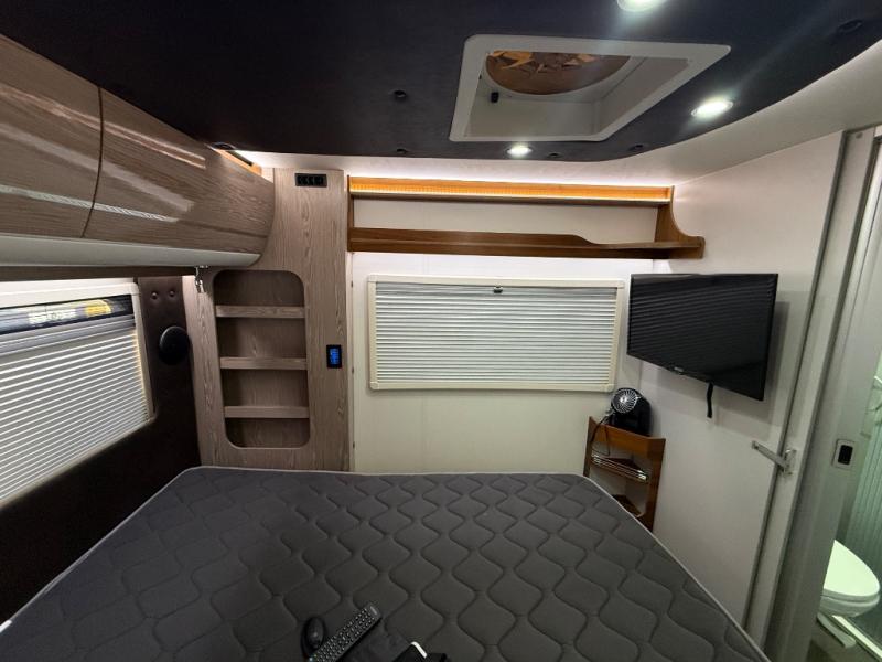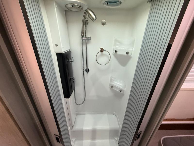 The AVIA travel trailer features Ohio Amish quality comforts inside with plenty of great views, and outside you will enjoy your favorite sounds from the premium speakers, LED amber porch lights at dusk, and a 16' cassette awning whenever you are hanging out taking in the great outdoors! The lighted entry handle with motion sensor guides you inside after an evening of campfire and s'mores. The dry bath awaits so you can easily get cleaned up to enjoy the rest of your evening inside lounging watching television on the 24" flat-screen TV, or take in a bit of constellation and star searching through the stargazer window overhead. After waking from a great night's rest, the kitchen amenities are readily available for creating a yummy breakfast feast as you prepare for another full day of adventure and fun!