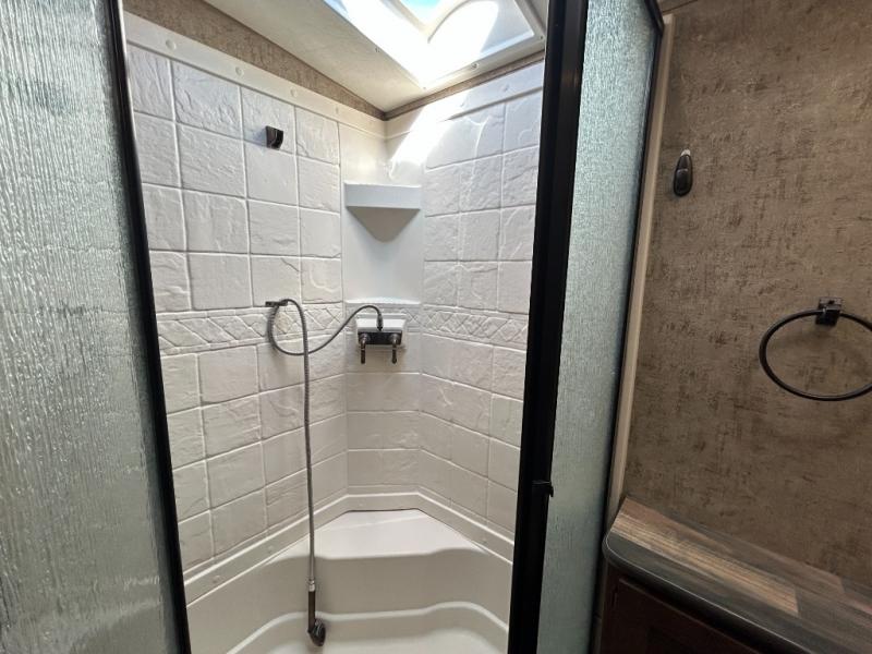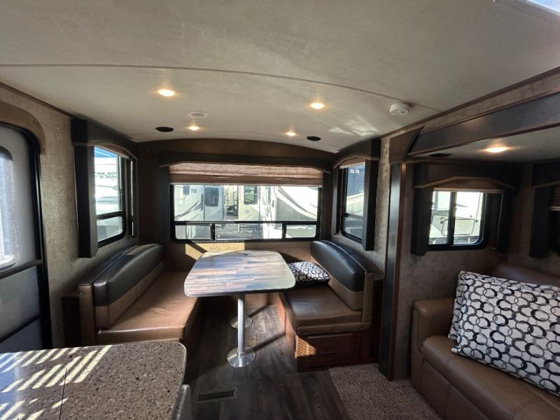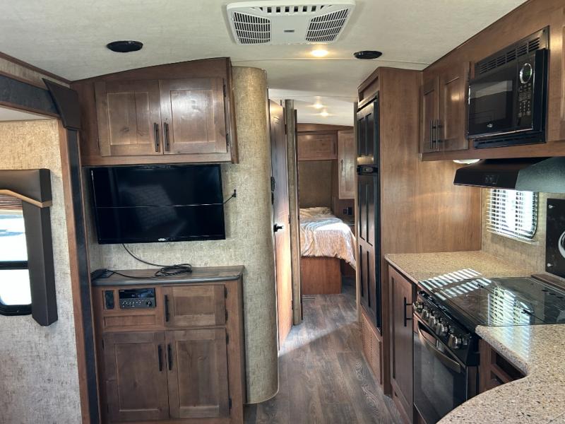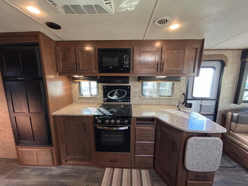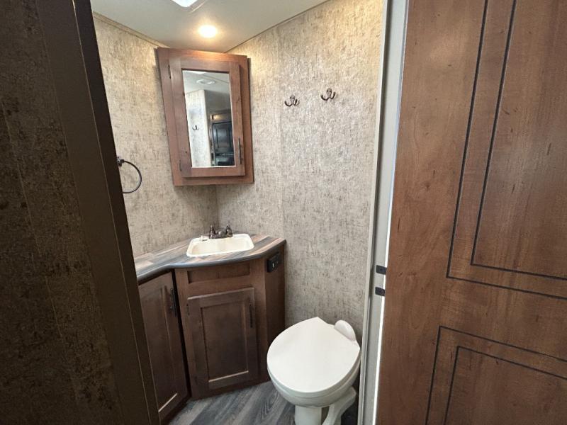 If you are looking for a trailer with extra sleeping space, you will find it on the sleeper sofa and the booth dinette. Yet you might decide to choose the optional residential sofa with built-in recliners if you tend to camp without guests and prefer that type of seating when relaxing inside. The cook will love the kitchen with everything near by like a flip-up counter, an 8 cubic foot XL refrigerator, and a farm sink to wash the dirty dishes in. When it's time to get some rest, the private front bedroom includes a walk-around queen-size bed, plenty of storage, and the second entry into the trailer as an added convenience.