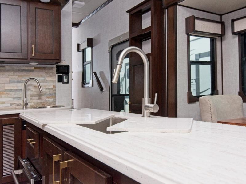 Love cooking while traveling? The Columbus 1492 366RL gives you the flexibility to prepare meals inside or outside. Inside, enjoy a chef-inspired kitchen with dual slide-outs for extra floor space, a large center island with a stainless steel double-bowl sink, and an additional prep sink for easy meal prep. Prefer fresh air? Fire up the outdoor kitchen or use the exterior microwave for quick snacks.
