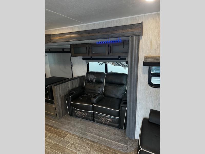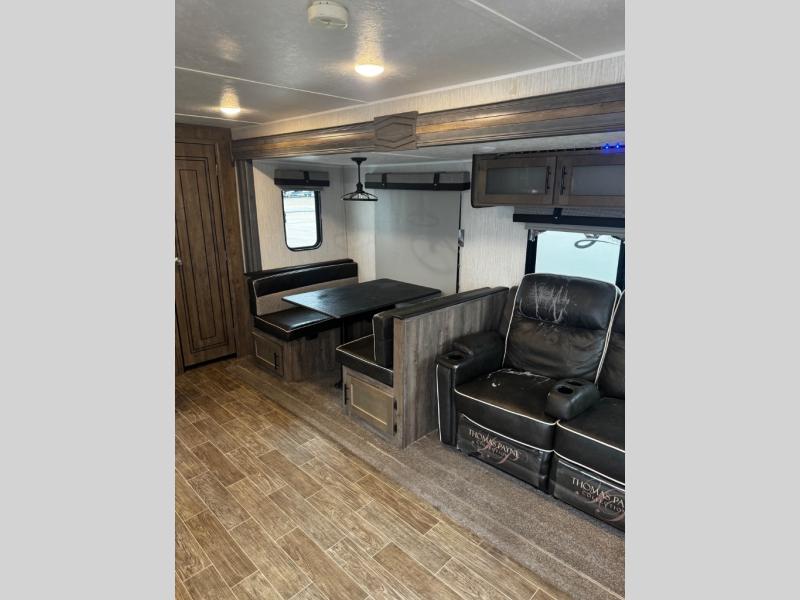 Let your worries fade away and simply enjoy your time away in this Puma travel trailer! You will be able to host any friends that you've made around the campground with the helpful amenities found in the full kitchen, like the three-burner high-output range with glass cover and the undermount stainless steel sink with roll-up covers. Plus, the spice rack, built-in knife rack, and divided silverware drawer make the kitchen exceptionally functional. Once you have prepared a delicious meal for your guests, you can offer them a place to sit back and enjoy that meal with the booth dinette, the two recliners, and the sofa.
