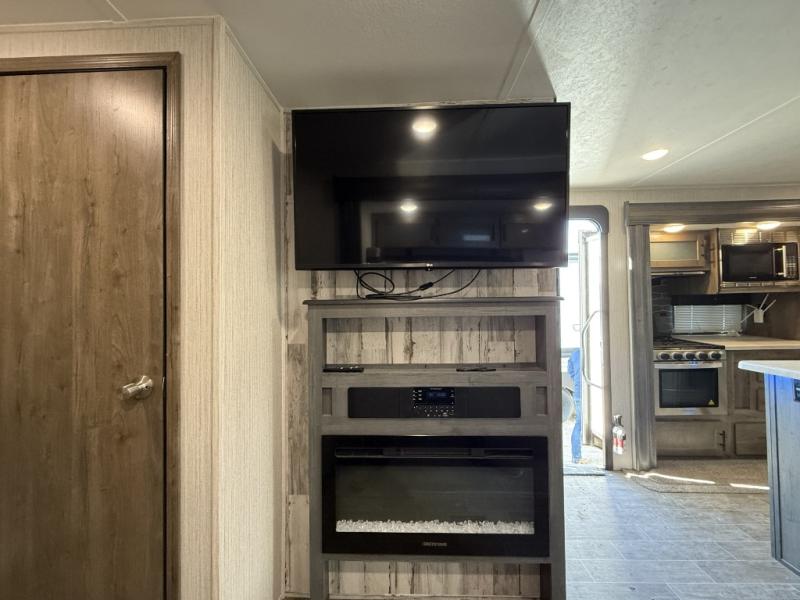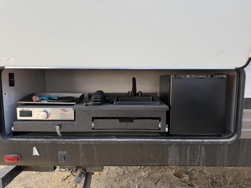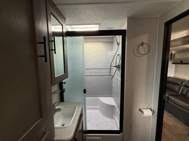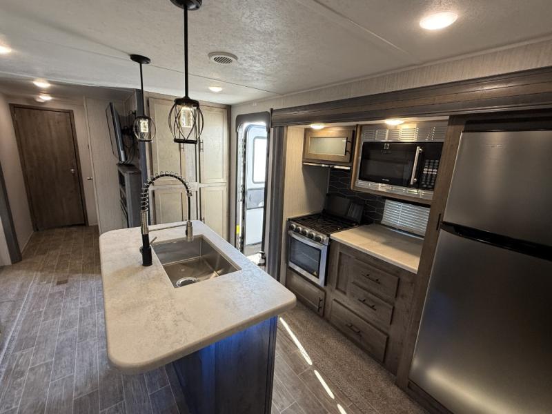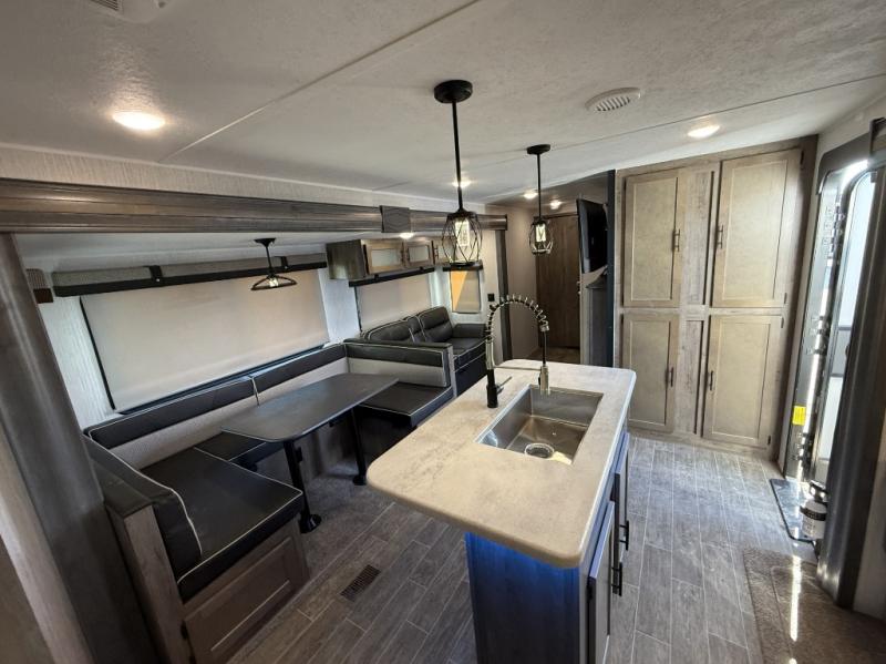 This fantastic Puma travel trailer gives you the ultimate convenience with its two full bathrooms! Plus, you also have extra interior living space because of the opposing slides which will make it easy to work around the kitchen island as you use the high-rise pull-down faucet in the undermount stainless steel sink. You can even switch on the Bluetooth stereo to make washing dishes fun. At the end of the night, take your exhausted body to the front of this trailer where you will find an amazingly comfortable master suite which has both a private entrance into the bathroom and a private exterior entrance.