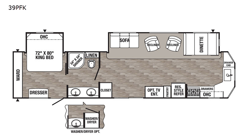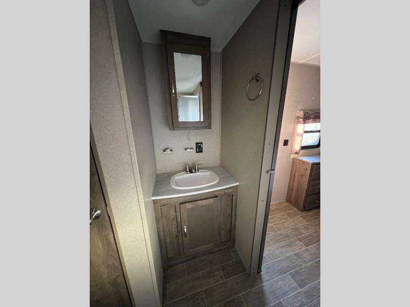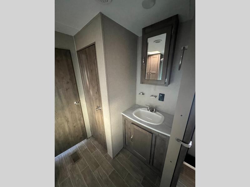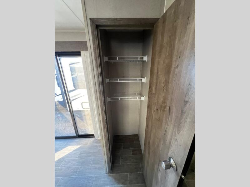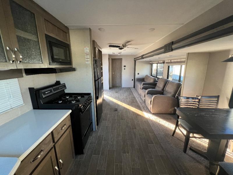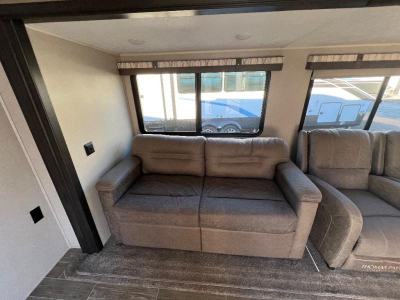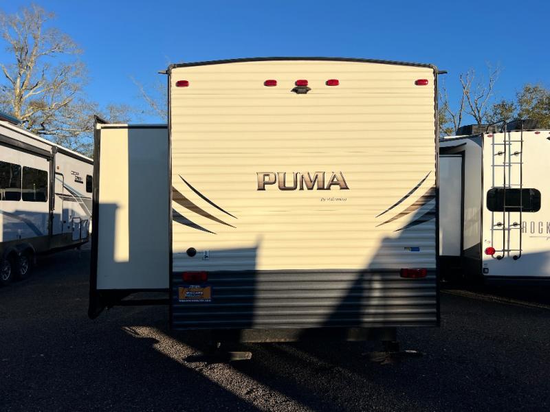 This Puma Destination trailer gives you plenty of interior living space with its large slide in the main living area and its king-size bed slide in the rear private bedroom! The bedroom also has the second exterior entry door so that you can come and go as you please, and it also has a private entrance into the walk-through bath that has a double-sink vanity. Head to the front kitchen where you will find a convenient place to make quick meals for the family with the three-burner range, the microwave, and the oven. And the 18 cu. ft. stainless steel residential refrigerator and the pantry will allow you to stock up on ingredients and goodies.