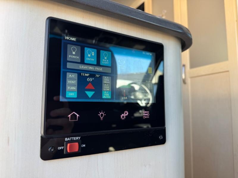 This motorhome features two dining locations for you to enjoy your delicious meals at thanks to the innovative Lagun table. There is also an array of storage options between the two-pantry style cabinets and the soft-close drawers. If you have to get a little bit of work done while on the road then you will love the front lounge workstation with the 120V power outlet, the USB charging ports, and the extended Corian countertop with a privacy shade and storage cabinets too. The convection microwave makes it easy for you to pop a bag of popcorn in and enjoy eating it while you relax on the power sofa with memory foam sofa cushions!