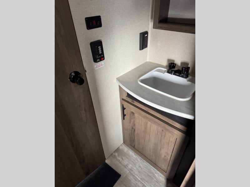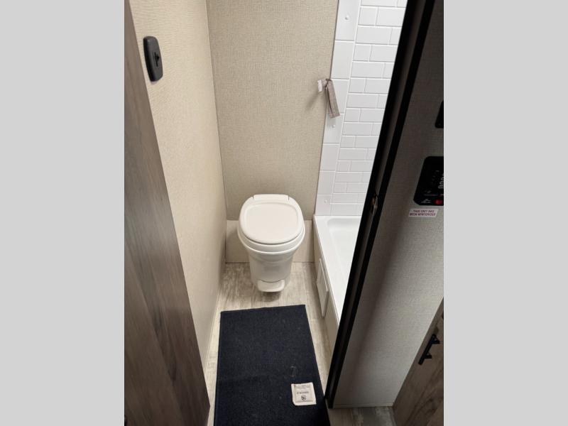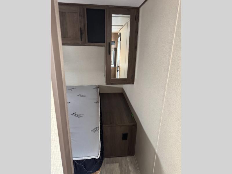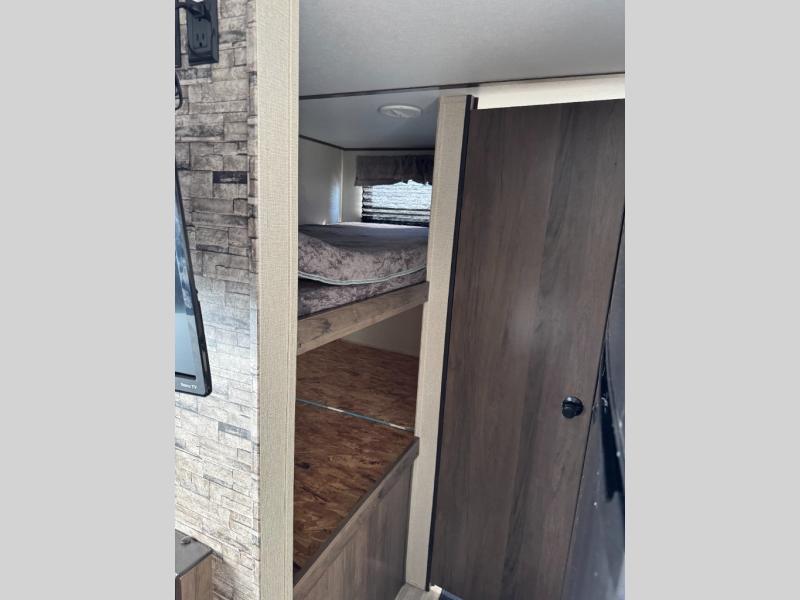 When it's time for your next get-a-way, hook up this Avenger travel trailer for a great time that is sure to leave lasting memories. You will enjoy a front private bedroom with a queen bed, and two closets for all your clothes. This unit features large double bunks that the kids are sure to love, plus the dinette can be folded down for a little one to sleep on at night. With all the kitchen amenities, including a three burner cooktop, and a deep basin sink, you'll have everything you need to prepare a home cooked meal in this trailer. This model also includes a private toilet and tub room with a sink and overhead medicine cabinet just outside the bath door! Get an early start on your next camping trip with this Avenger travel trailer!
