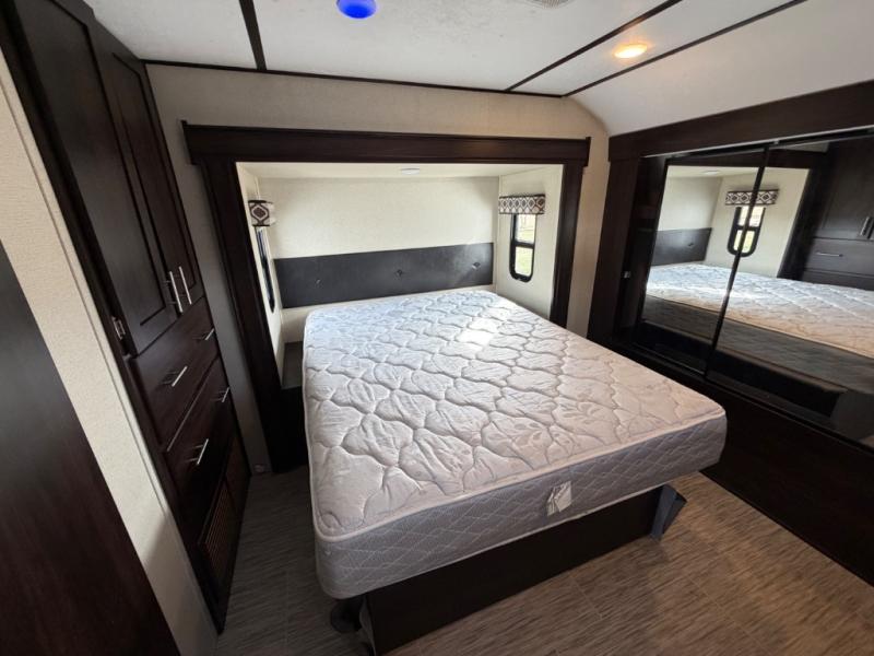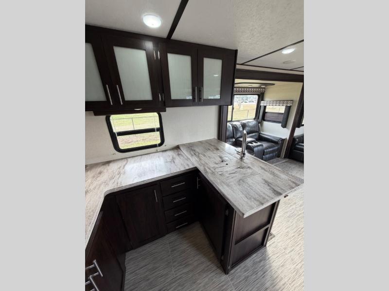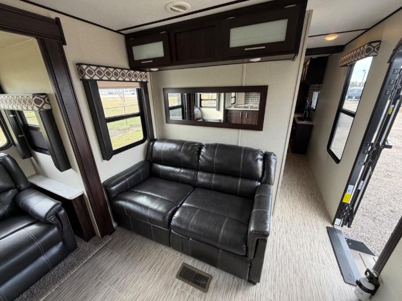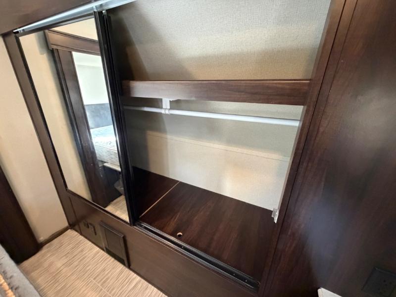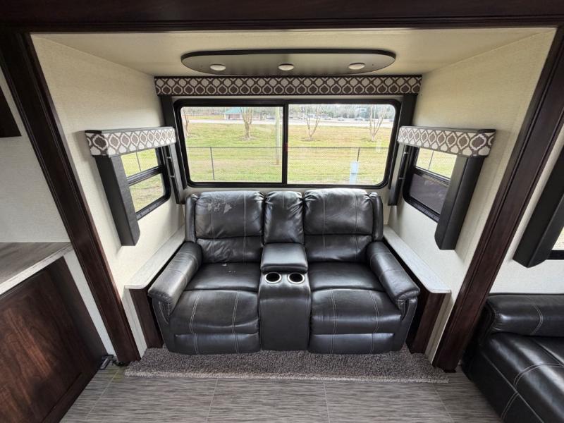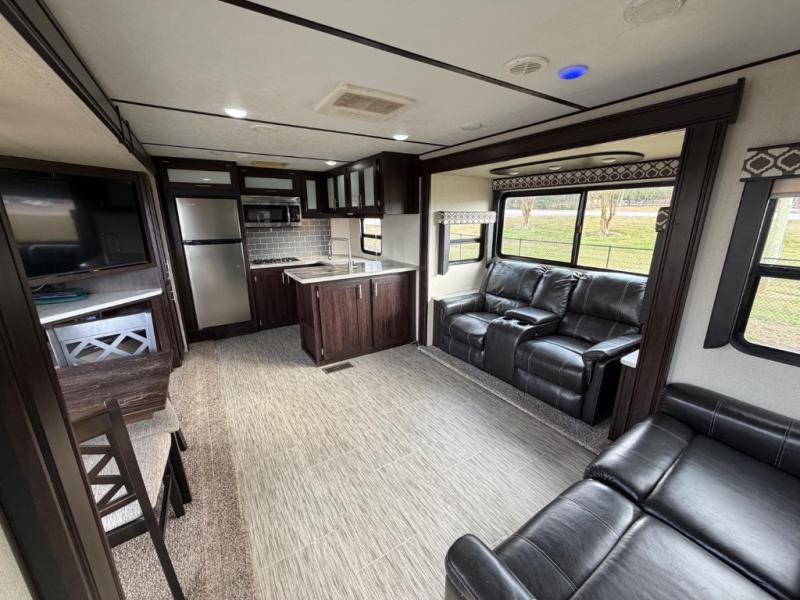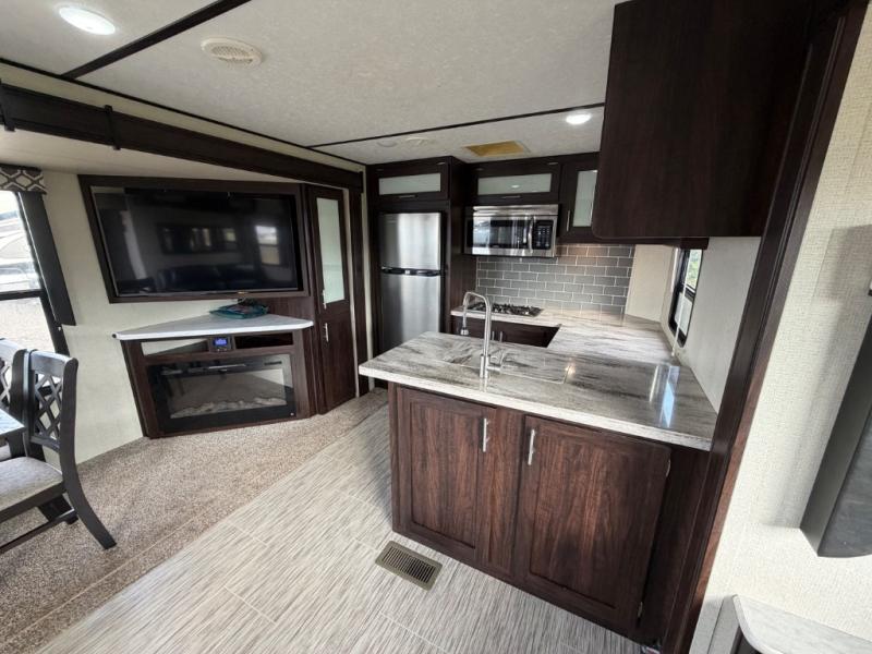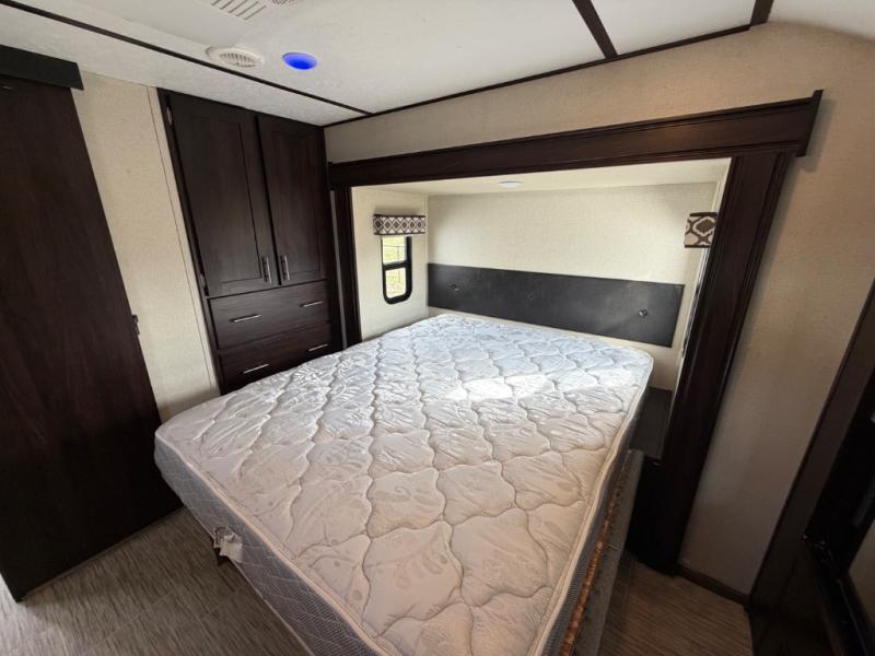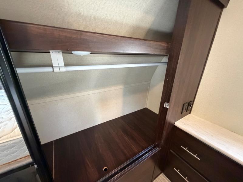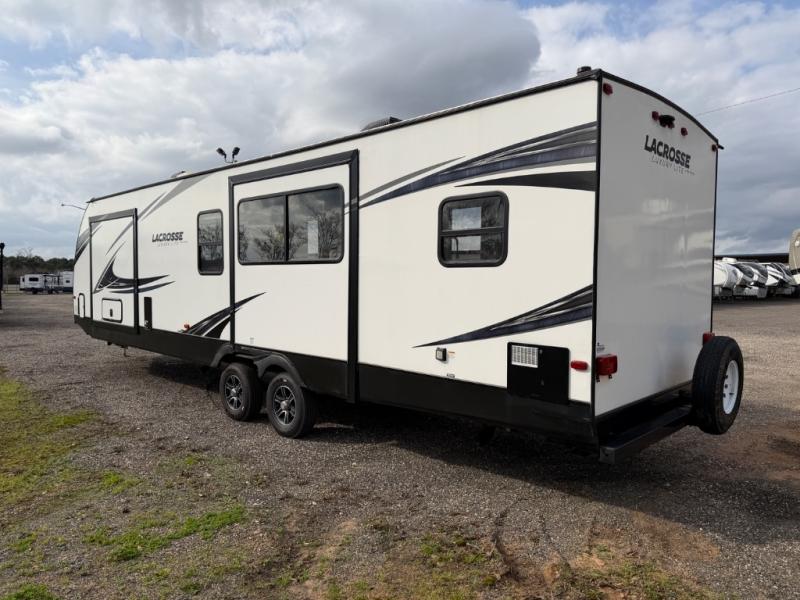 For any camping adventure, you will want this LaCrosse luxury travel trailer for several reasons. You will find sleeping space for up to four people, plus there are large panoramic slide room windows providing a beautiful view when dining. The rear kitchen offers the finest chefs the LaCrosse's best-in-class luxury kitchen with a Furrion residential cooktop, convection microwave, and single-bowl stainless steel sink on the U-shaped countertop. Come enjoy time together with your family or a few friends in the living area with theater seating, hide-a-bed sofa, and windows galore! The front private bedroom will not disappoint with the king bed slide, a huge wardrobe, and a large chest of drawers. This is the one!