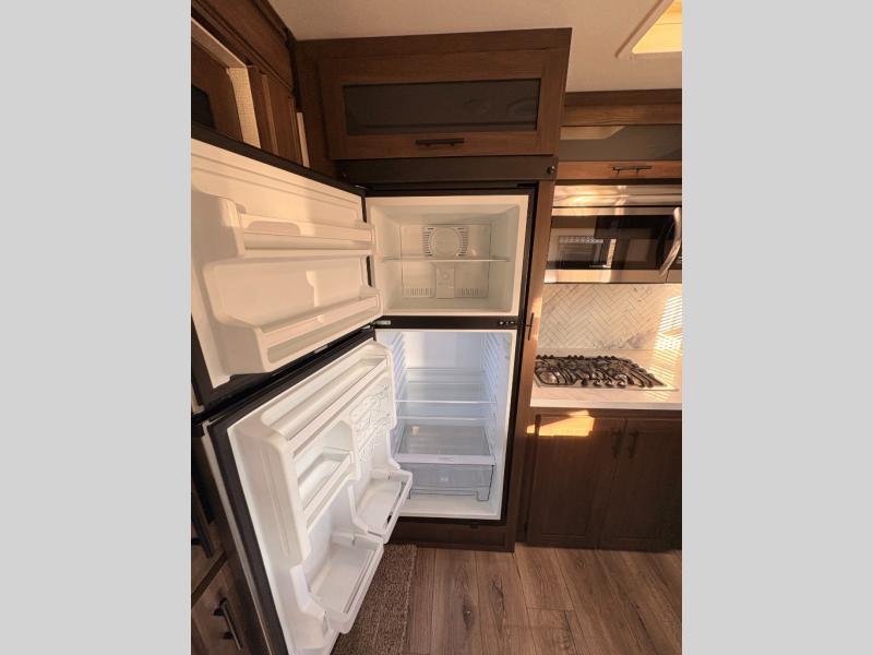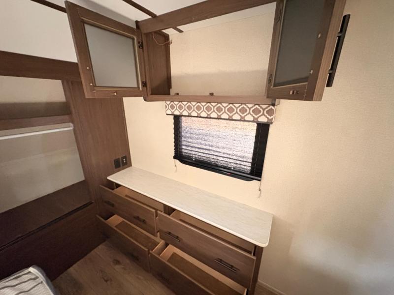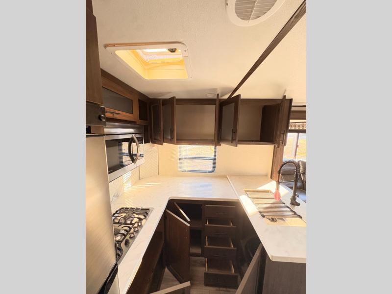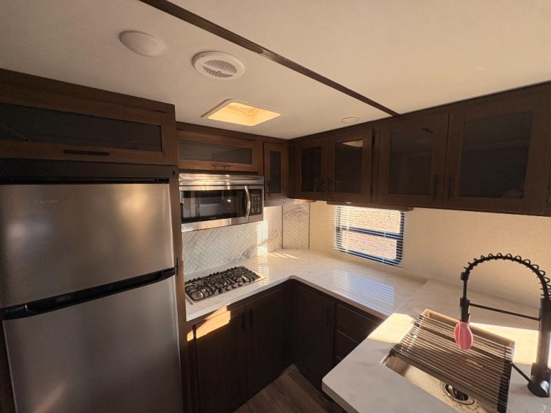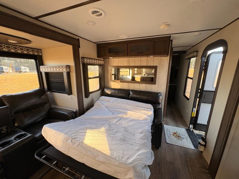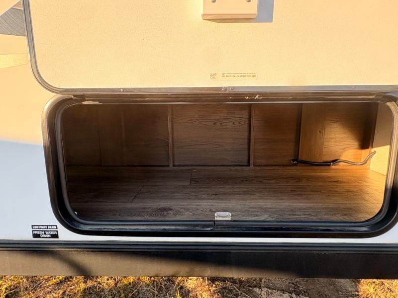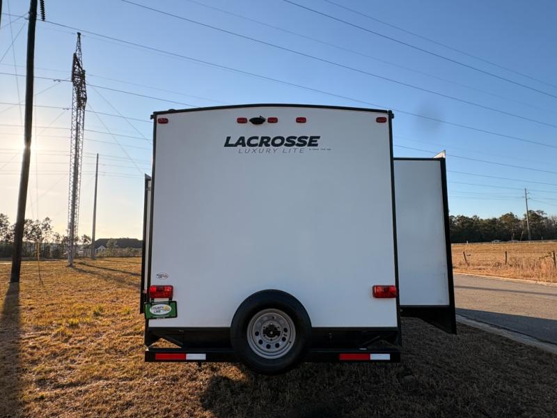 For any camping adventure, you will want this LaCrosse luxury travel trailer for several reasons. You will find sleeping space for up to four people, plus there are large panoramic slide room windows providing a beautiful view when dining. The rear kitchen offers the finest chefs the LaCrosse's best-in-class luxury kitchen with a Furrion residential cooktop, convection microwave, and single-bowl stainless steel sink on the U-shaped countertop. Come enjoy time together with your family or a few friends in the living area with theater seating, hide-a-bed sofa, and windows galore! The front private bedroom will not disappoint with the king bed slide, a huge wardrobe, and a large chest of drawers. This is the one!