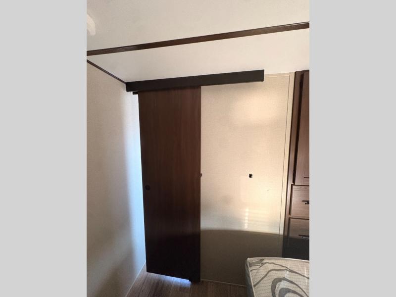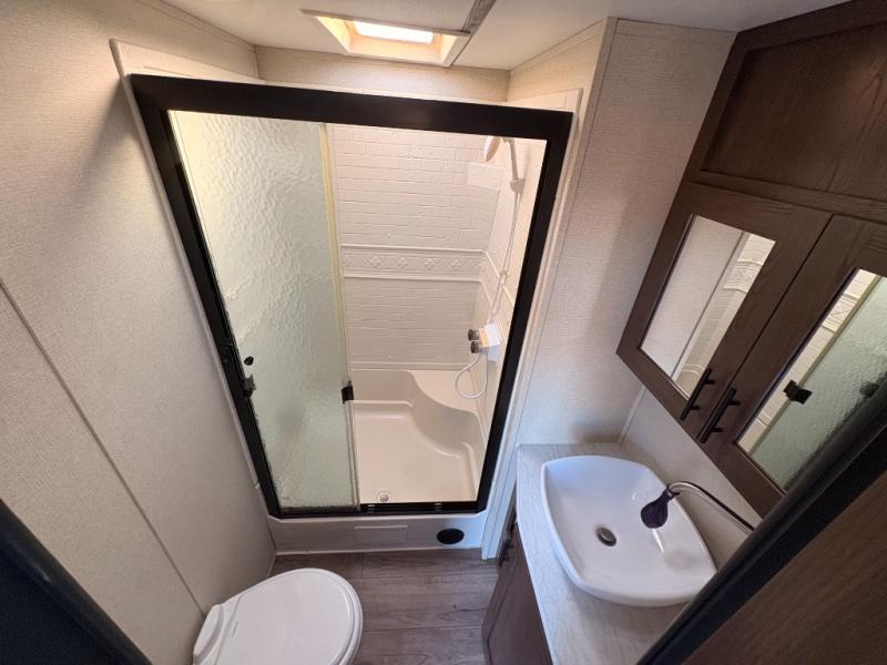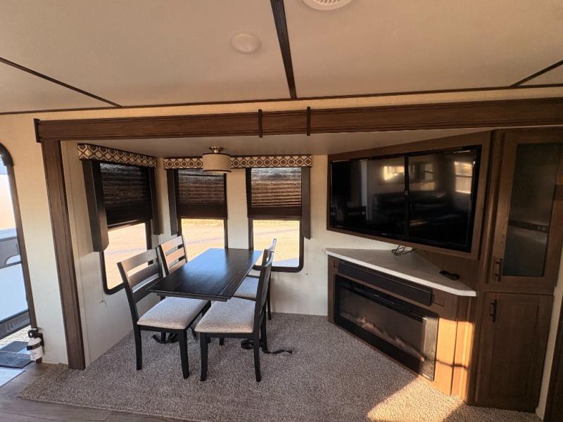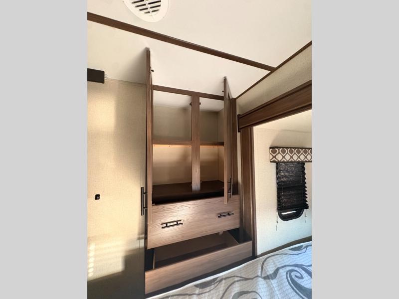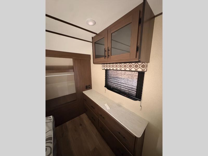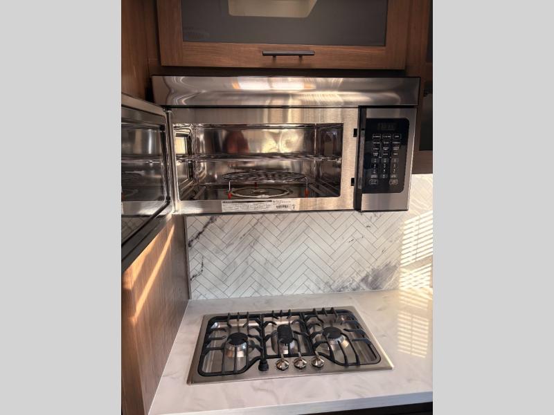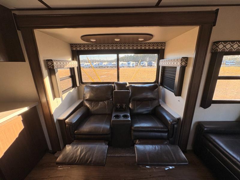 For any camping adventure, you will want this LaCrosse luxury travel trailer for several reasons. You will find sleeping space for up to four people, plus there are large panoramic slide room windows providing a beautiful view when dining. The rear kitchen offers the finest chefs the LaCrosse's best-in-class luxury kitchen with a Furrion residential cooktop, convection microwave, and single-bowl stainless steel sink on the U-shaped countertop. Come enjoy time together with your family or a few friends in the living area with theater seating, hide-a-bed sofa, and windows galore! The front private bedroom will not disappoint with the king bed slide, a huge wardrobe, and a large chest of drawers. This is the one!