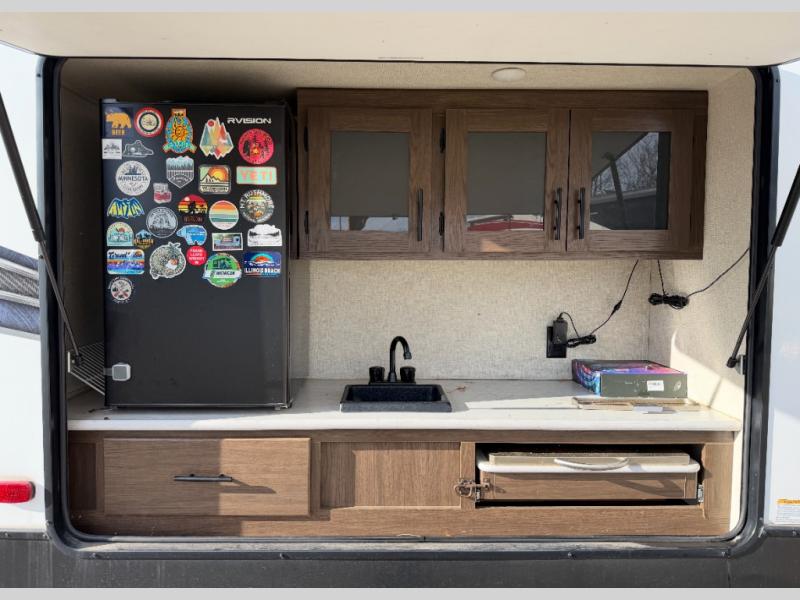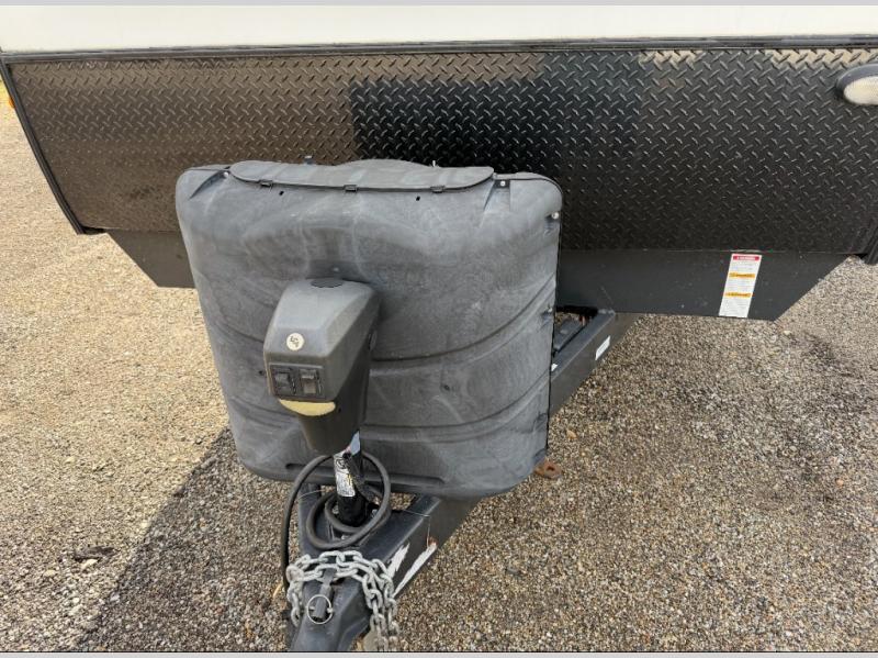 You will be counting the days until your next camping trip with this triple-slide LaCrosse travel trailer. Just imagine your outdoor kitchen will be the talk of the campground when you are grilling steaks for your family. You can prepare the meal inside on the kitchen island with decorative pendant lighting after grabbing the seasoning from the oversized pantry. You will appreciate the opposing slides in the main living and kitchen area that provide plenty of floor space to walk around the trailer to get to each room. If it's time to spend some time indoors, the hide-a-bed sofa and U-shaped dinette allow everyone to come together to watch the 50" LED TV or play games. At night, you can retire to your own master suite up front while the kids choose a bunk bed or the Sleep and Play to try to fall asleep in their own private bunkhouse.