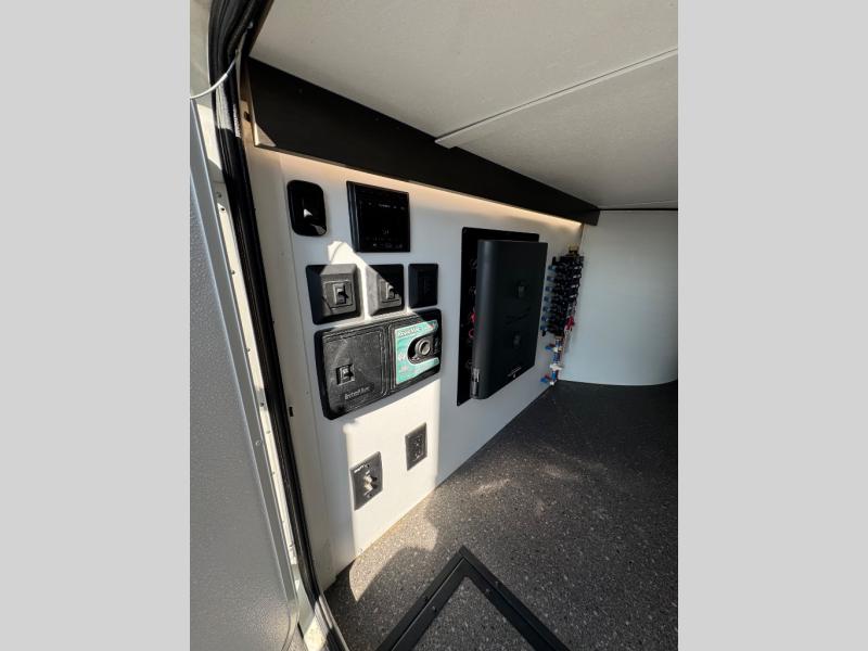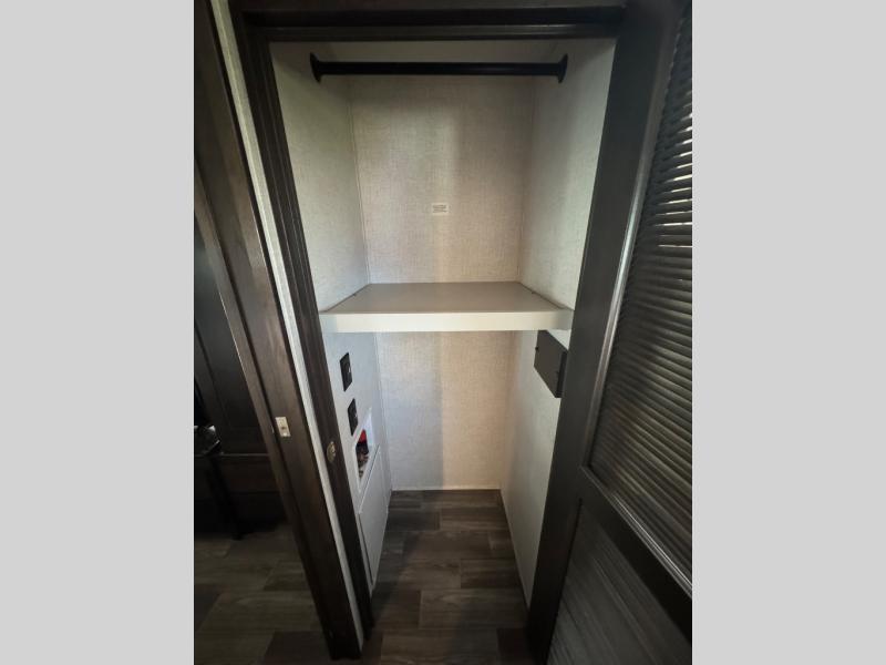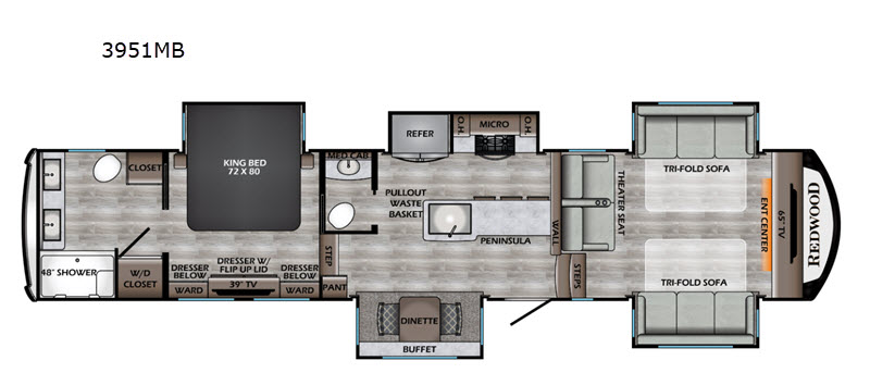 This fifth wheel has everything you need to make your next vacation comfortable and fun. With a front living area that includes two sofas, theater seating, and a 65" TV, you'll never want to go home. Enjoy the large kitchen with a pull out waste basket for your convenience, and a counter peninsula with bar stools the kids will love eating a snack on. Step up into the rear bedroom that features a king bed, and a full rear bath, which includes a double sink vanity, and a space that has been prepped for an optional washer and dryer in its own closet. You'll love everything about his fifth wheel, from the bath and a half, to the dinette with a buffet! Spend your next trip in luxury with this Redwood fifth wheel!