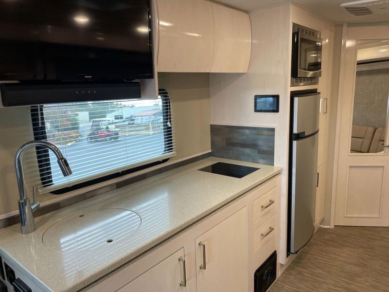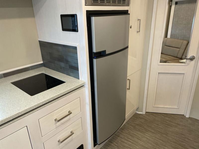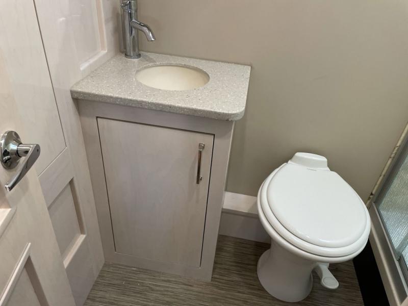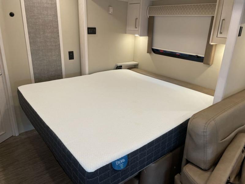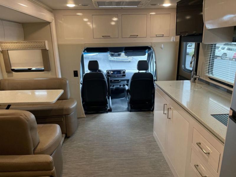 Step inside and discover a beautifully designed interior that feels more like a high-end studio apartment than a compact motorhome. The 25VRNL floorplan features a spacious rear lounge with plush seating that quickly converts into a comfortable sleeping area. Whether you’re relaxing with a book, hosting friends, or settling in for the night, this flexible layout adapts seamlessly to your lifestyle. The kitchen is thoughtfully equipped with solid-surface countertops, a convection microwave, a cooktop, and ample storage, giving you the freedom to prepare meals with home-style convenience. The split bath layout offers privacy while maximizing interior space, with a separate shower and a well-appointed vanity area.