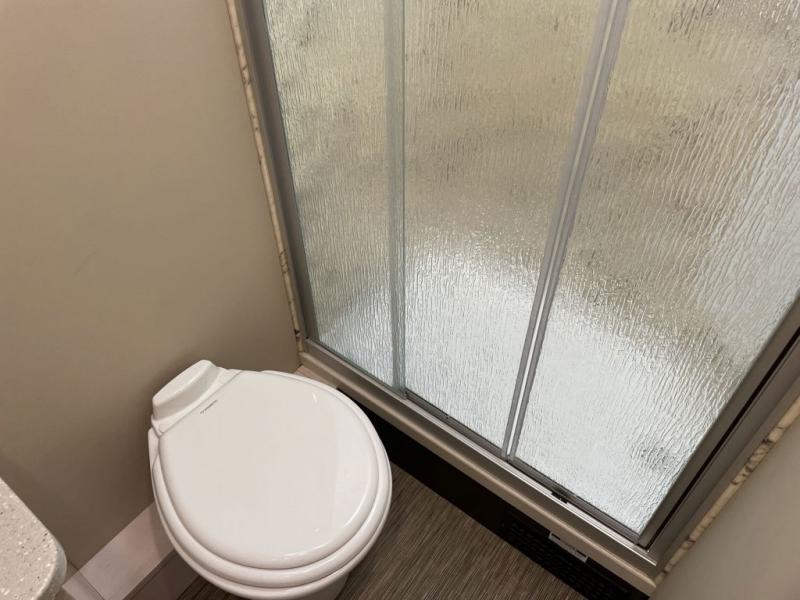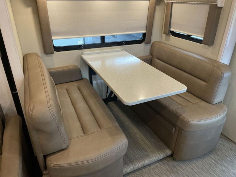 Step inside and discover a beautifully designed interior that feels more like a high-end studio apartment than a compact motorhome. The 25VRNL floorplan features a spacious rear lounge with plush seating that quickly converts into a comfortable sleeping area. Whether you’re relaxing with a book, hosting friends, or settling in for the night, this flexible layout adapts seamlessly to your lifestyle. The kitchen is thoughtfully equipped with solid-surface countertops, a convection microwave, a cooktop, and ample storage, giving you the freedom to prepare meals with home-style convenience. The split bath layout offers privacy while maximizing interior space, with a separate shower and a well-appointed vanity area.