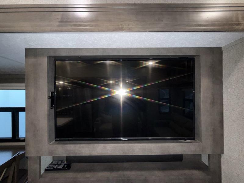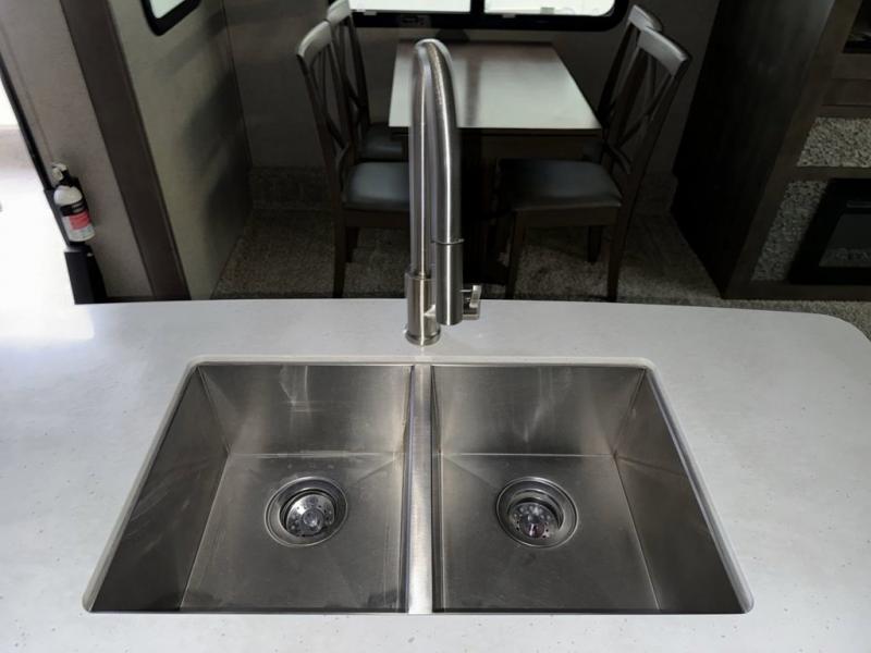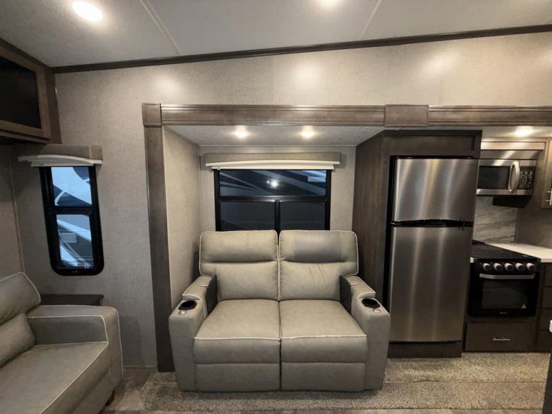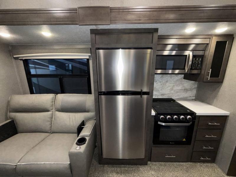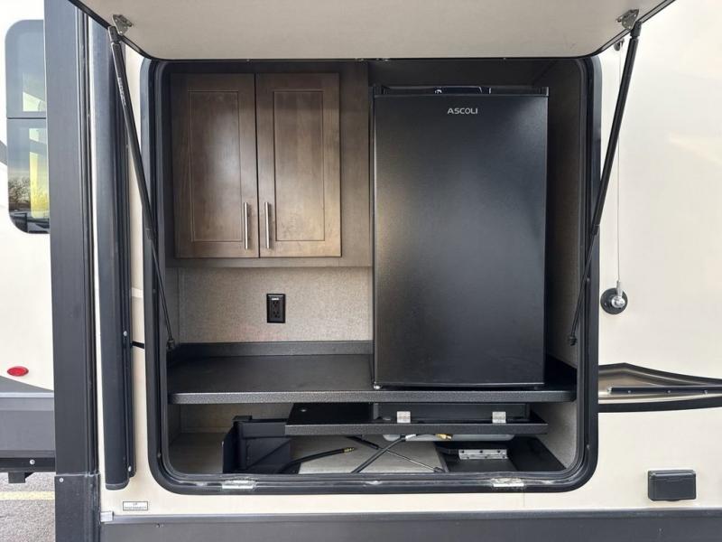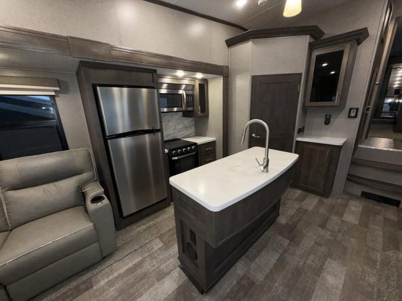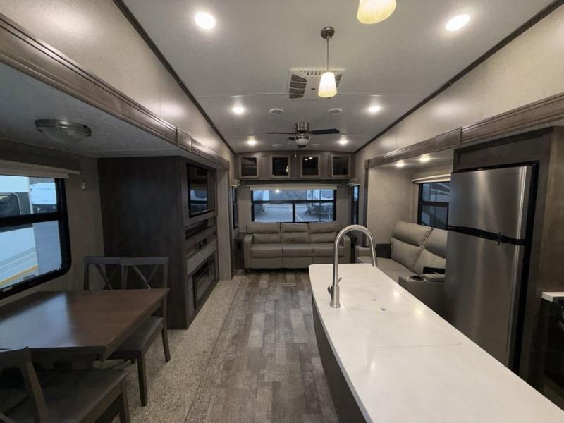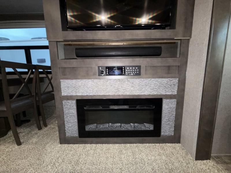 When it's time to upgrade your RV, choose this fifth wheel for maximum comfort, space, and features. The dual opposing slides in the kitchen area open up the whole space so your crew can relax comfortably, and you'll find a third slide out in the front private bedroom for even more space. This model includes a kitchen island so the chef of the family will have more counter space and the large pantry can hold all of the dry goods and snacks. You'll also find an outside kitchen which is great to grill up the catch-of-the-day on! After a day outdoors you can clean up in the full bath that includes a walk-in shower with a seat, then head to the rear living area to relax. Here, you'll enjoy the theater seat that sits directly across from the fireplace and TV and the hide-a-bed sofa will be perfect seating and sleeping space for the kids!