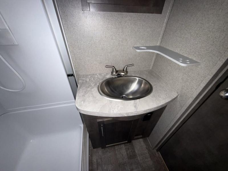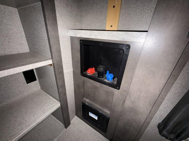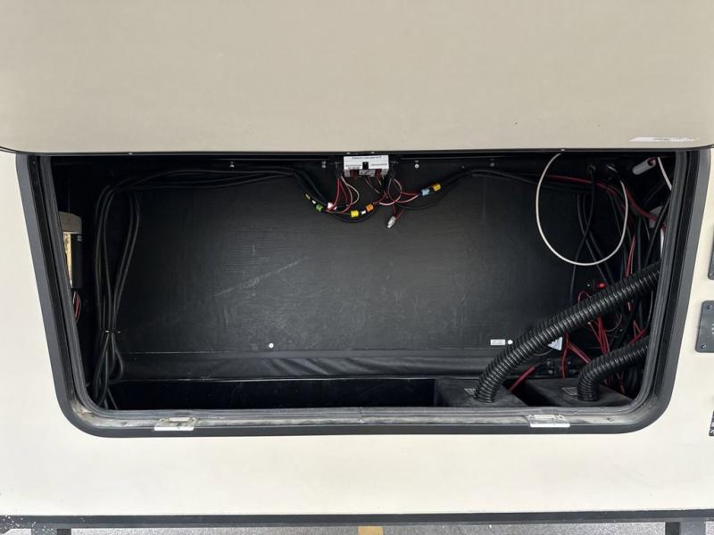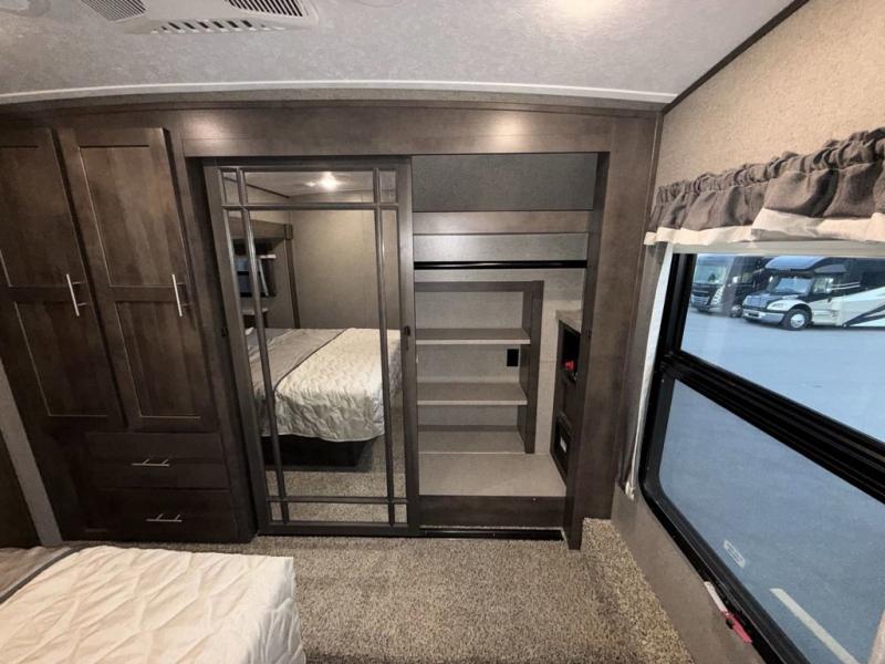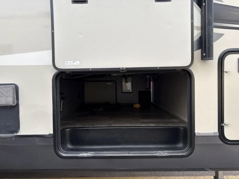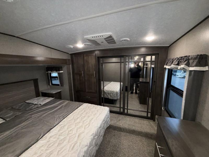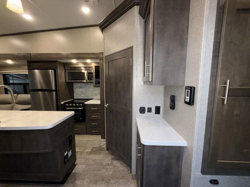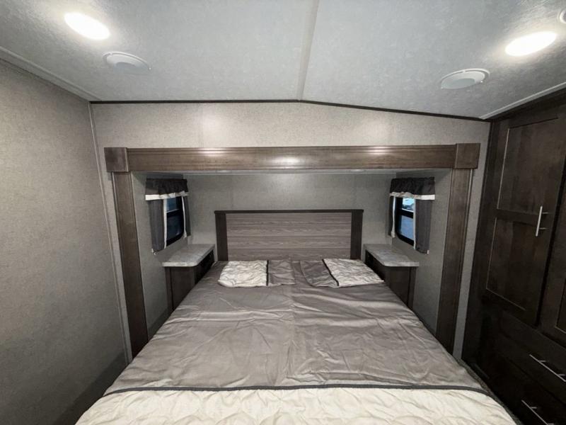 When it's time to upgrade your RV, choose this fifth wheel for maximum comfort, space, and features. The dual opposing slides in the kitchen area open up the whole space so your crew can relax comfortably, and you'll find a third slide out in the front private bedroom for even more space. This model includes a kitchen island so the chef of the family will have more counter space and the large pantry can hold all of the dry goods and snacks. You'll also find an outside kitchen which is great to grill up the catch-of-the-day on! After a day outdoors you can clean up in the full bath that includes a walk-in shower with a seat, then head to the rear living area to relax. Here, you'll enjoy the theater seat that sits directly across from the fireplace and TV and the hide-a-bed sofa will be perfect seating and sleeping space for the kids!