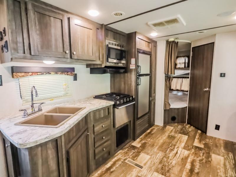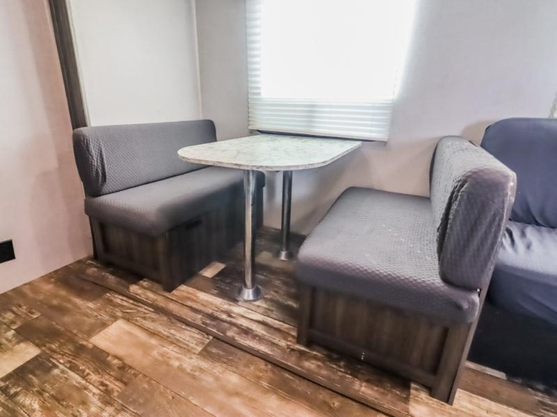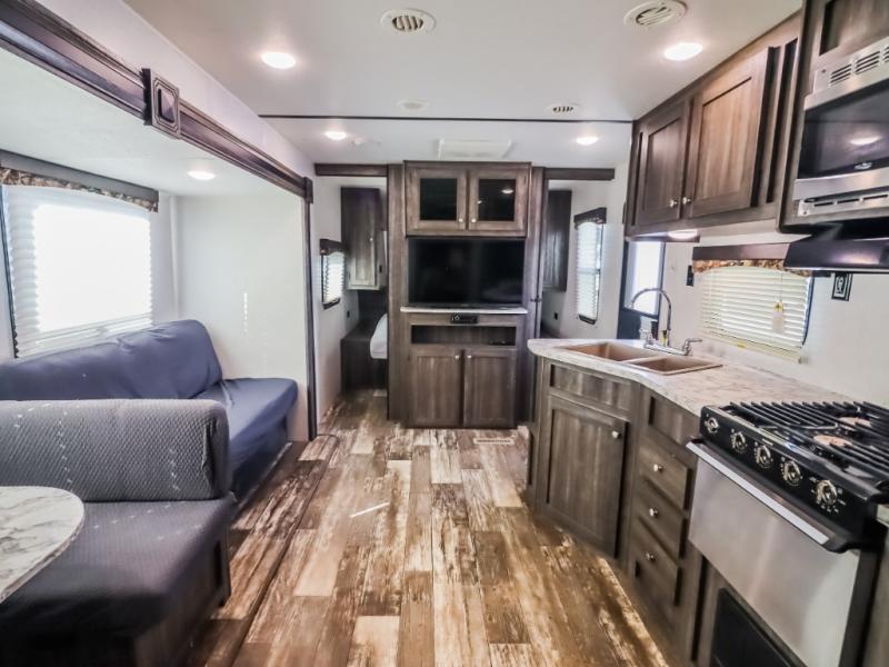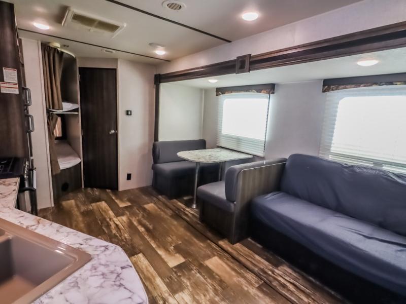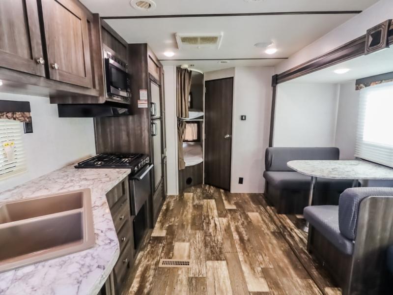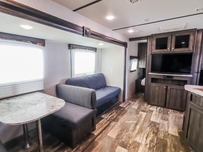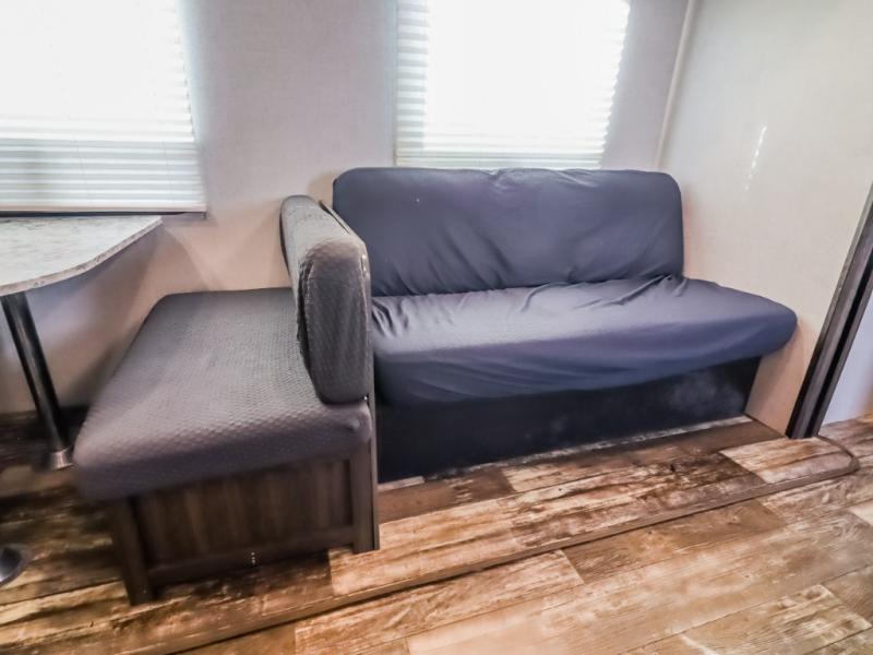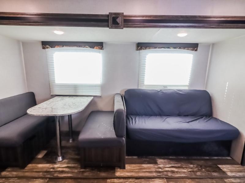This isn't just any mundane travel trailer, it's your next home away from home! The kiddos will love having their own set of rear bunk beds and if they have a friend or two that wants to come along then you can easily transform either the sofa or booth dinette into sleeping spaces. You will enjoy having your own private retreat with the front bedroom featuring a queen bed so you can start each day re-charged and ready to go. The rear corner bathroom will also help you feel re-freshed each morning too!