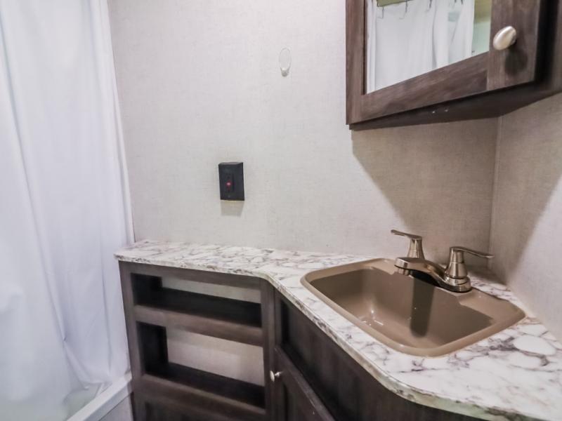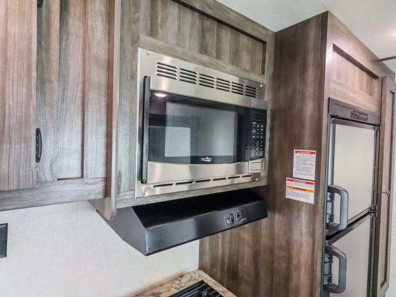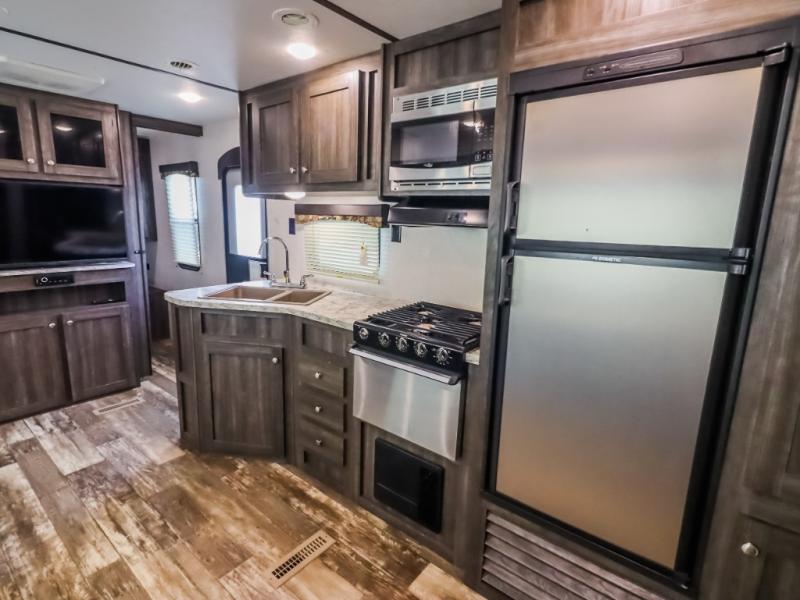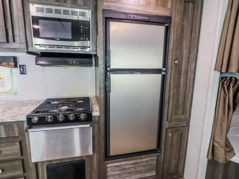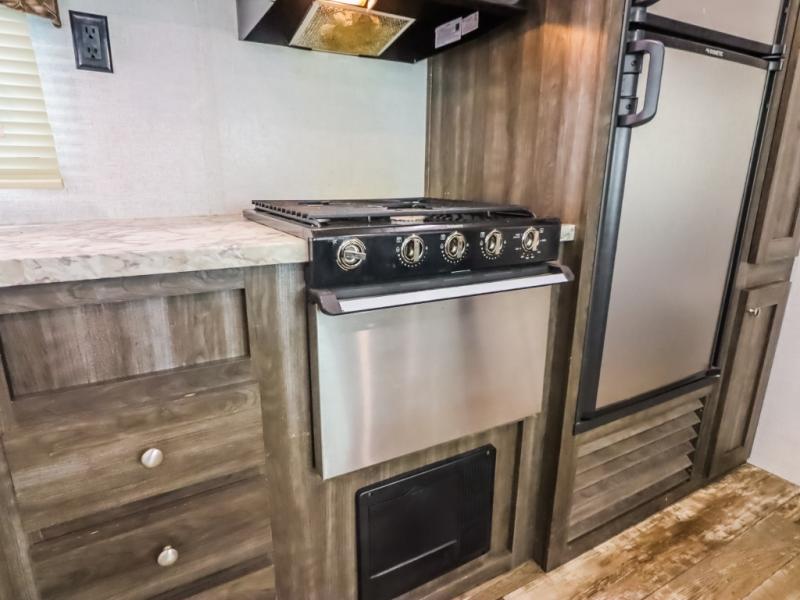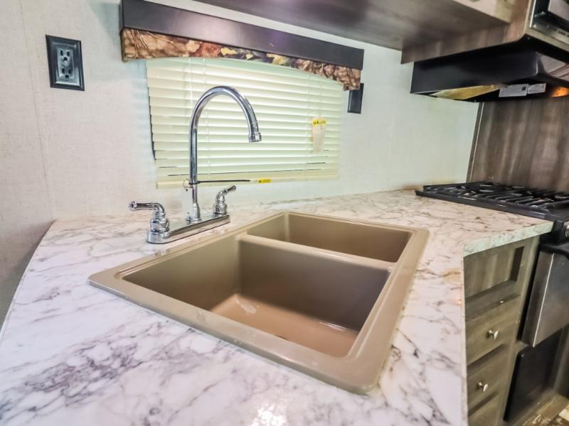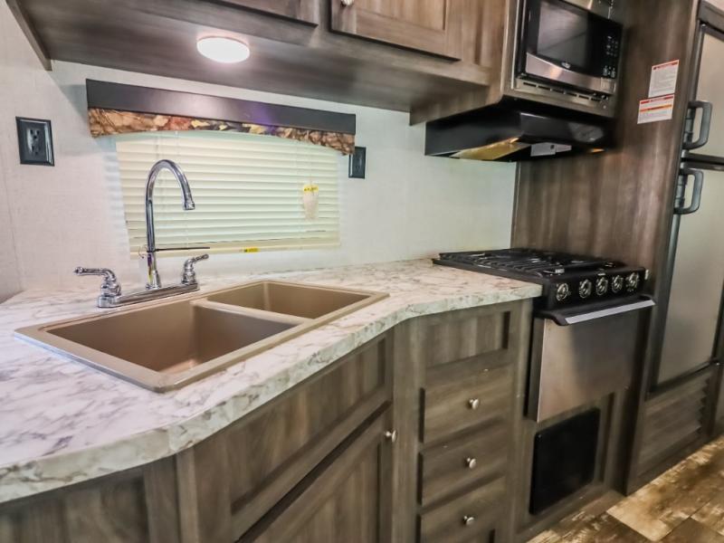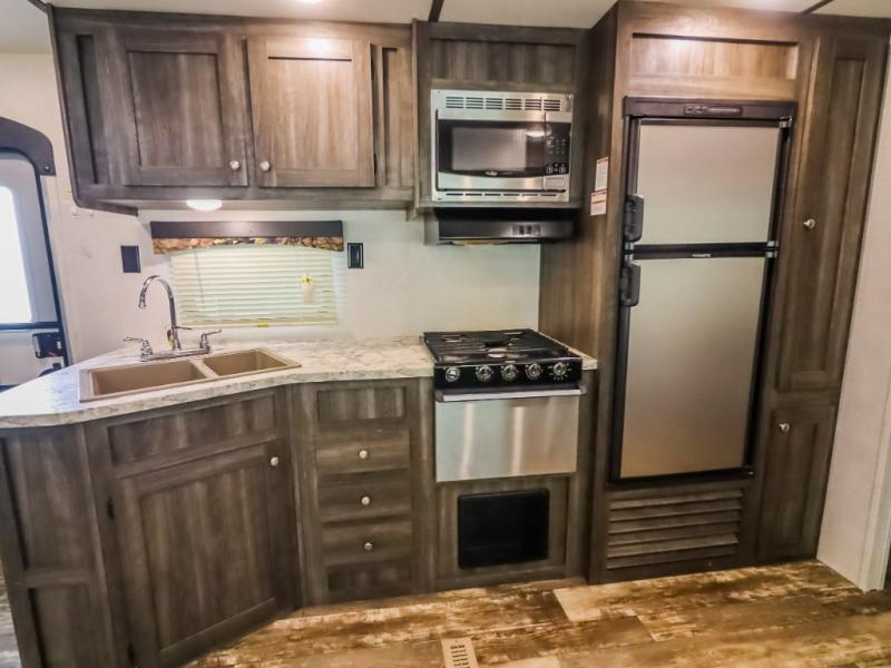Every one of these Starcraft Mossy Oak travel trailers are carefully assembled so you get the most out of your outdoor experience. With a fully walkable Magnum roof system, flexible LP lines for less corrosion, and a fiberglass insulation, you can take this trailer anywhere you need to go. The power awning features LED lighting and integrated speakers so you can jam out while you watch the rain trickle down. By having no carpet throughout the entire trailer it creates a kid and pet friendly trailer too. The tinted safety-glass windows and pleated night shades provide you with the same at home privacy. The forced air heated and enclosed underbelly is just one of the many reasons why you should choose a Starcraft Mossy Oak travel trailer today!