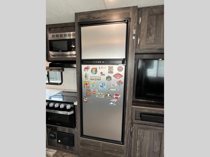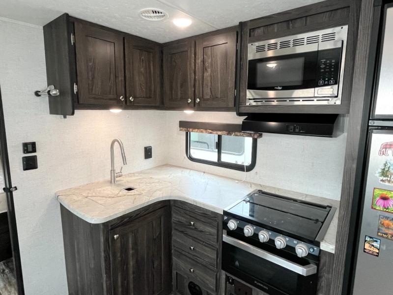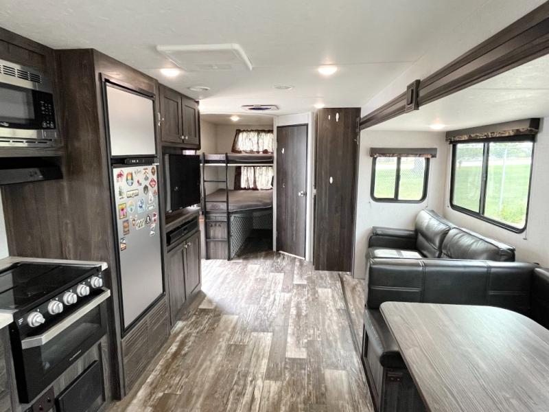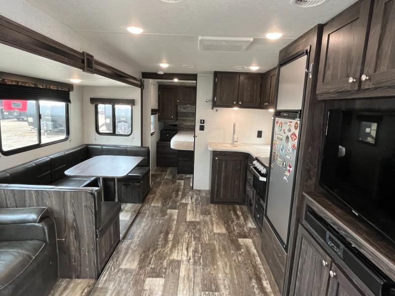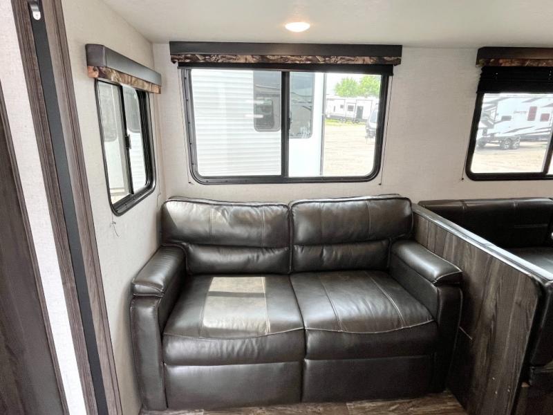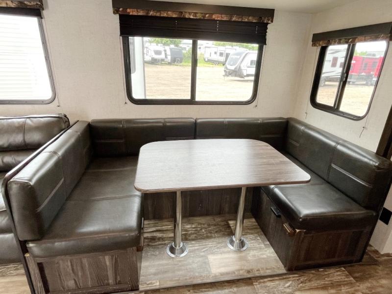 A full bathroom, full kitchen amenities, an outdoor kitchen, and sleeping space for ten is what makes this Mossy Oak Ultra Lite so exceptional! The interior won't feel cramped because the large slide will open up the central living area so that you can sit down and chat comfortably on the jackknife sofa or U-shaped dinette. And the private bedroom will be a great place to change your outfit or get ready for bed, plus the bunk beds are a kid's favorite bedding choice.