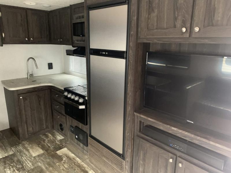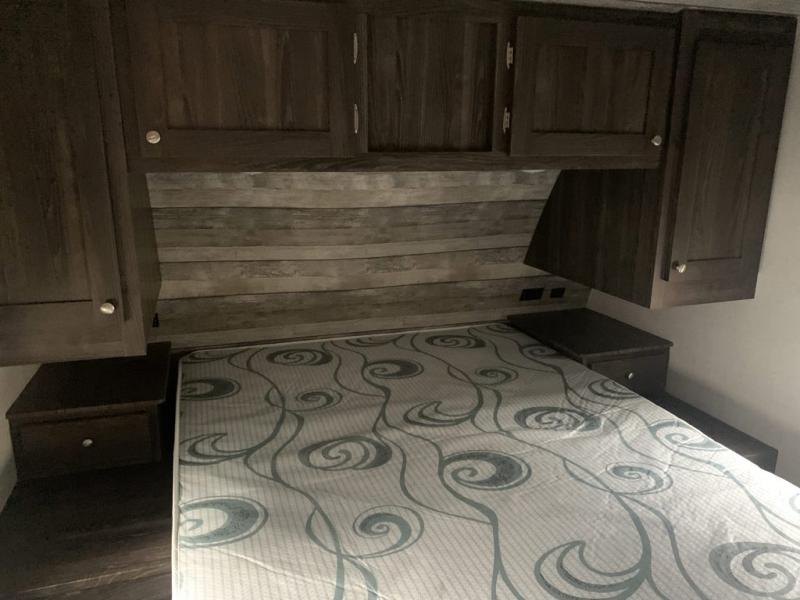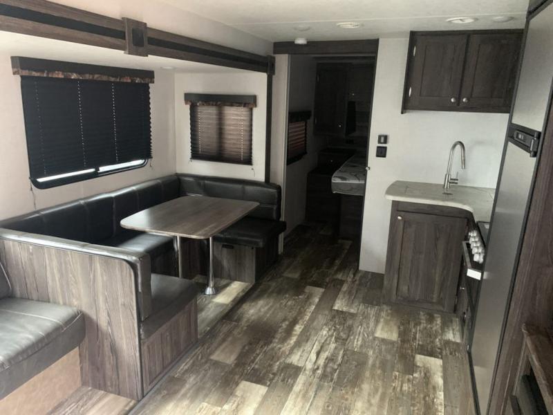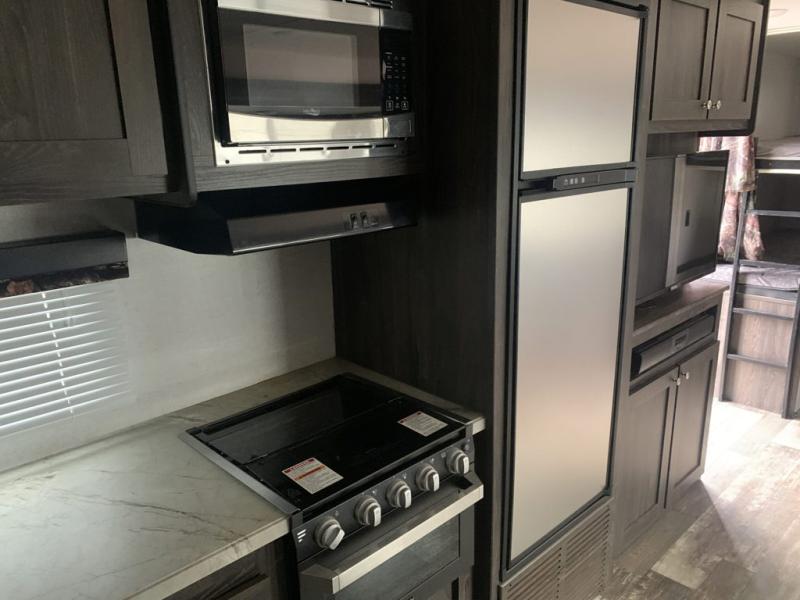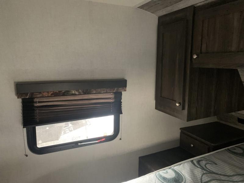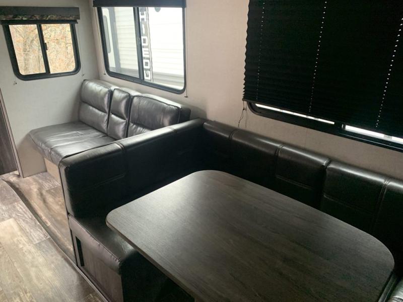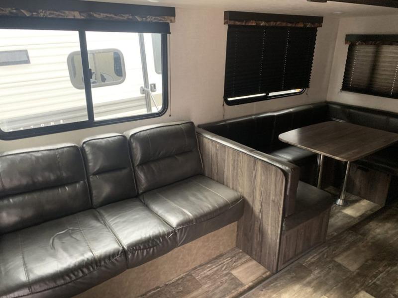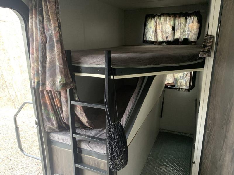 A full bathroom, full kitchen amenities, an outdoor kitchen, and sleeping space for ten is what makes this Mossy Oak Ultra Lite so exceptional! The interior won't feel cramped because the large slide will open up the central living area so that you can sit down and chat comfortably on the jackknife sofa or U-shaped dinette. And the private bedroom will be a great place to change your outfit or get ready for bed, plus the bunk beds are a kid's favorite bedding choice.