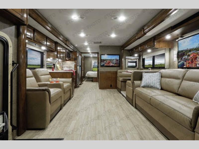 You won't want to travel any other way after stepping inside this motorhome! It features a rear private bedroom with a king-size Tilt-A-View inclining bed, a large wardrobe to keep your clothes neat, and a 32" TV for those nights when you just can't fall asleep. The full bathroom features everything you will need to get squeaky clean each morning, and across from the bathroom there is an area prepped for you to add the optional stackable washer/dryer so that you can extend your trip even longer with clean clothes. The 68" sofa bed, the 68" incliner theater seating, and the booth dinette not only provide seat belt seating, but also comfortable places to relax on while you watch your favorite shows on the 49" TV or the 40" TV!