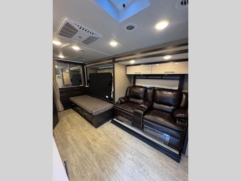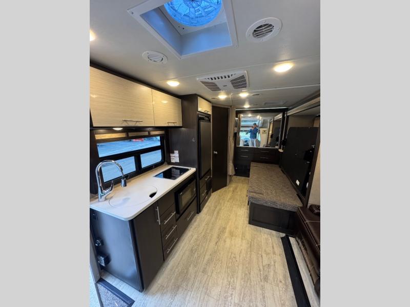 Get ready to set out to new destinations in a Compass Class C diesel motorhome. Along the exterior portion of the Compass you will find a Vacu-Bond laminated roof, walls, and floors with block foam insulation. Your extra camping gear can be stored in the Rotocast storage compartments with lights, and there is a power patio awning with integrated LED lights which will allow you to sit outside just a bit longer each night. The interior decor of the Compass has a modern and classy look with its residential vinyl flooring, Euro-style cabinet doors, and pressed laminate countertops.