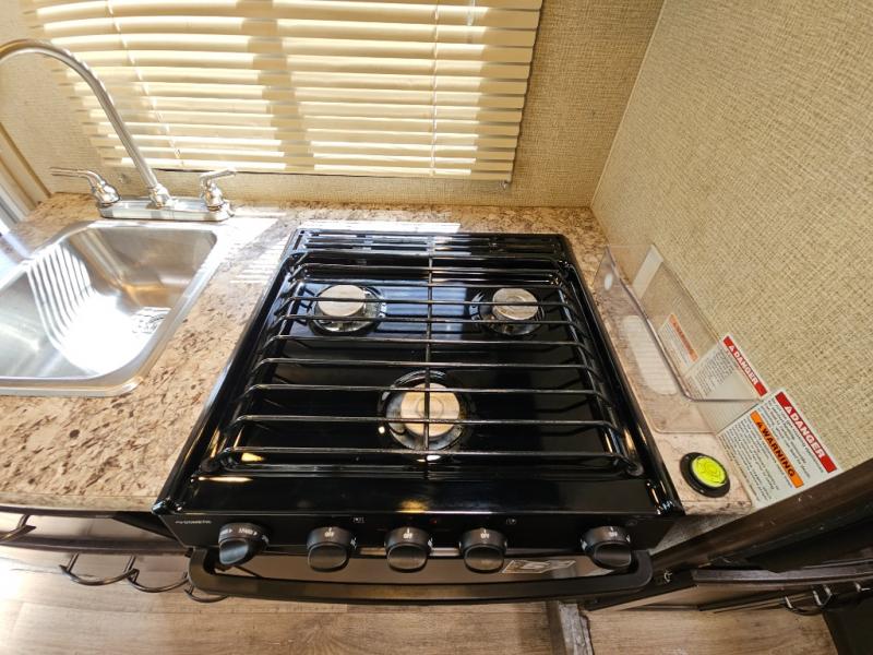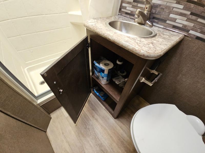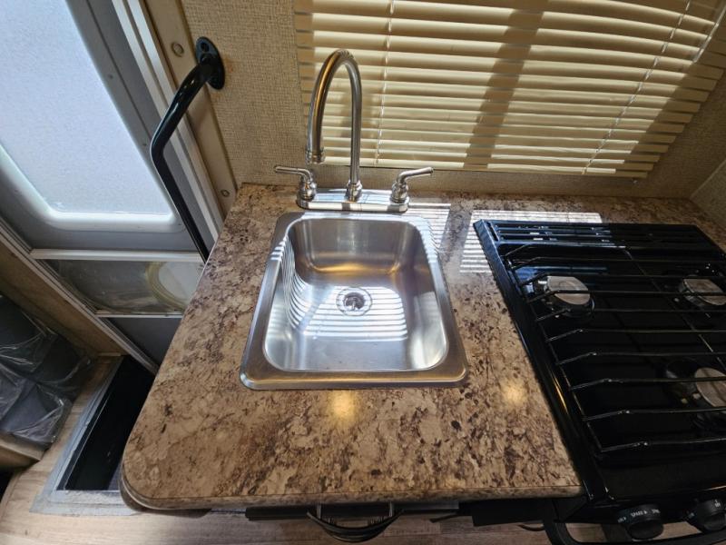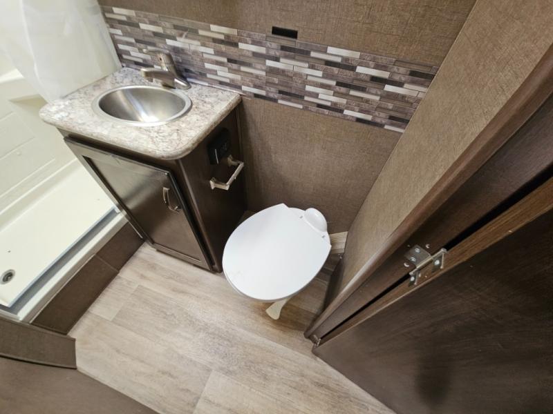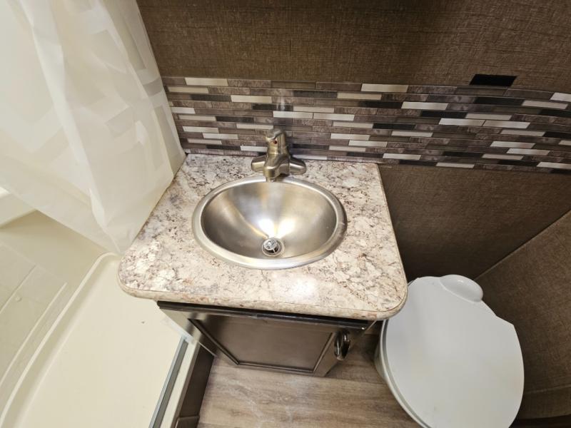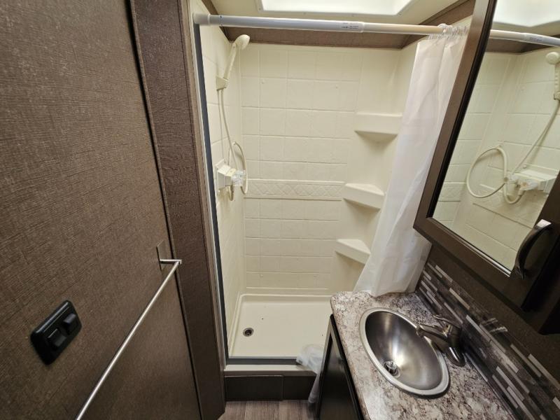 With any Four Winds Class C gas motorhome, you will enjoy the ease of driving and the affordable price. On the interior you will find residential vinyl flooring, high-sheen cabinetry with nickel finish hardware, and laminate countertops which make it easy to clean after a weekend getaway or an extended vacation. The stainless steel bathroom sink and foot flush porcelain toilet provide added convenience every where you stop, and the skylight above the shower is an exceptional feature that brings in the morning sunlight and brightens up the interior.