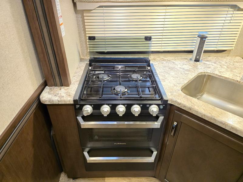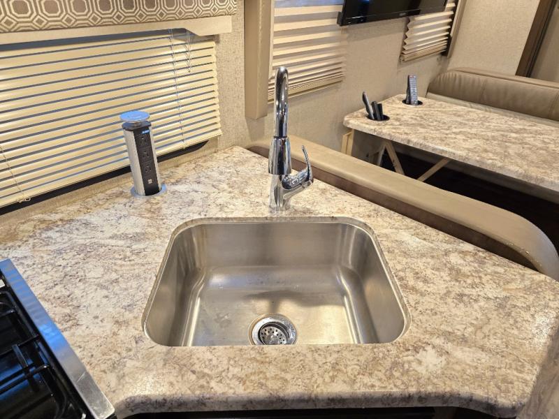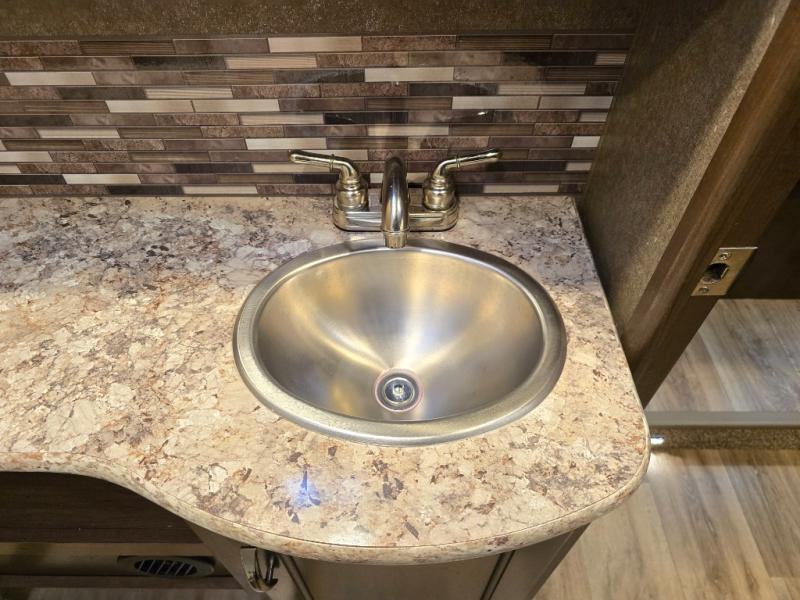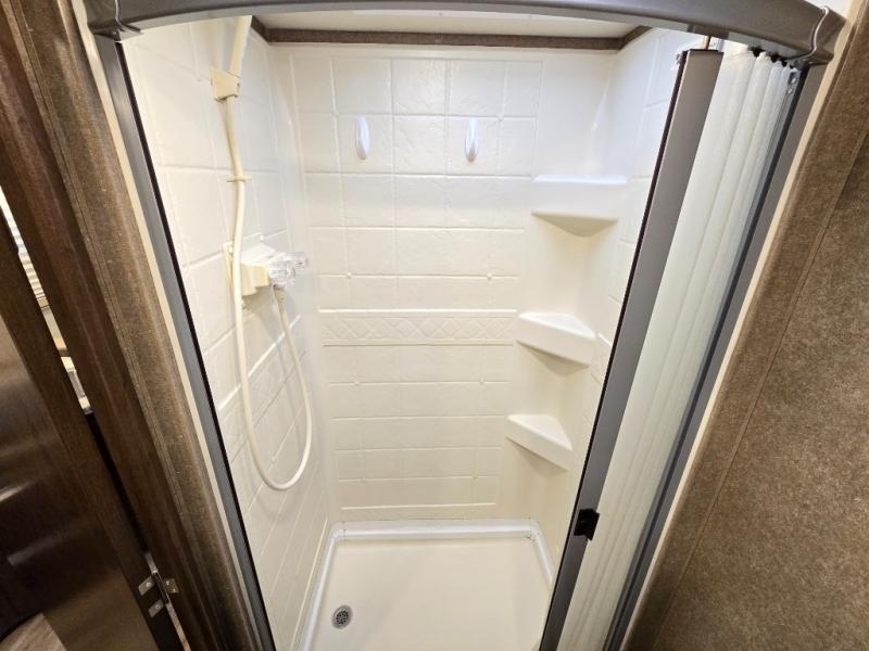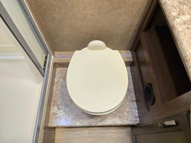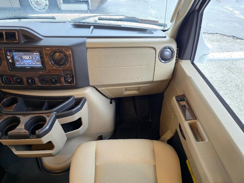 With any Four Winds Class C gas motorhome, you will enjoy the ease of driving and the affordable price. On the interior you will find residential vinyl flooring, high-sheen cabinetry with nickel finish hardware, and laminate countertops which make it easy to clean after a weekend getaway or an extended vacation. The stainless steel bathroom sink and foot flush porcelain toilet provide added convenience every where you stop, and the skylight above the shower is an exceptional feature that brings in the morning sunlight and brightens up the interior.