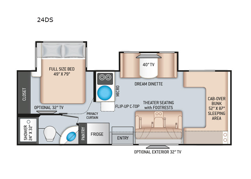 Take your family on countless extraordinary adventures with this Four Winds Sprinter Class C diesel motorhome! With two slides, this coach has plenty of interior living space for you to enjoy snuggling into the theater seating with footrests as you watch a movie together with the family on the 40" TV, and you will appreciate having a convection microwave as you heat up some popcorn to snack on during the movie. You will also appreciate having a 24" x 32" shower with a curved shower curtain in the full bathroom when you wake up in the morning so that you don't have to trek all the way down to the campground's public facilities just to clean up for the day.