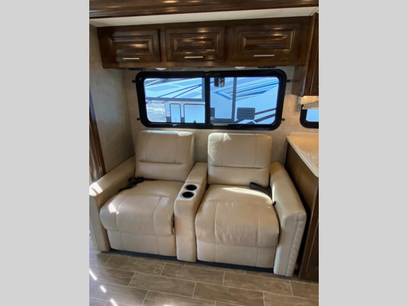 From the moment you walk in, you’ll notice how spacious and well-appointed this motorhome is. The open living area features plush seating with a sofa and dinette, perfect for dining, relaxing, or gathering with friends and family. Large windows surround the space, bringing in natural light and scenic views wherever you park. The entertainment center keeps everyone entertained while at camp, and the slide-outs expand the living area for even more room to stretch out.