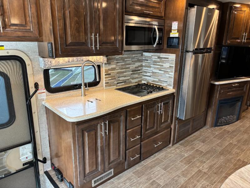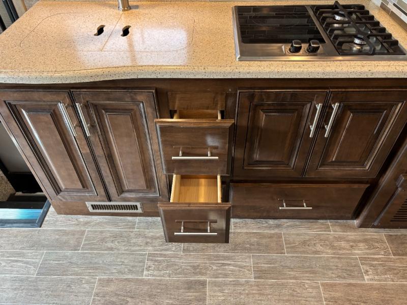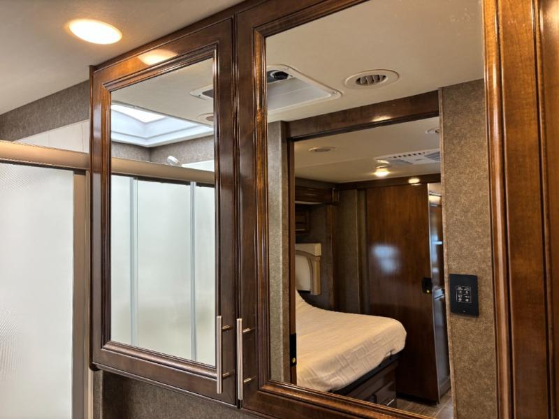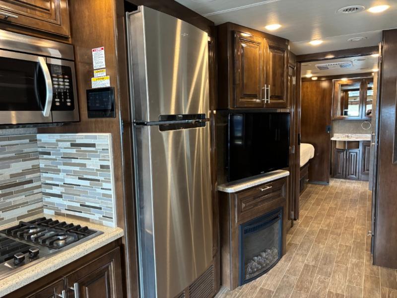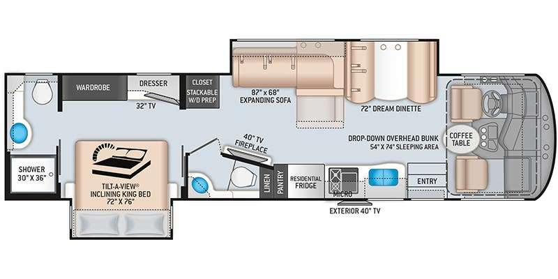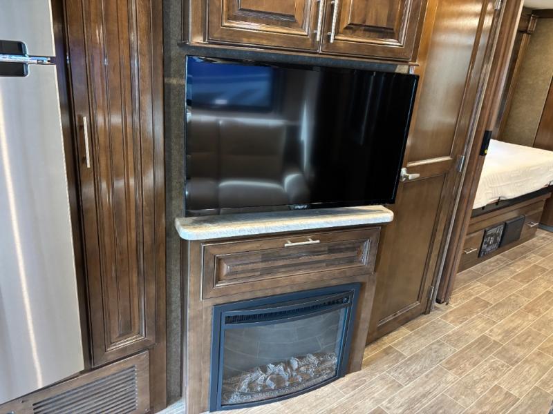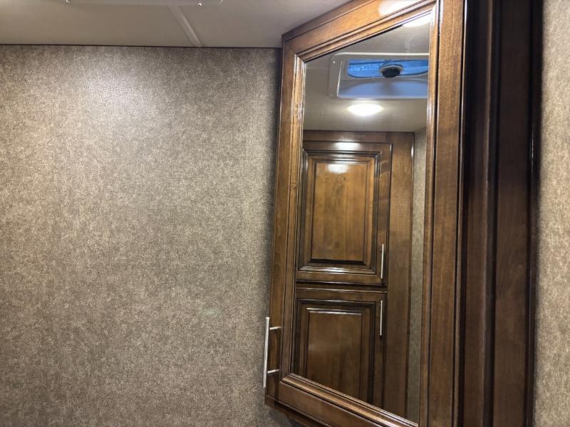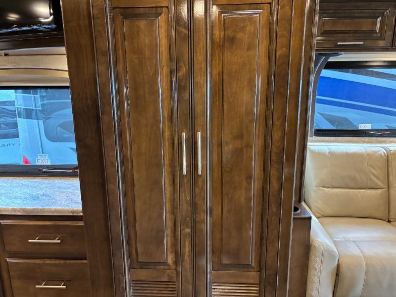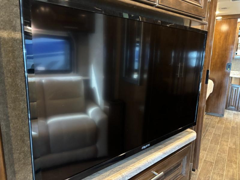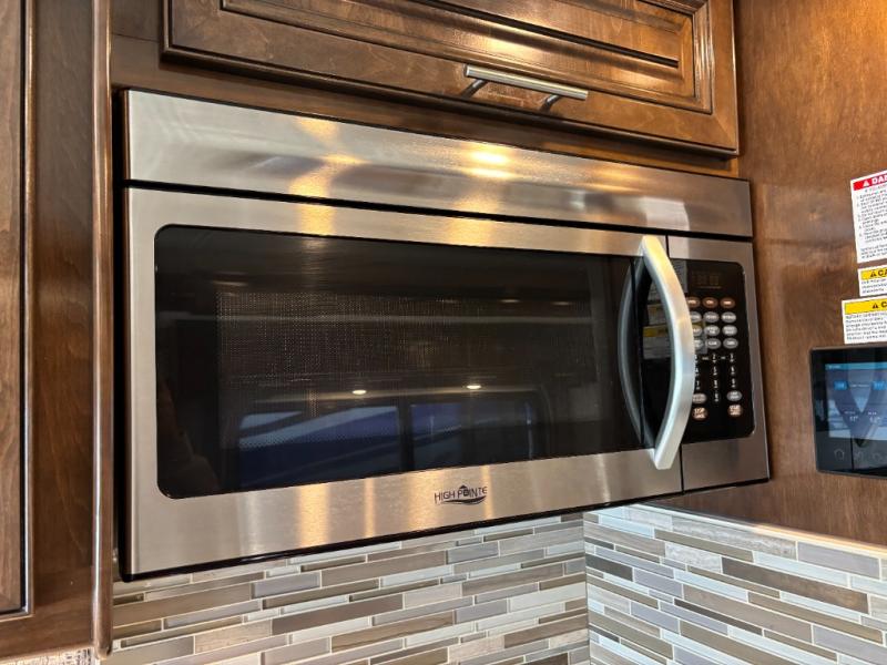 If you are looking for more interior space in your next RV and to include sleeping space for eight people, then this coach provides just that and more with a full wall slide out and a second slide out on the opposite side. In the living area you can relax on the furniture including the swivel captain's chairs and the theater seats. Above the sofa bed there is a retractable 49" TV and along the interior wall you will find a second TV for inside entertainment. Sleeping space can be found on the drop-down overhead cab bunk, on the furniture once set up for bedtime, and in the rear bedroom there is a Tilt-A-View inclining king bed for yourself! You will also love the kitchen appliances, the option to add a washer and dryer, and more!
