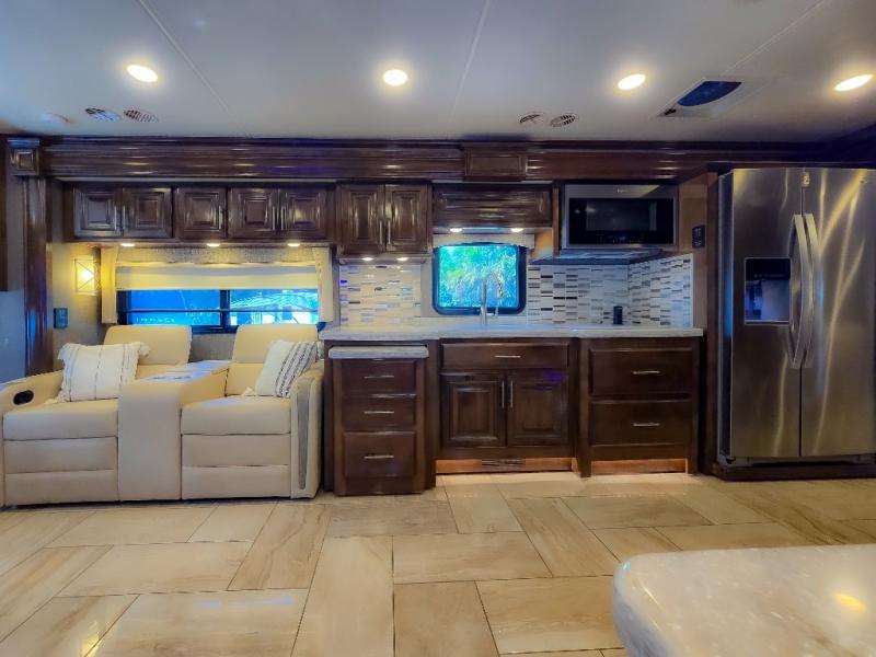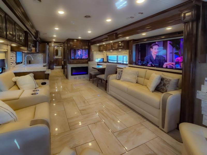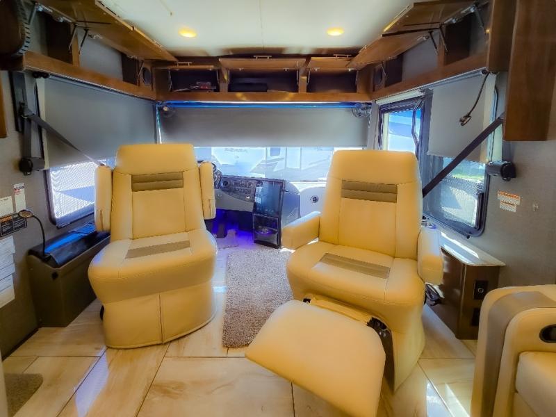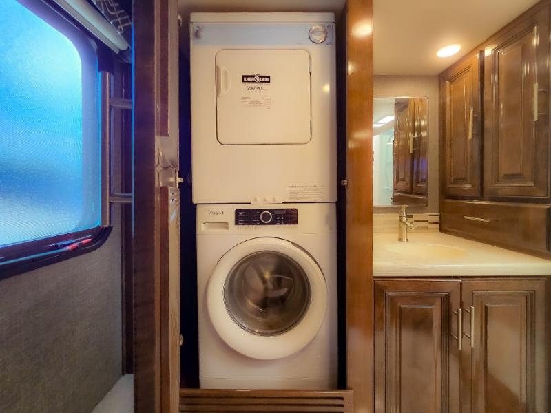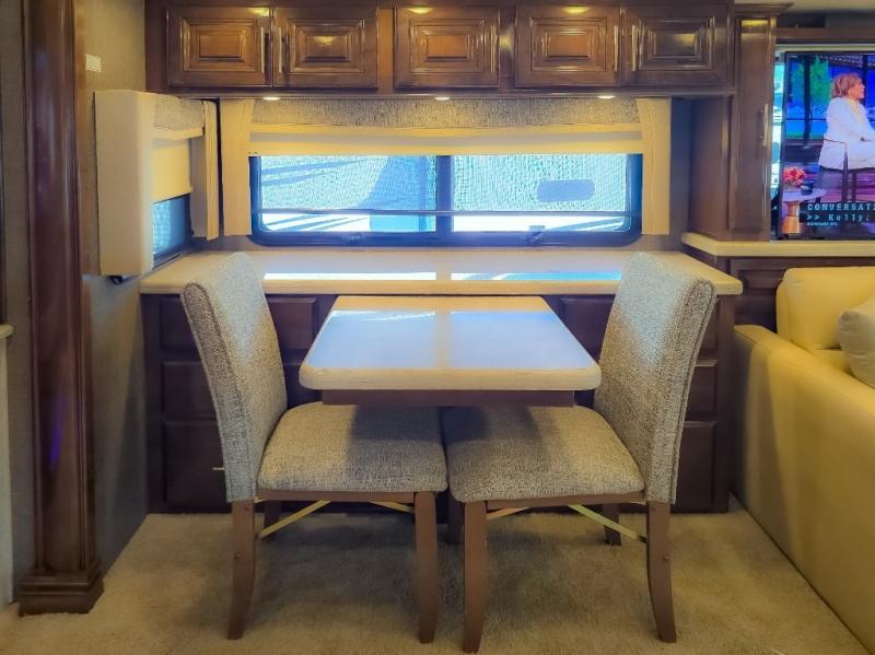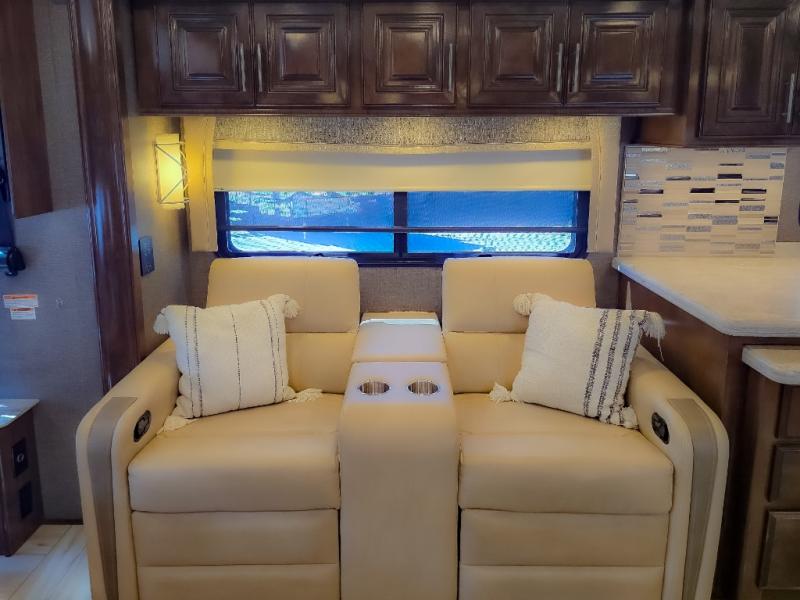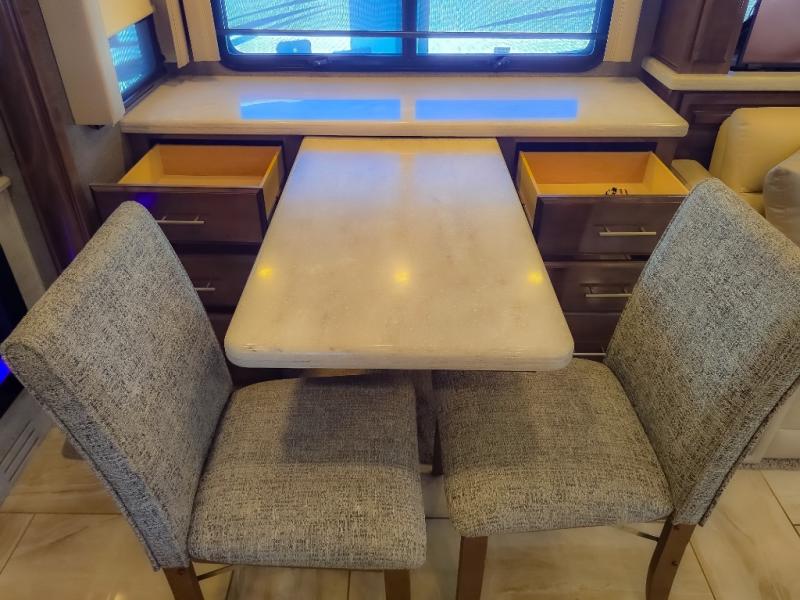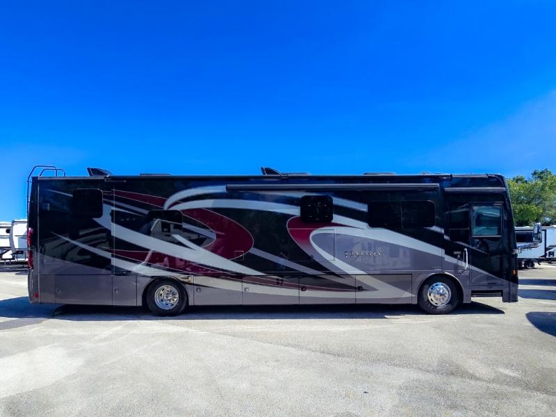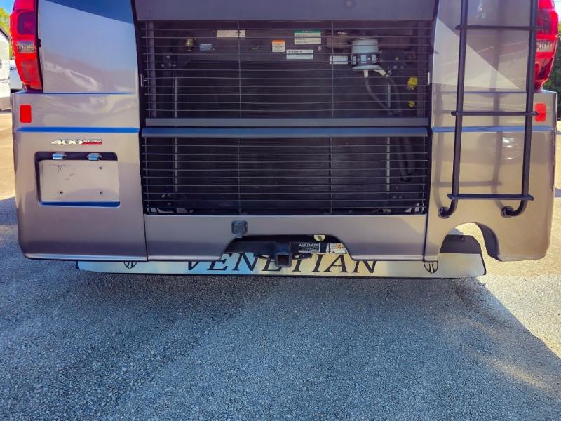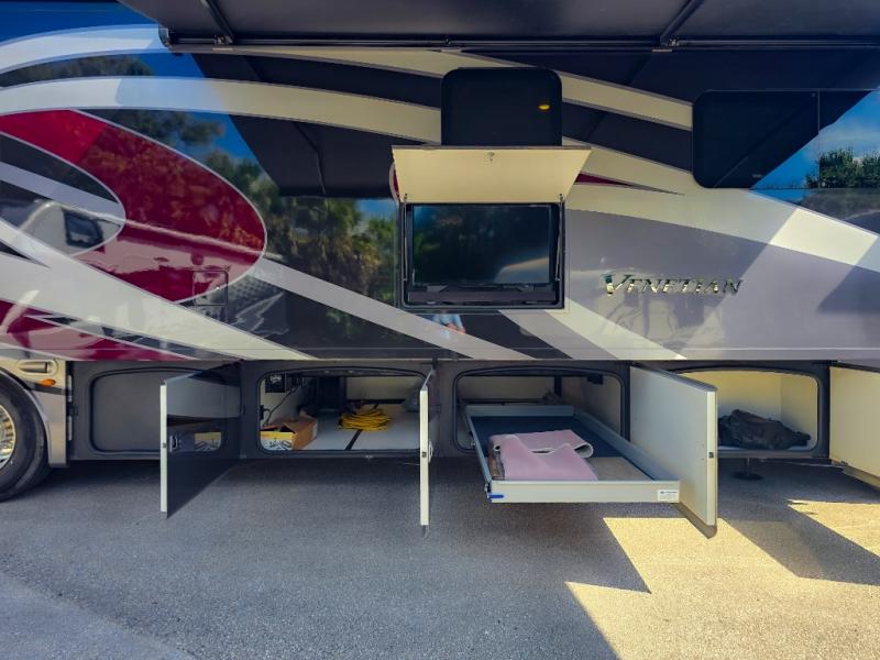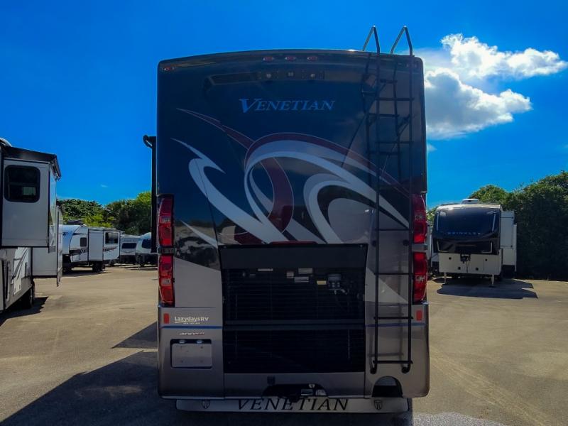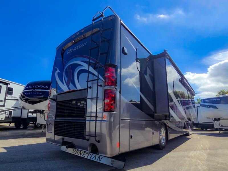 You can stop dreaming about all the places you would like to visit and begin enjoying the journey with this Venetian Class A diesel motorhome. From stepping foot into this coach and riding on comfortable furniture that include the captain's chairs, you will feel like you haven't been traveling for hours. Once you decide to set up at the RV park, you can take a shower in the rear full bathroom, start a load of laundry in the stackable washer and dryer, and take a nap on the king Tilt-A-View bed which will allow you to sit up while you read a book or surf the web. Your spouse might like to watch the big game on the exterior 39" TV or one of the interior TVs, like the retractable 55" Smart HDTV in the living area. If you enjoy cooking, the kitchen offers stainless steel appliances, even a convection microwave. You also have options to customize the furniture so that it's just the way you like it.
