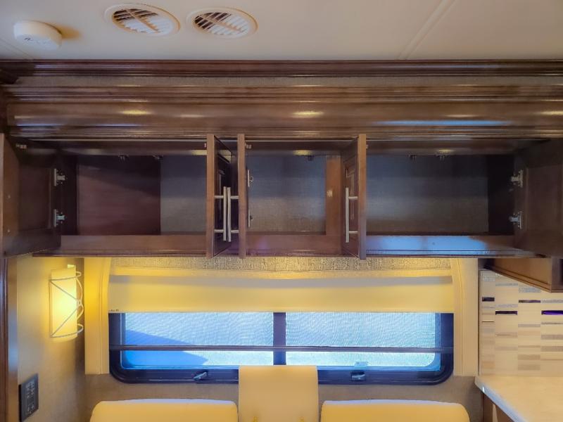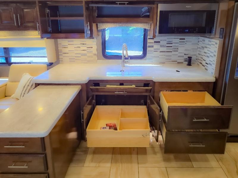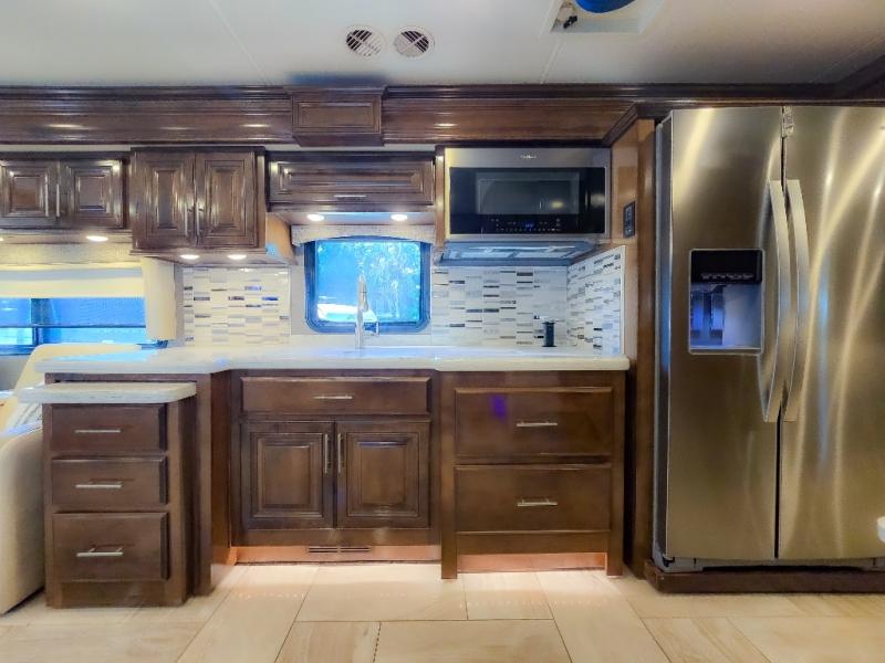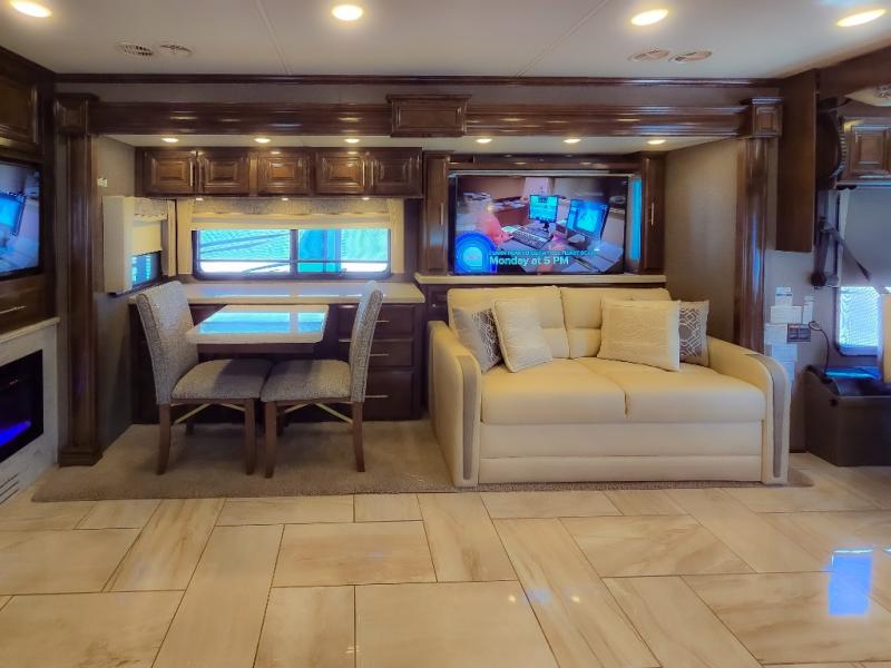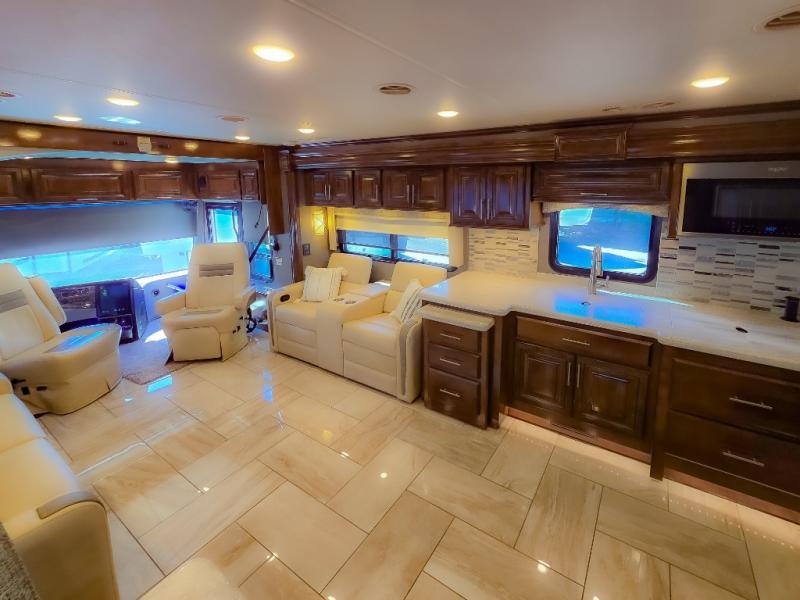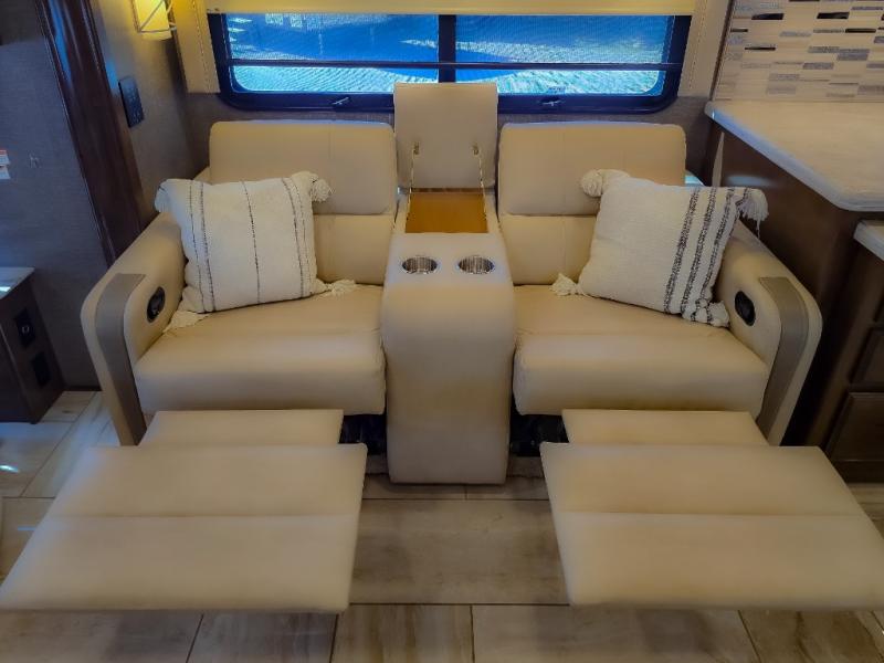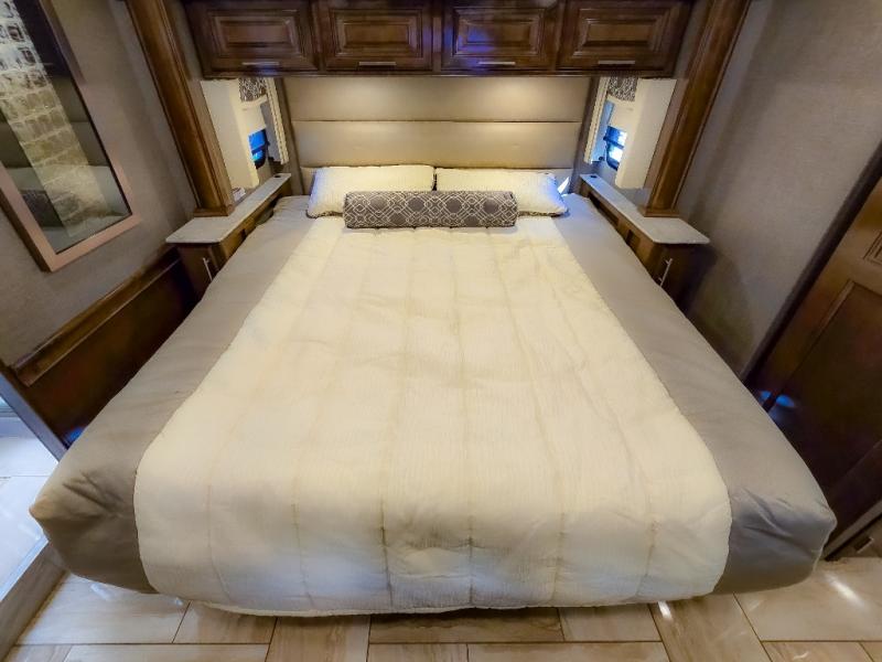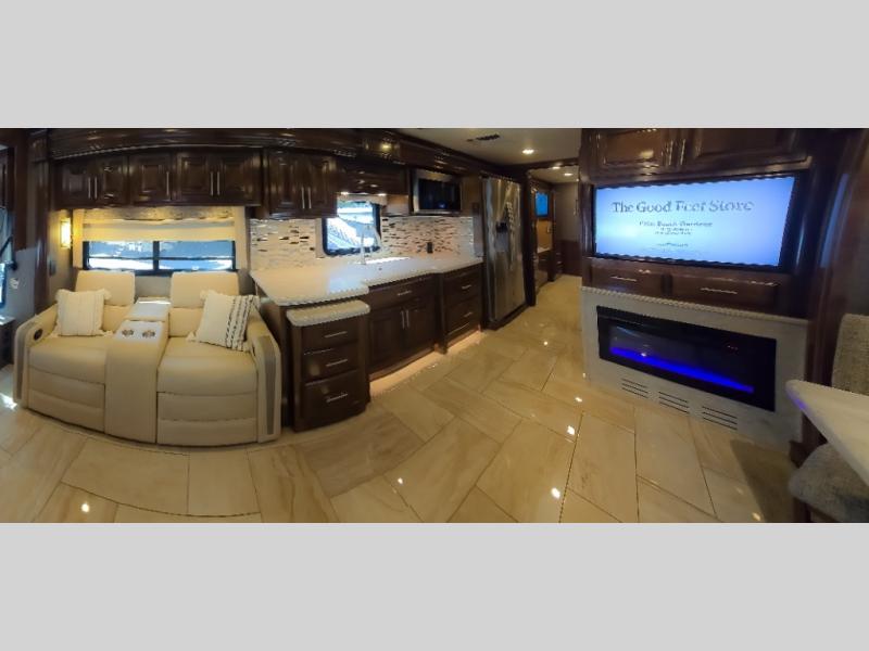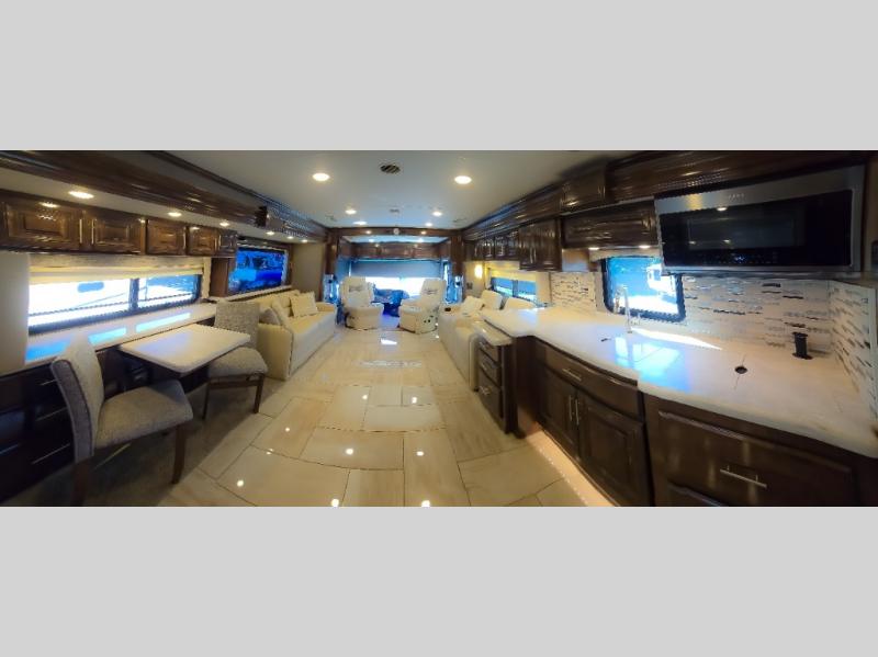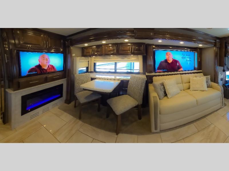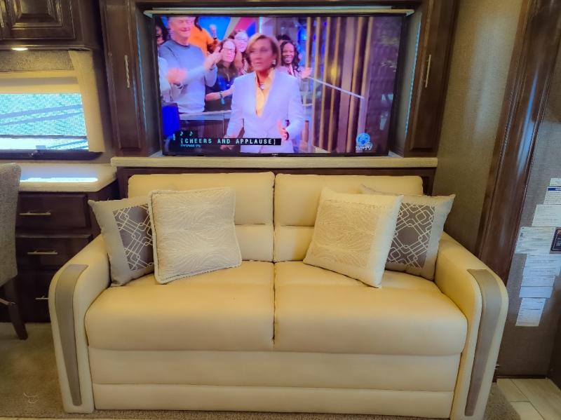 You can stop dreaming about all the places you would like to visit and begin enjoying the journey with this Venetian Class A diesel motorhome. From stepping foot into this coach and riding on comfortable furniture that include the captain's chairs, you will feel like you haven't been traveling for hours. Once you decide to set up at the RV park, you can take a shower in the rear full bathroom, start a load of laundry in the stackable washer and dryer, and take a nap on the king Tilt-A-View bed which will allow you to sit up while you read a book or surf the web. Your spouse might like to watch the big game on the exterior 39" TV or one of the interior TVs, like the retractable 55" Smart HDTV in the living area. If you enjoy cooking, the kitchen offers stainless steel appliances, even a convection microwave. You also have options to customize the furniture so that it's just the way you like it.