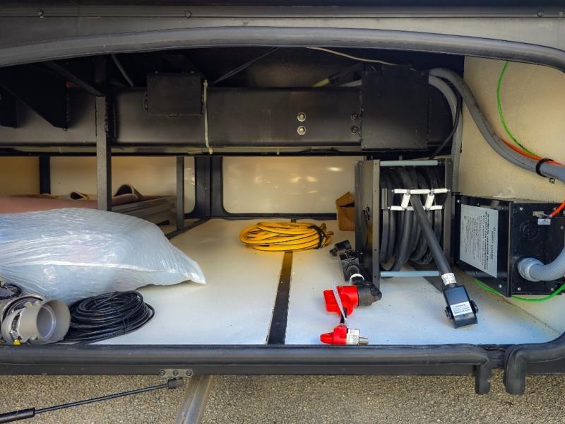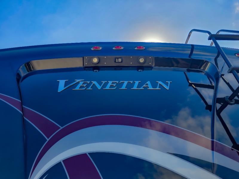 The Venetian Class A diesel motorhome by Thor Motor Coach is built on a Freightliner XC-R raised rail chassis with the Atlas foundation, and it includes Air-Ride suspension and a Cummins Onan RV QD 10,000 diesel generator for a comfortable ride and the ability to stop wherever you like. Some of the inside luxurious features include the Leatherette passenger seat with an electric footrest, the stainless steel residential refrigerator with an in-door ice and water dispenser, a central vacuum system with a toe-kick dustpan, and the stackable washer and dryer. You will also find that the Winegard TRAV'LER HD satellite dish, the Winegard ConnecT 2.0 WiFi/4G/TV antenna, and the RapidCamp+ multiplex wiring control system with app control and SurgeGuard will provide the technology you desire everywhere you travel.