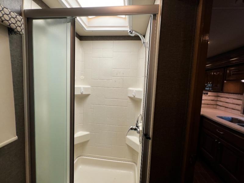 - Spacious shower with a glass door and skylight for extra light and headroom.