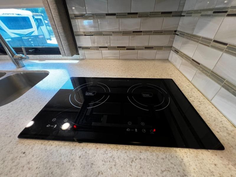 - Three-burner cooktop, oven, and convection microwave allow you to cook a variety of meals while on the road.