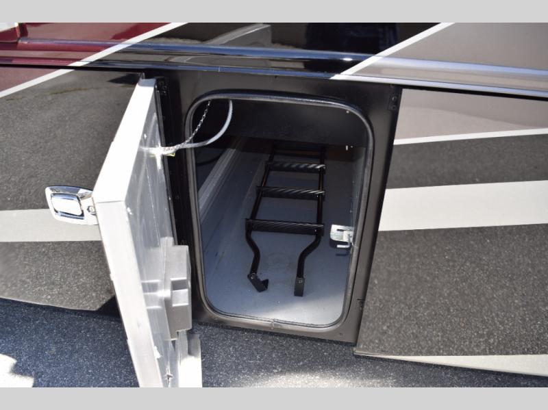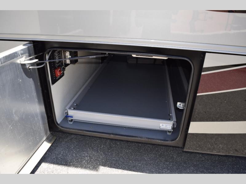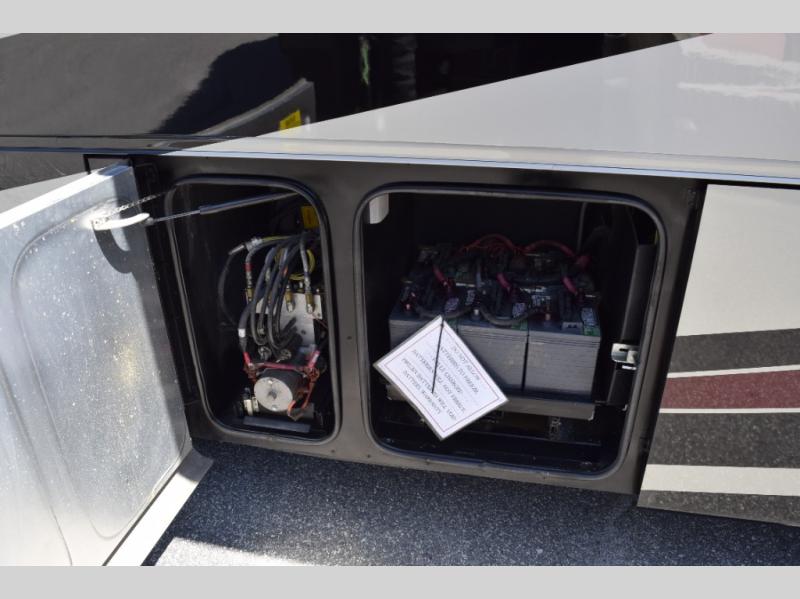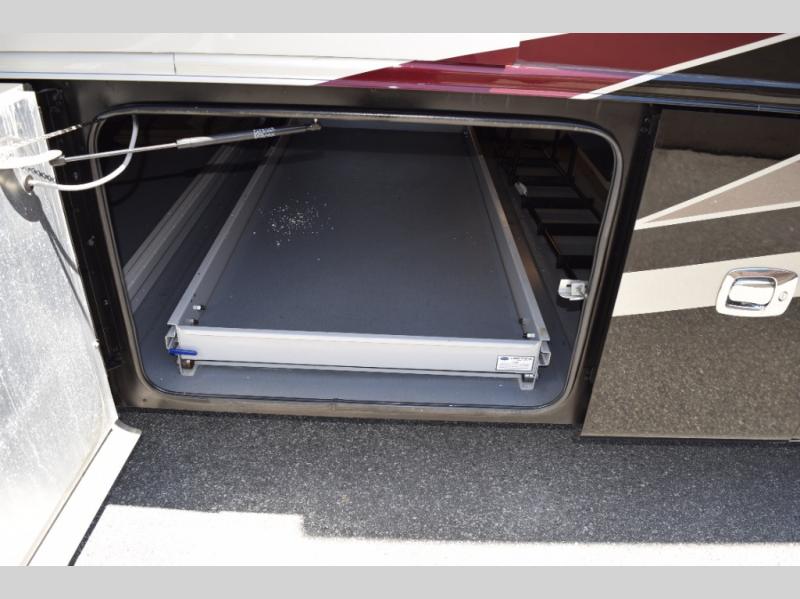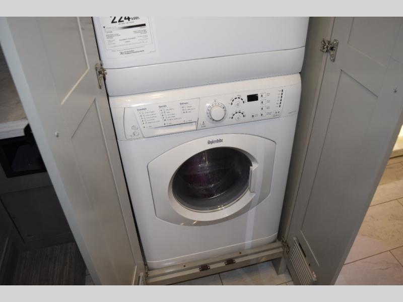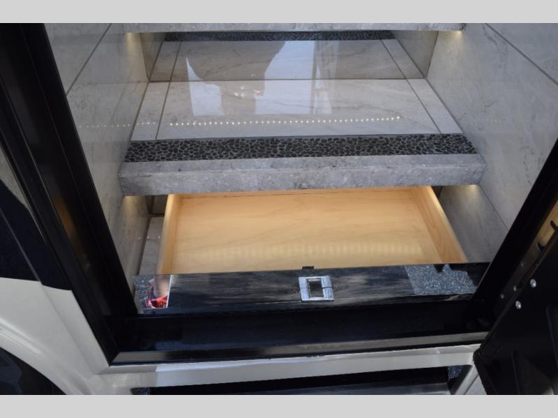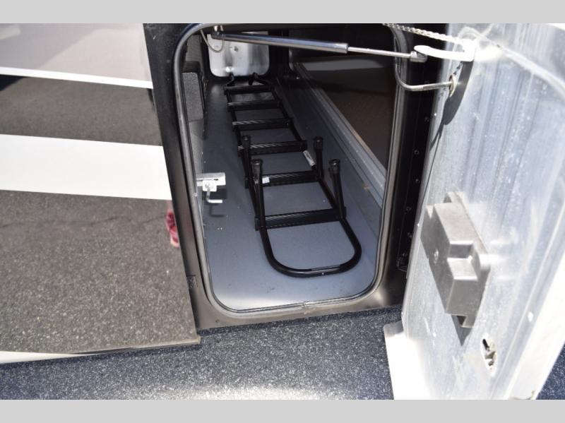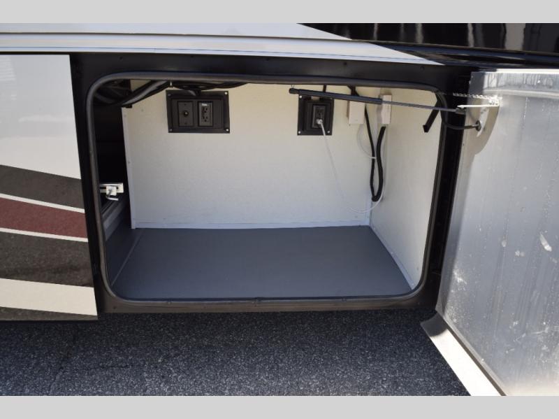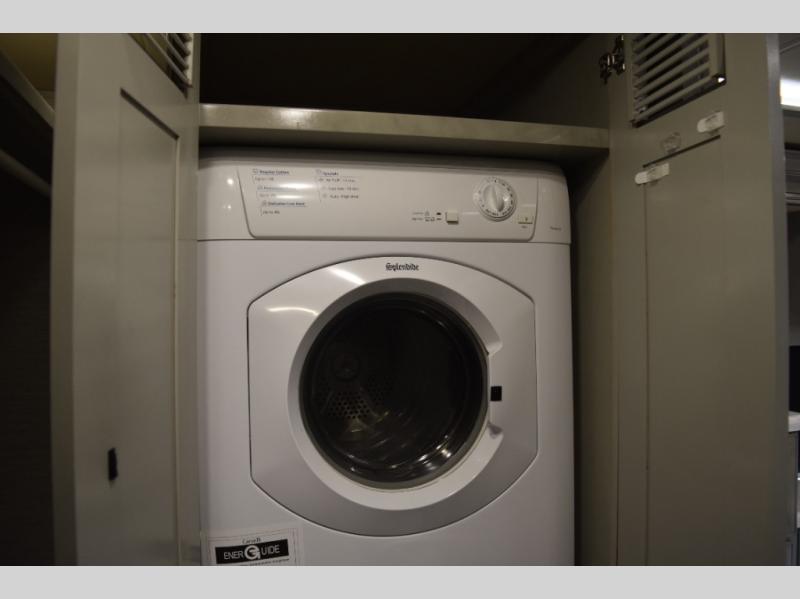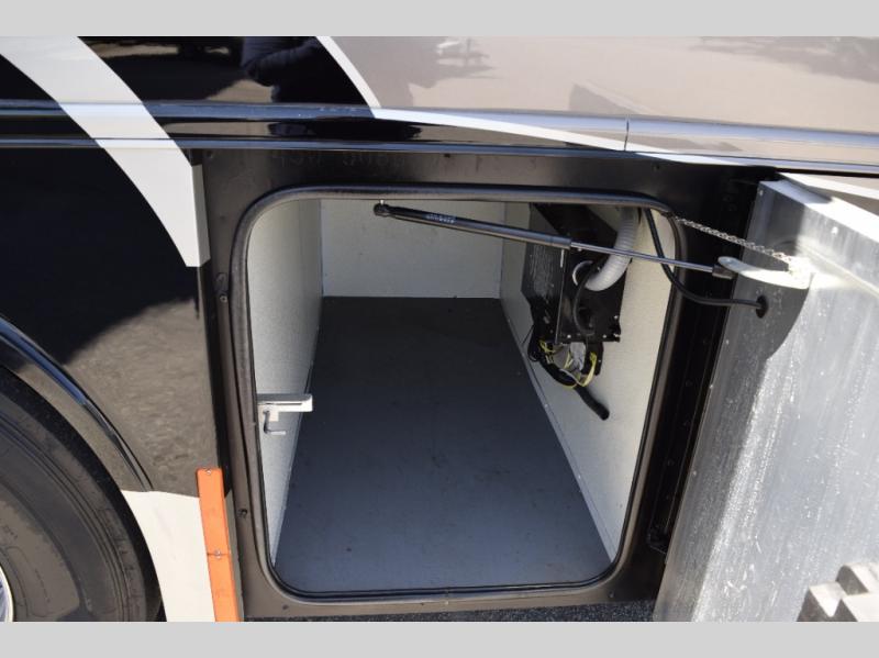On the outside, the pass-through basement storage and luggage compartment lights make it easy to load up all your gear for long trips. Girard electric door and patio awning set the stage for outdoor relaxation, while the Extraordinaire A/C system keeps things cool, and the hydronic heating system ensures you’re cozy no matter the weather.