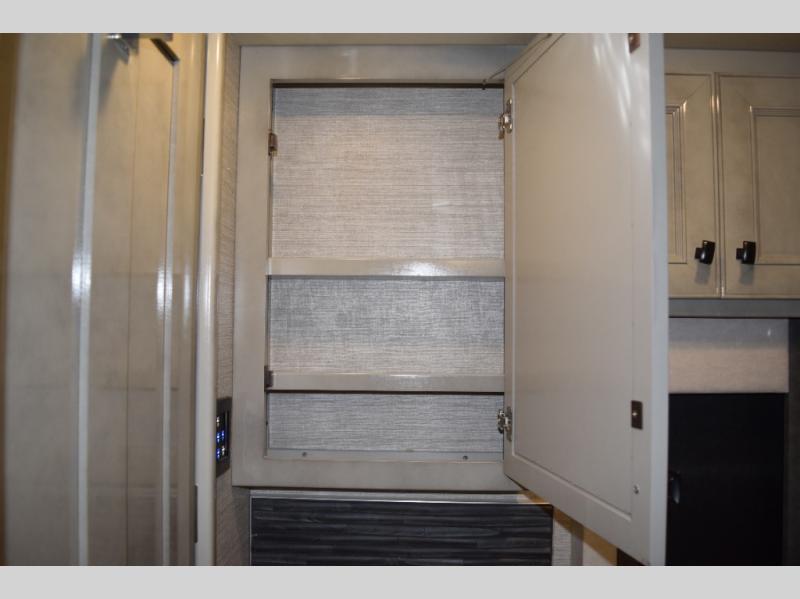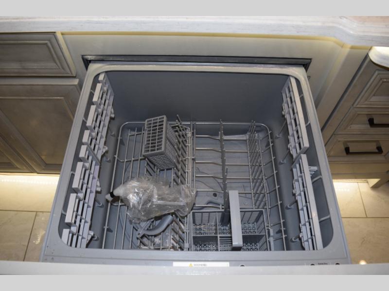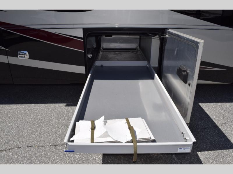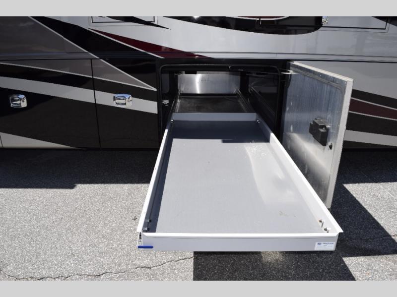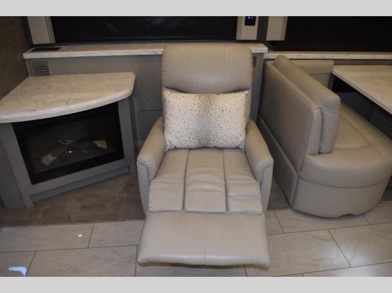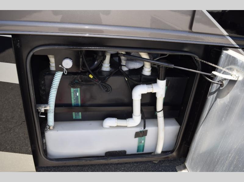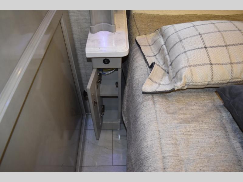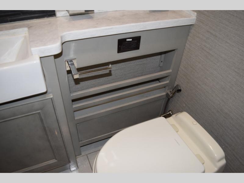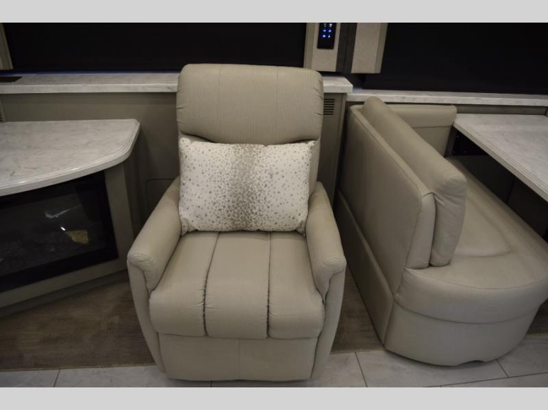 On the outside, the pass-through basement storage and luggage compartment lights make it easy to load up all your gear for long trips. Girard electric door and patio awning set the stage for outdoor relaxation, while the Extraordinaire A/C system keeps things cool, and the hydronic heating system ensures you’re cozy no matter the weather.