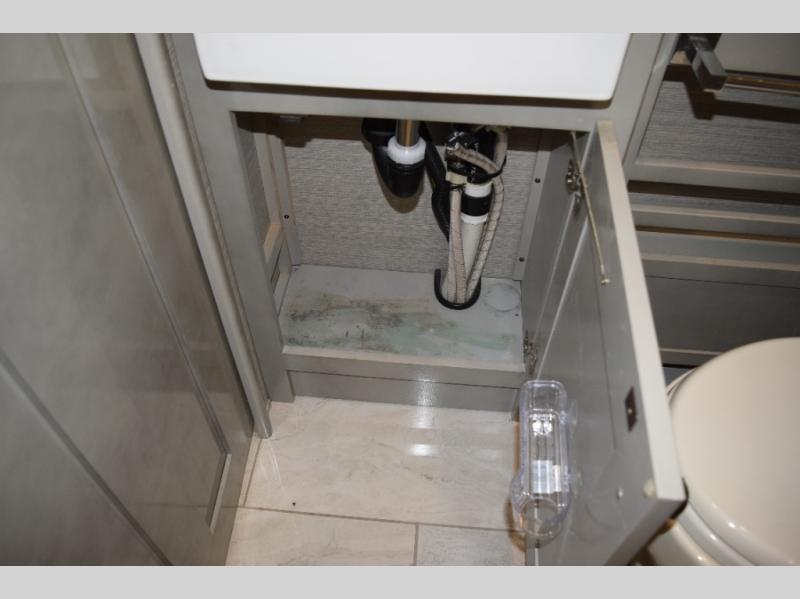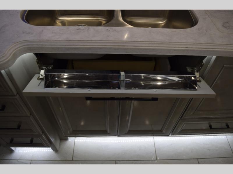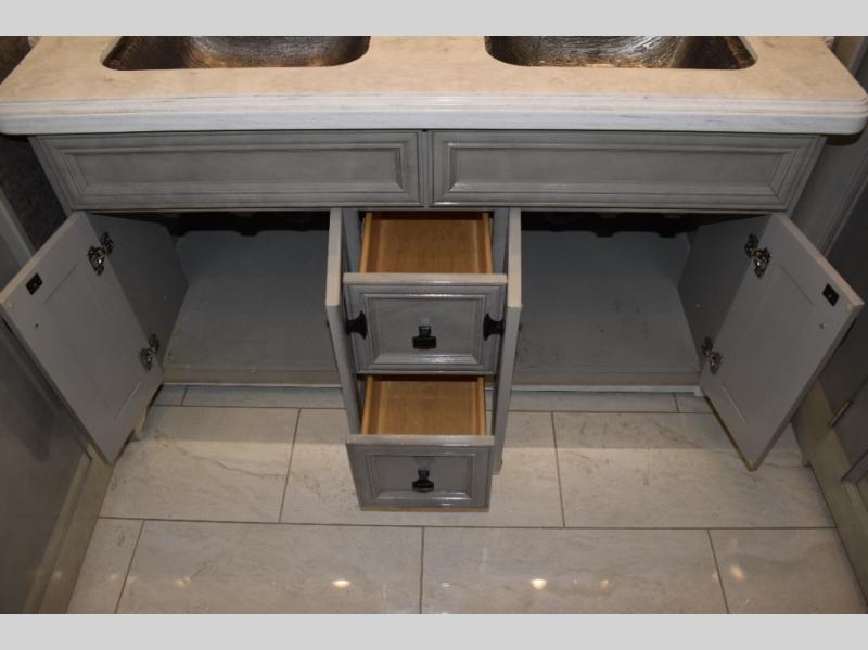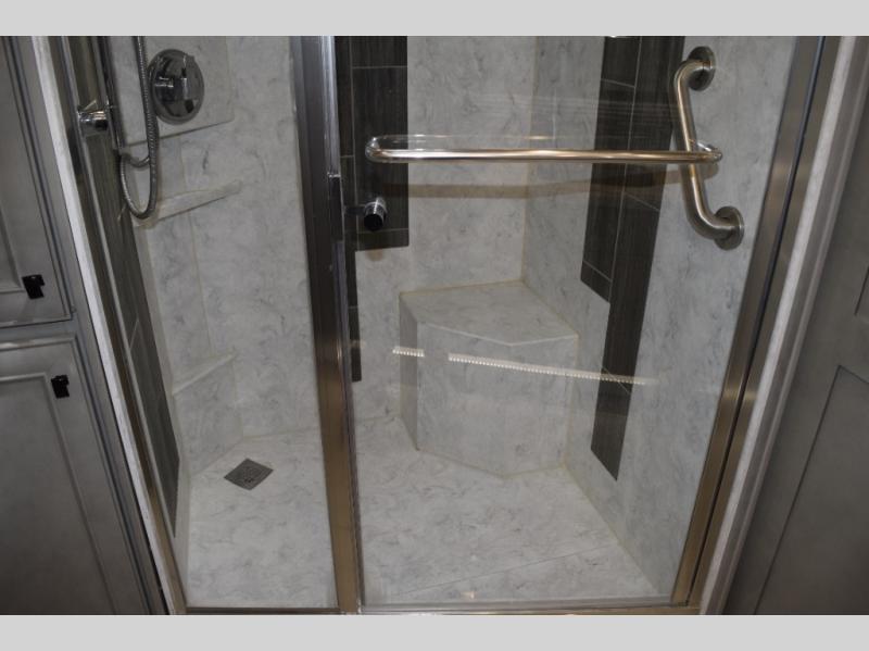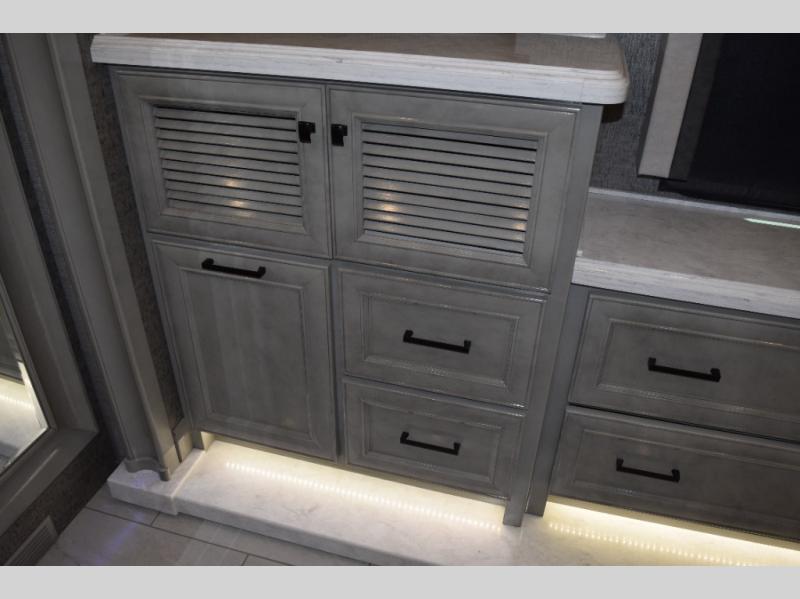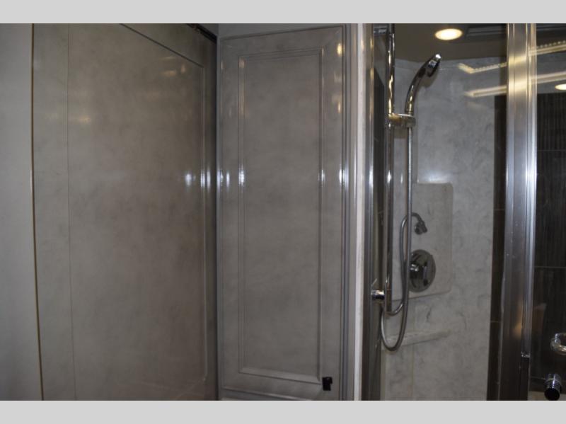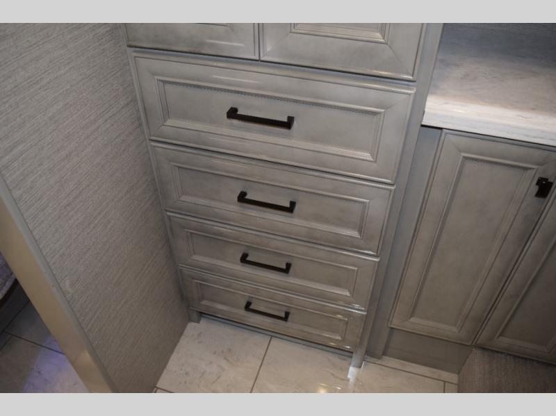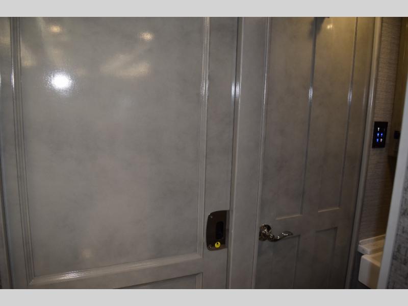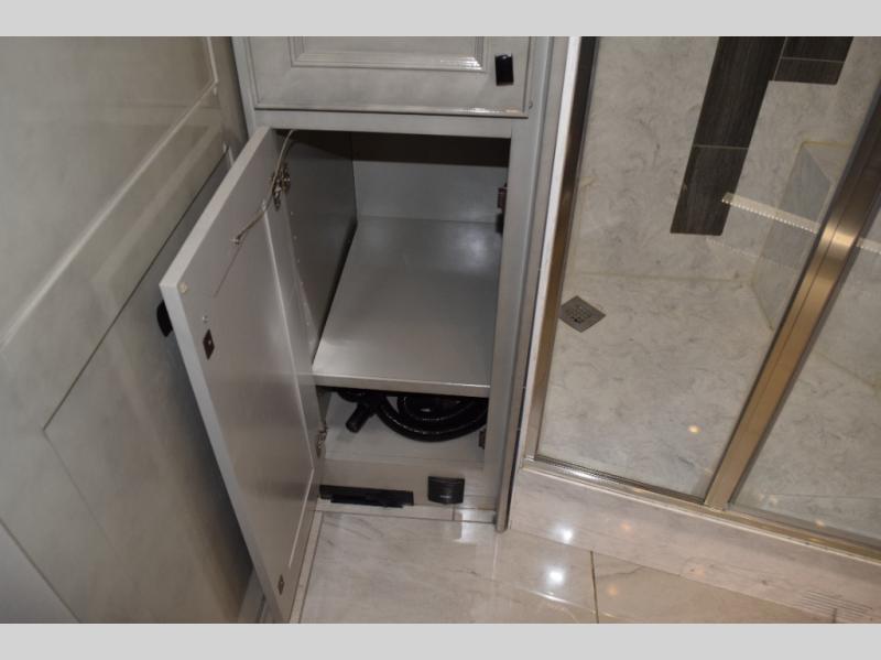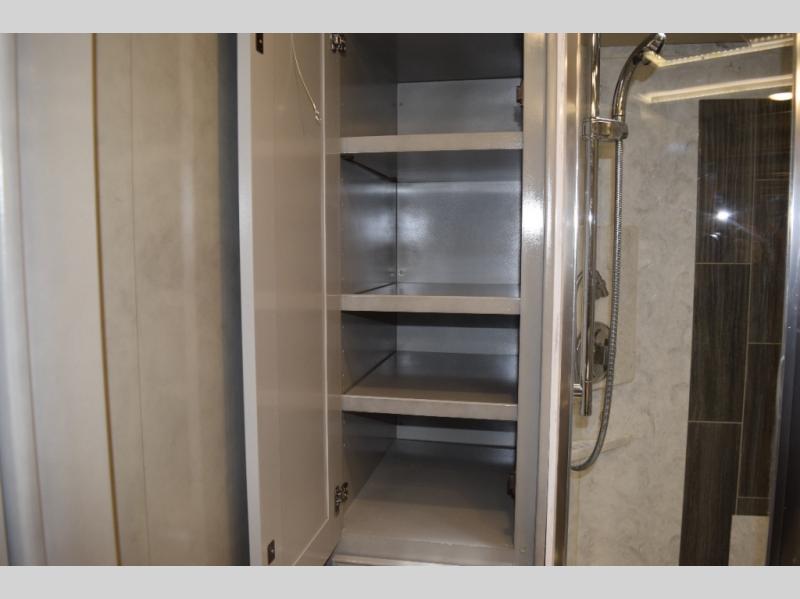 On the outside, the pass-through basement storage and luggage compartment lights make it easy to load up all your gear for long trips. Girard electric door and patio awning set the stage for outdoor relaxation, while the Extraordinaire A/C system keeps things cool, and the hydronic heating system ensures you’re cozy no matter the weather.